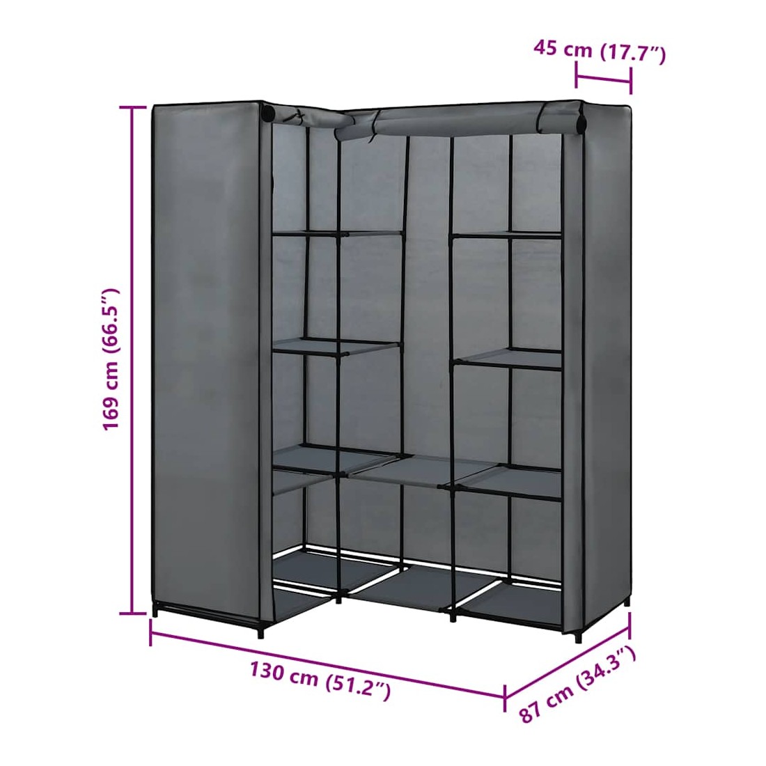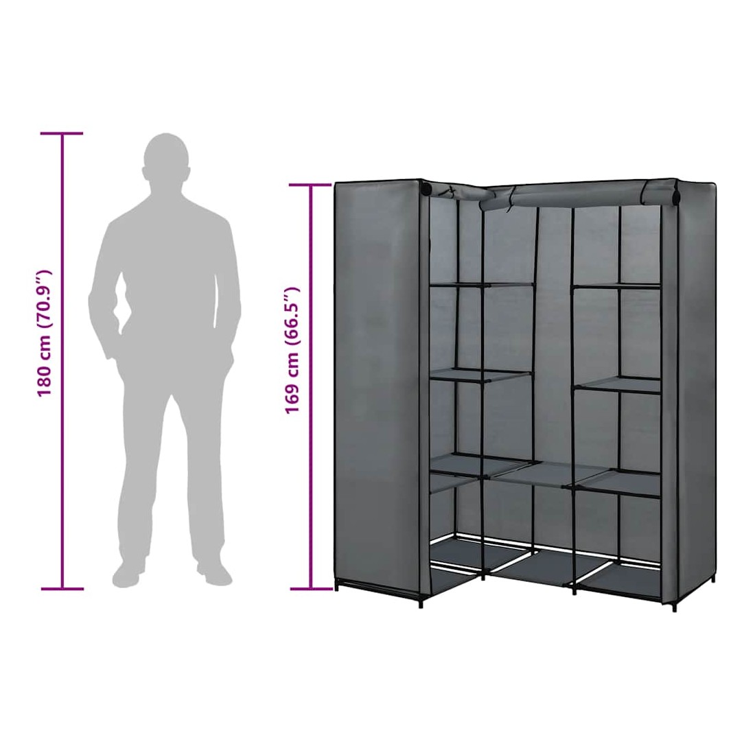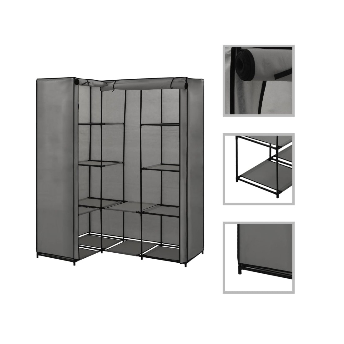 Cette garde-robe d'angle pratique constitue une solution de rangement idéale pour vos vêtements et vos chaussures. Elle se caractérise par un cadre en fer robuste, rendant le porte-vêtements extrêmement durable. Par rapport à un meuble classique, la structure du meuble d'angle est encore plus stable. L'armoire peu encombrante optimise l'utilisation des coins et offre donc un grand espace de rangement et des options de suspension pour garder vos sacs, chaussures et petits objets rangés et à portée de main. La housse en tissu avec fermeture à glissière protégera vos vêtements de la saleté et de la poussière.