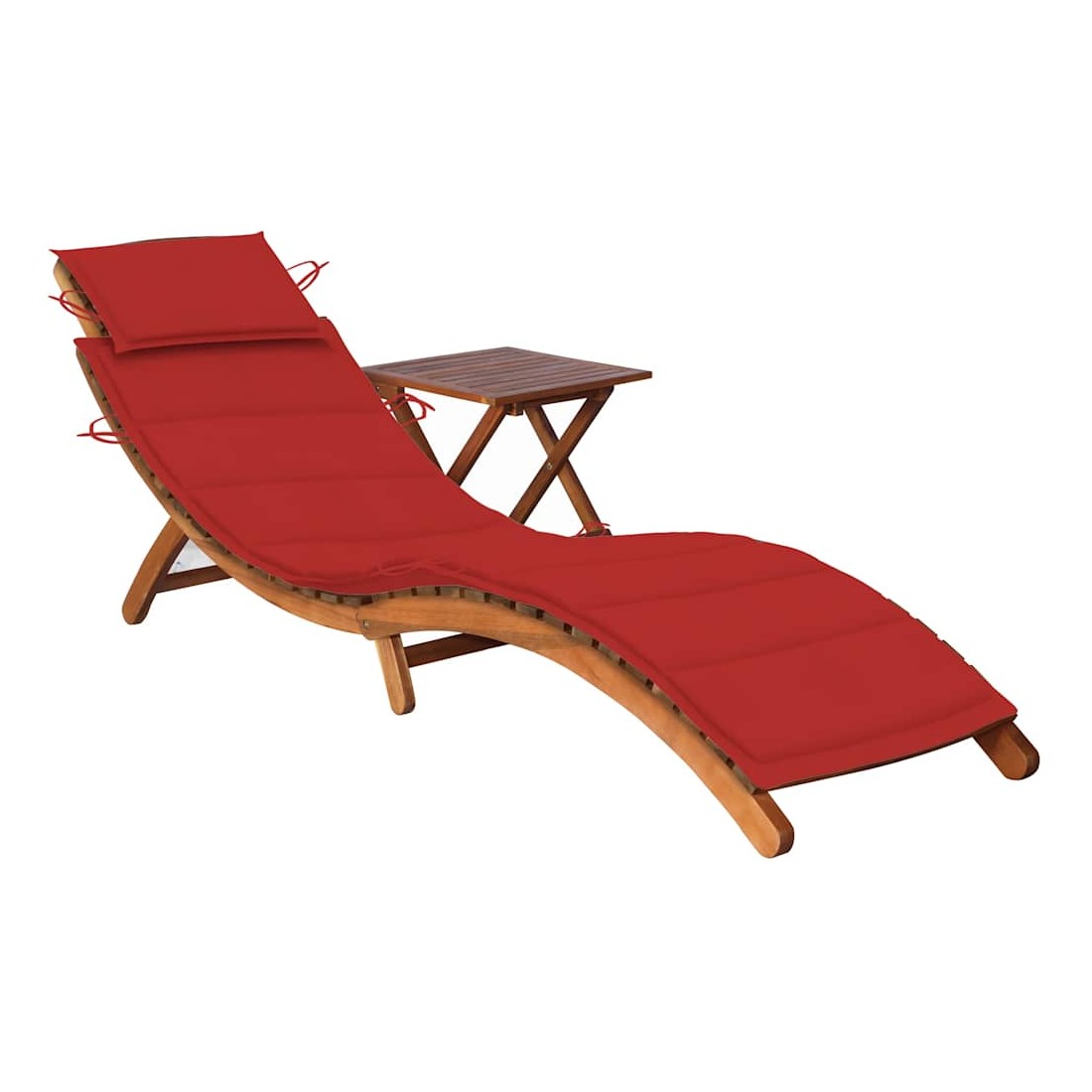 Détendez-vous et reposez-vous dans votre jardin ou sur votre patio sur cette confortable chaise longue en bois ! Vous pouvez passer un après-midi de détente dans votre propre espace extérieur ! Elle est parfaite pour une piscine, un balcon, un jardin, etc. La chaise longue et la table d'extérieur sont fabriquées en bois d’acacia massif, ce qui les rend robustes et stables. Ce lit de repos présente une forme incurvée ergonomique, vous permettant de vous allonger et de vous détendre pleinement. Le transat et la table peuvent être repliés lorsqu'ils ne sont pas utilisés. Le coussin avec appui-tête ajoute un confort supplémentaire pendant que vous vous prélassez. Chaque coussin comprend six ensembles de cordes pour que vous puissiez le fixer fermement sur la chaise longue.