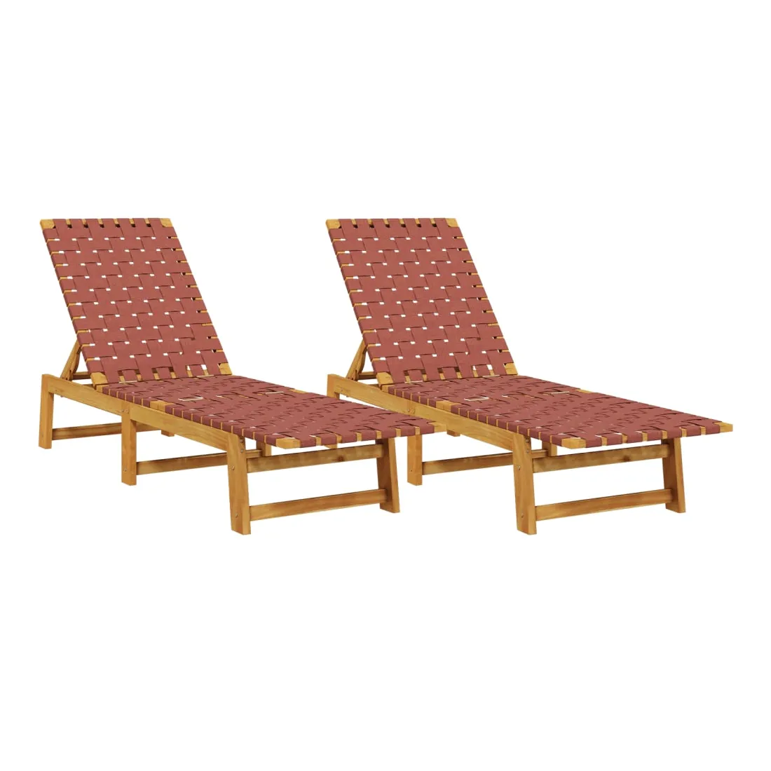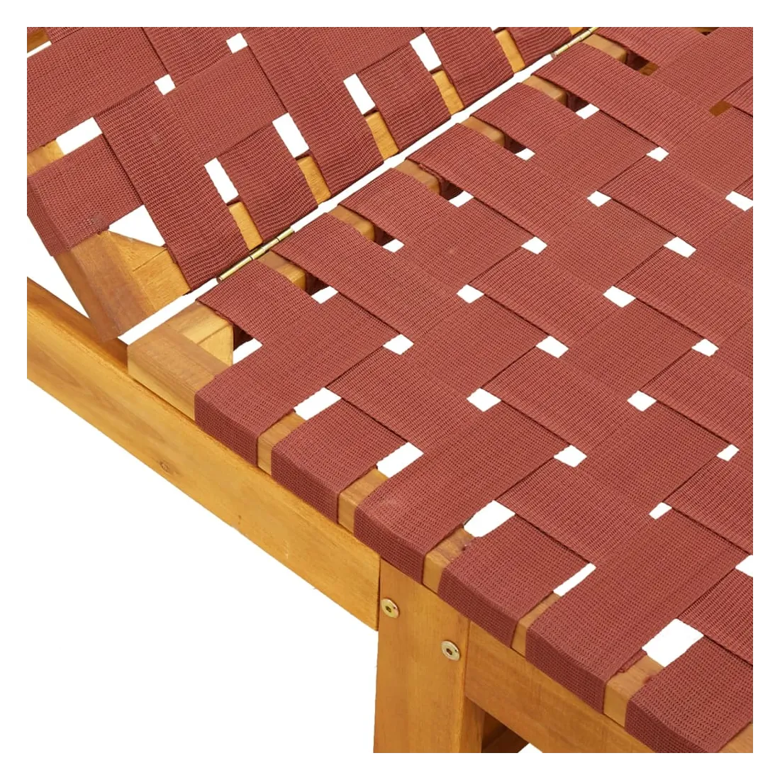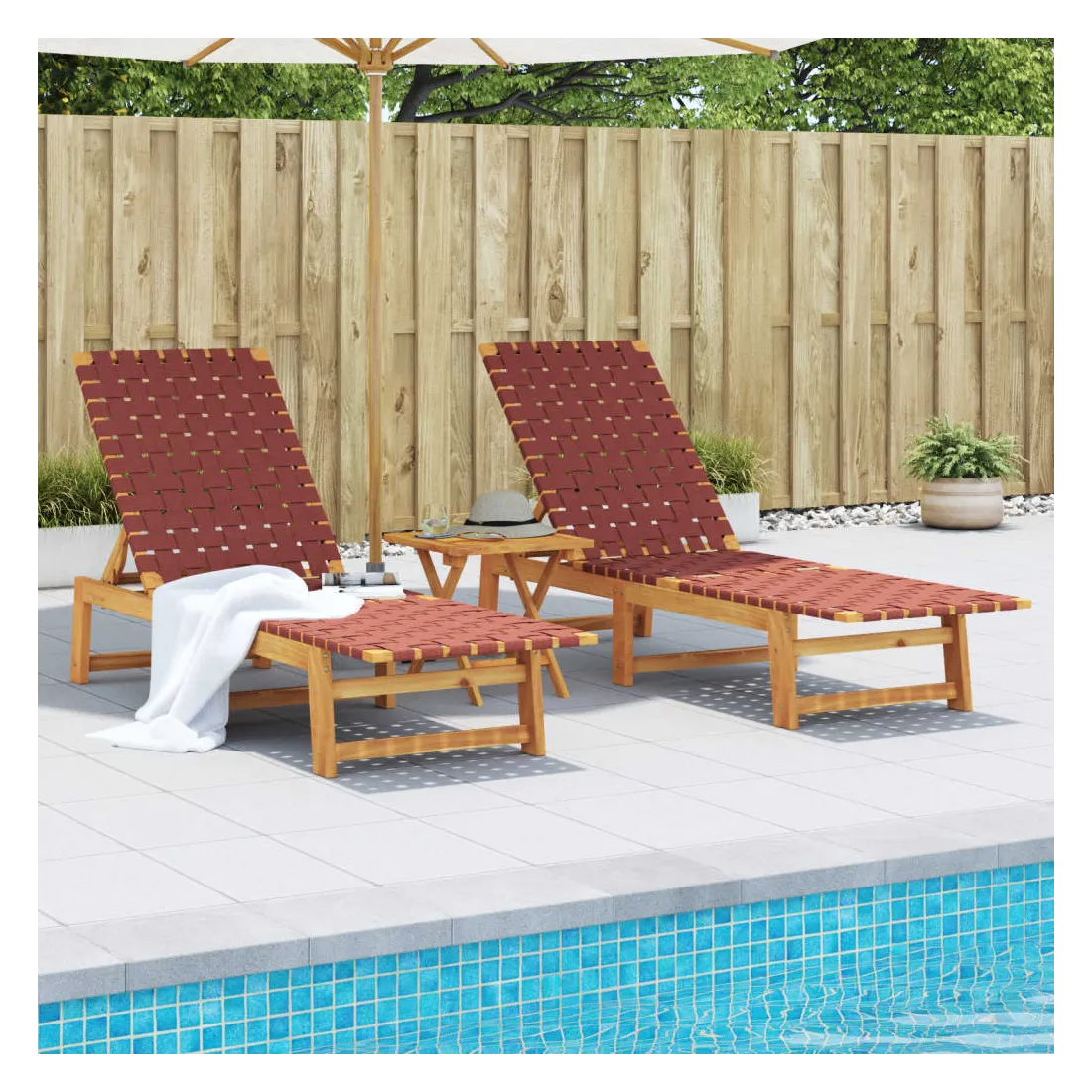 Ces chaises longues classiques sont idéales pour prendre un bain de soleil et vous détendre près de la piscine, sur la terrasse ou dans le jardin. Bois d'acacia massif : le bois d'acacia massif est un matériau naturel magnifique. Le bois d'acacia est un bois dur tropical, dense, robuste et durable. Par conséquent, le cadre de la chaise longue en bois d'acacia à finition à l'huile est stable et facile à entretenir.Matériau durable : la fibre d'oléfine, également connue sous le nom de fibre de polypropylène (PP), est confortable, solide, durable et très résistante à la décoloration par la lumière du soleil.Dossier réglable : la chaise longue confortable dispose d'un dossier inclinable à 4 positions pour une relaxation optimale.Conception de sangles : l'assise et le dossier de la chaise longue de jardin sont conçus avec des sangles pour plus de confort, d'élégance et de respirabilité. Bon à savoir :Pour que vos meubles d'extérieur restent beaux, nous vous recommandons de les protéger avec une housse imperméable.