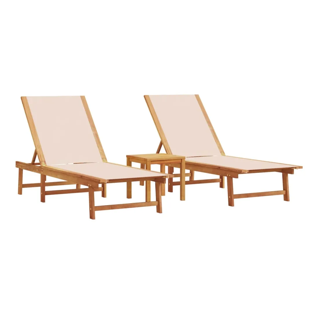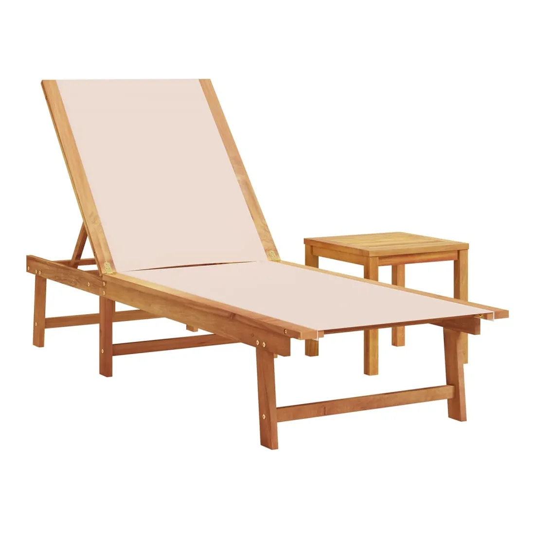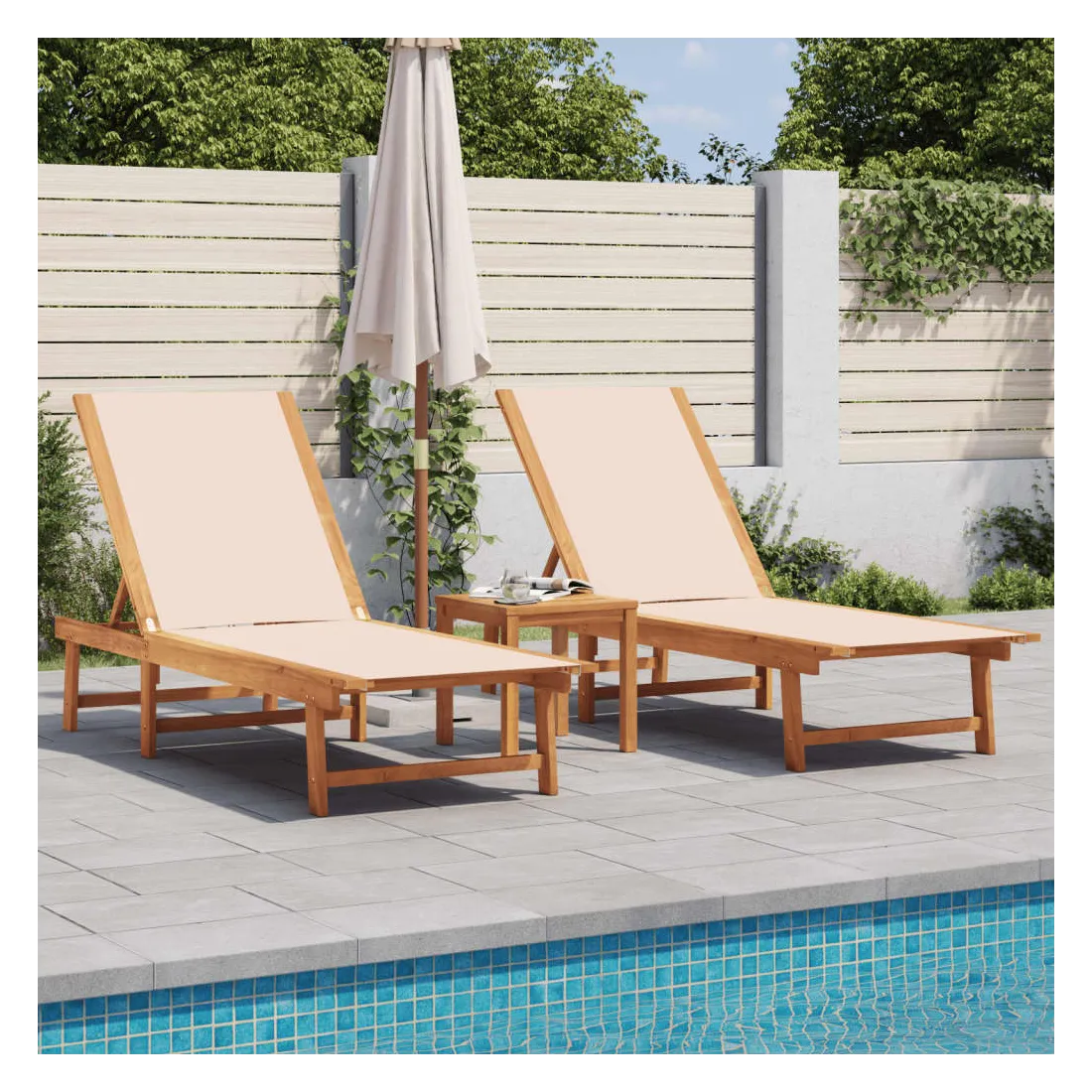Ces chaises longues classiques avec table d'appoint sont idéales pour prendre un bain de soleil et vous détendre près de la piscine, sur la terrasse ou dans le jardin. Robuste et stable : le bois d'acacia massif est connu pour sa solidité et sa durabilité. Ses couleurs variées et ses grains uniques lui confèrent un aspect attrayant. Sa stabilité et sa résistance aux intempéries en font un matériau idéal pour la fabrication de meubles d'intérieur et d'extérieur.Durable et longue durée de vie : le tissu textilène est apprécié pour sa durabilité, résistance à l'eau et à la décoloration, facilité d'entretien et protection contre les rayons UV et la moisissure, ce qui en fait un choix idéal pour le meuble d'extérieur et les structures d'ombrage.Dossier réglables : ce transat est doté d'un dossier à 5 positions réglables, ce qui vous permet de trouver facilement la position la plus confortable et la plus appropriée pour la détente.Table d'appoint pratique : ce mobilier d'extérieur comprend une table d'appoint, offrant un endroit pratique pour garder vos essentiels à portée de main. Bon à savoir :Pour que vos meubles d'extérieur restent beaux, nous vous recommandons de les protéger avec une housse imperméable.