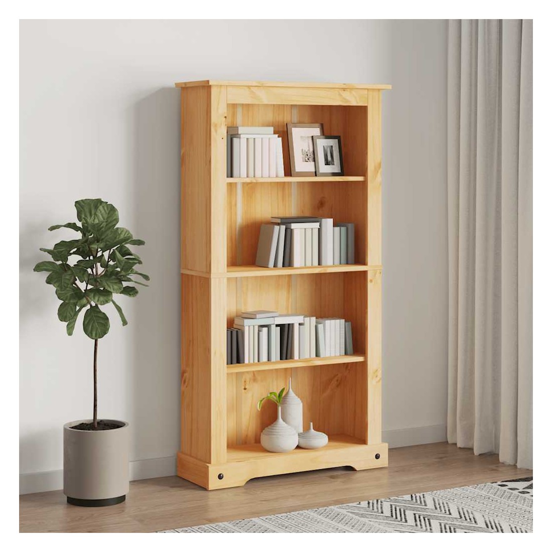 Cette bibliothèque en bois de haute qualité dégage un charme mexicain rustique qui en fera un supplément intemporel à votre bureau ou à votre salon. Cette élégante bibliothèque est fabriquée à partir de bois de pin de haute qualité, ce qui la rend résistante à l'usure. La bibliothèque en bois robuste nécessite un entretien minimal, et les beaux grains de bois lui confèrent un charme rustique. La bibliothèque a 4 étagères, offrant amplement d'espace pour ranger votre collection de livres, magazines et documents dans l'ordre. Avec un design simple mais intemporel, la bibliothèque peut également être utilisée pour afficher des bibelots, des albums photo, etc. L'assemblage est facile.