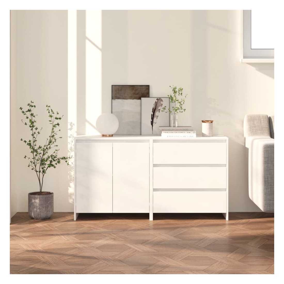 Ces buffets constituent un supplément décoratif et pratique parfait à votre décoration existante. Ces armoires latérales offrent un grand espace de rangement pour garder vos objets quotidiens organisés et à portée de main. Le dessus robuste est parfait pour exposer des objets décoratifs, des cadres photo et des plantes en pot. De plus, ces armoires de rangement sont faciles à nettoyer avec un chiffon humide.