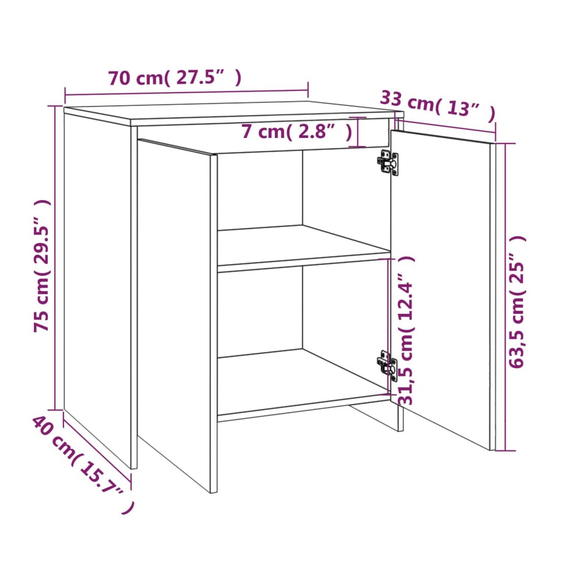 - Dimensions du buffet avec 2 portes : 70 x 40 x 75 cm (l x P x H)