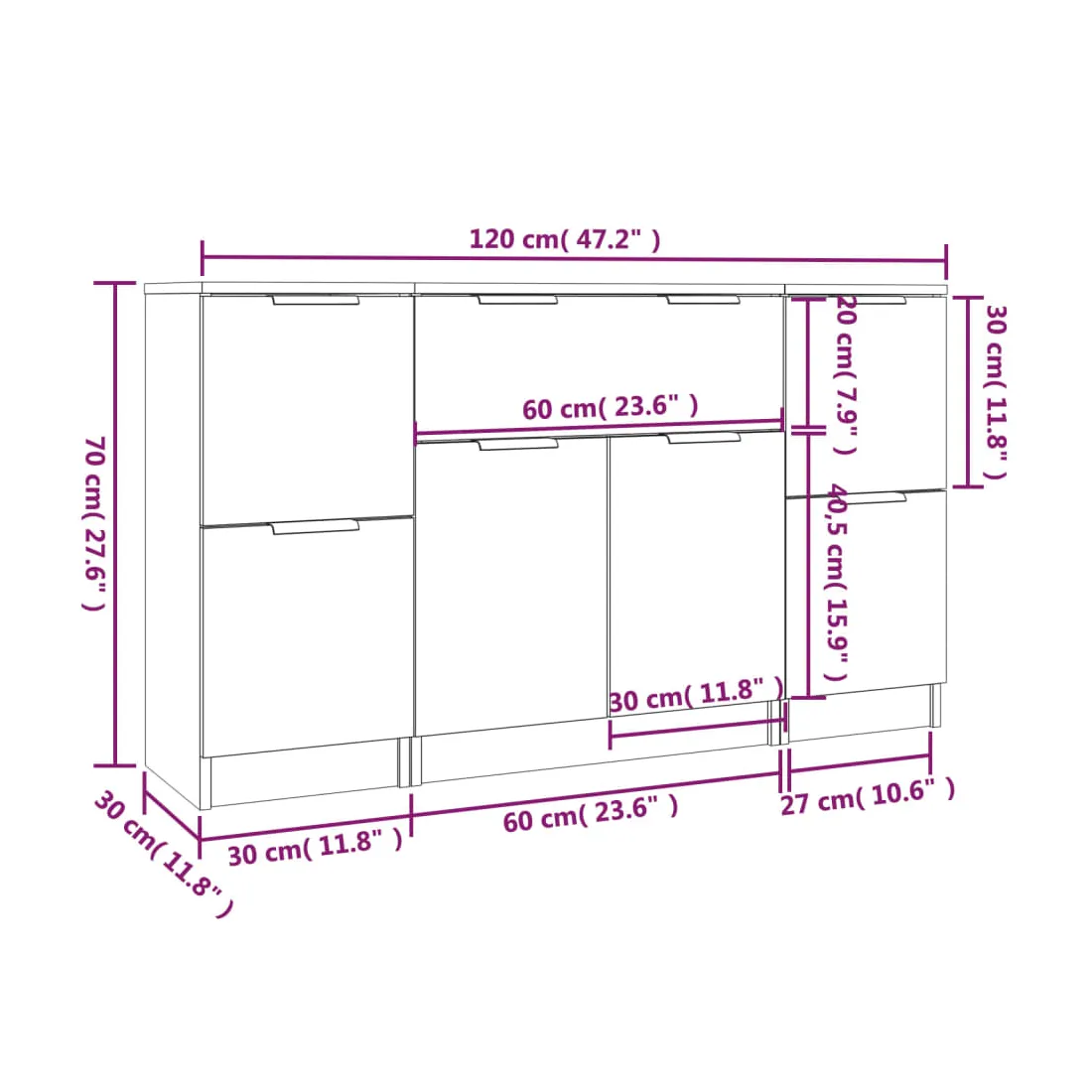 - Dimensions (buffet avec un tiroir) : 60 x 30 x 70 cm (l x P x H)