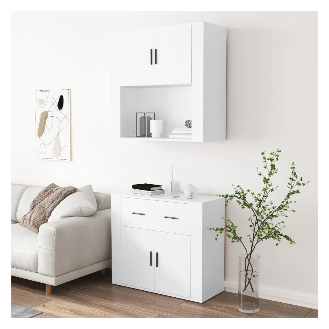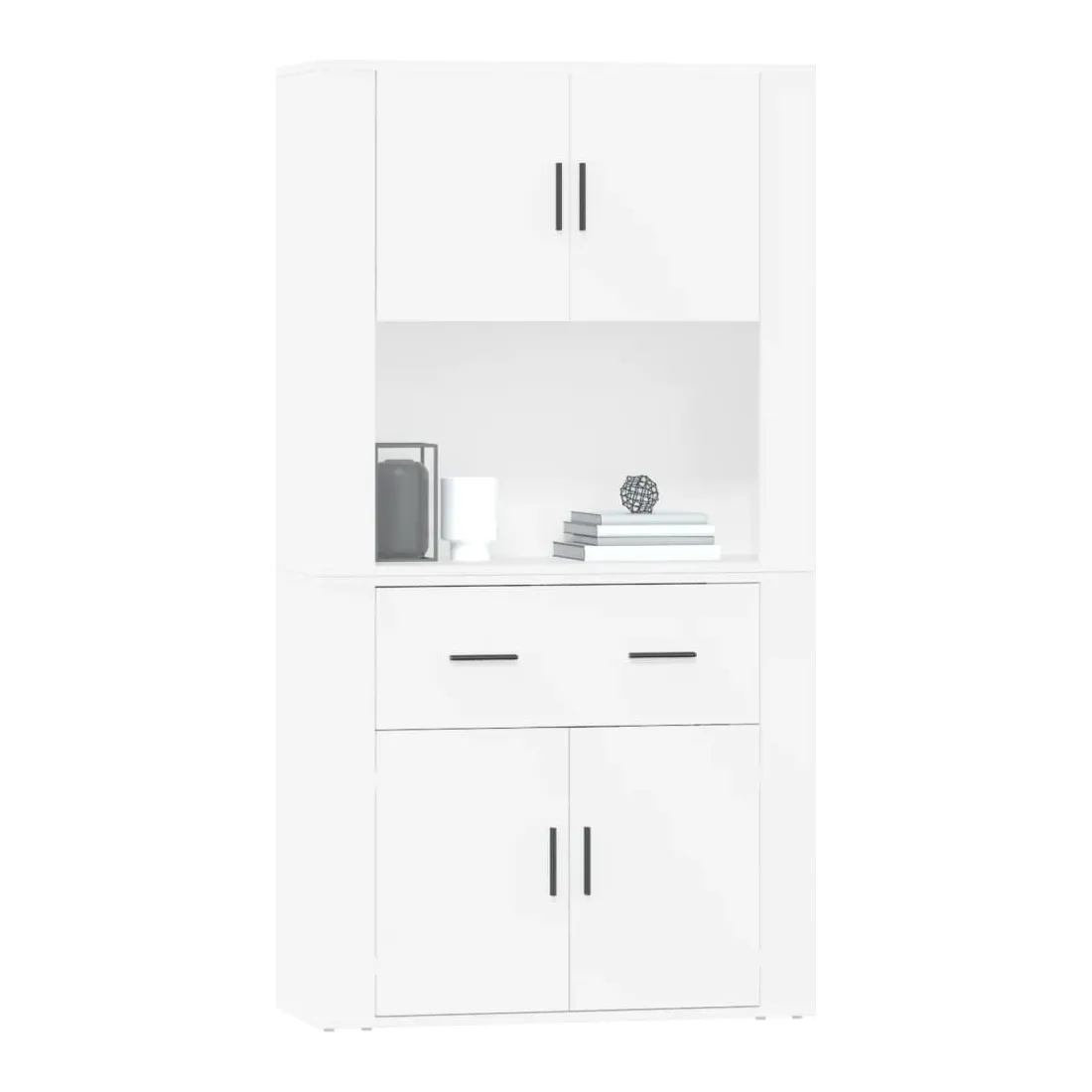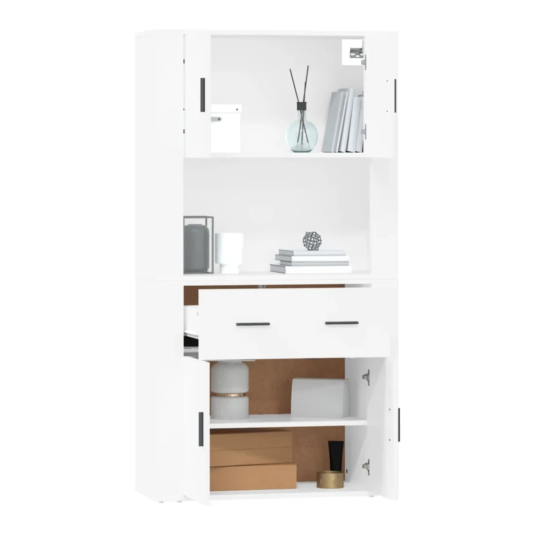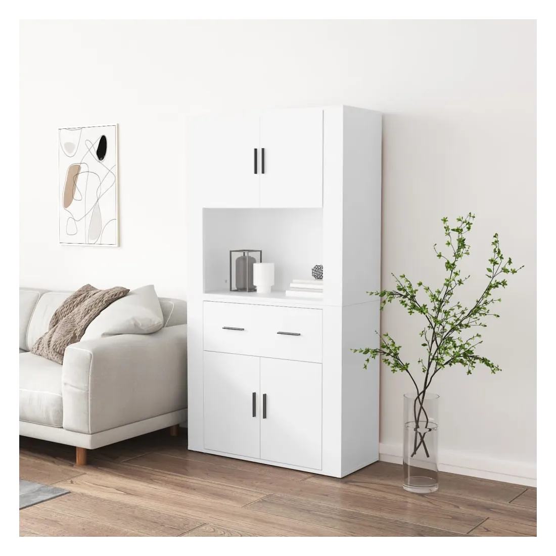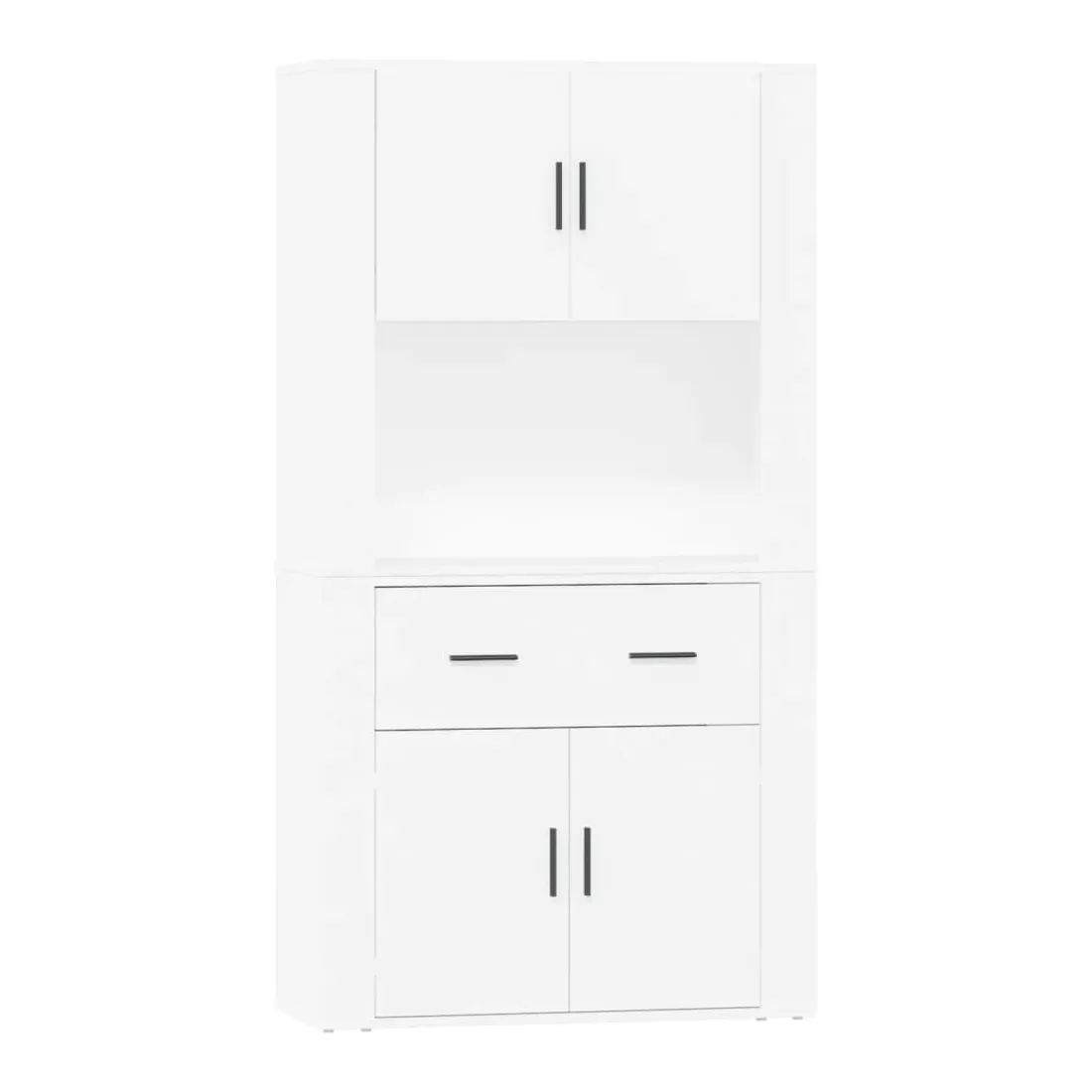 Cherchez-vous un buffet haut de gamme stylé ? Ce buffet haut ajoute un charme unique à votre intérieur existant ! Matériau durable : le bois d'ingénierie est d'une qualité exceptionnelle avec une surface lisse et présente également résistance, stabilité et résistance à l'humidité.Grand espace de rangement : le buffet offre un grand espace de rangement pour garder vos différents articles essentiels quotidiens bien organisés et facilement accessibles.Fonction murale : le meuble de rangement peut être fixé au mur sur le dessus du buffet pour créer un buffet haut, ce qui permet de gagner de l'espace au sol. Ainsi, vous pouvez maximiser votre espace de vie et garder la zone propre et bien rangée. Bon à savoir :Pour faciliter au maximum le montage, chaque produit est livré avec des instructions.Les vis et les chevilles pour l'intérieur du mur ne sont pas incluses. Nous vous conseillons de trouver et d'utiliser des vis et des chevilles adaptées spécifiquement à vos murs. Si vous n'êtes pas sûr, vous pouvez consulter un professionnel. Veuillez lire et suivre chaque étape des instructions. Attention :Pour éviter qu'il ne soit renversé, ce produit doit être utilisé avec le dispositif de fixation au mur fourni.