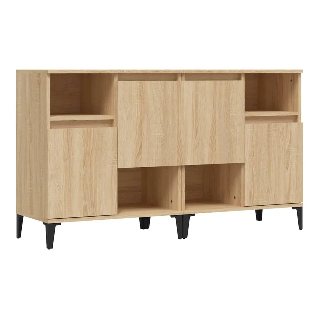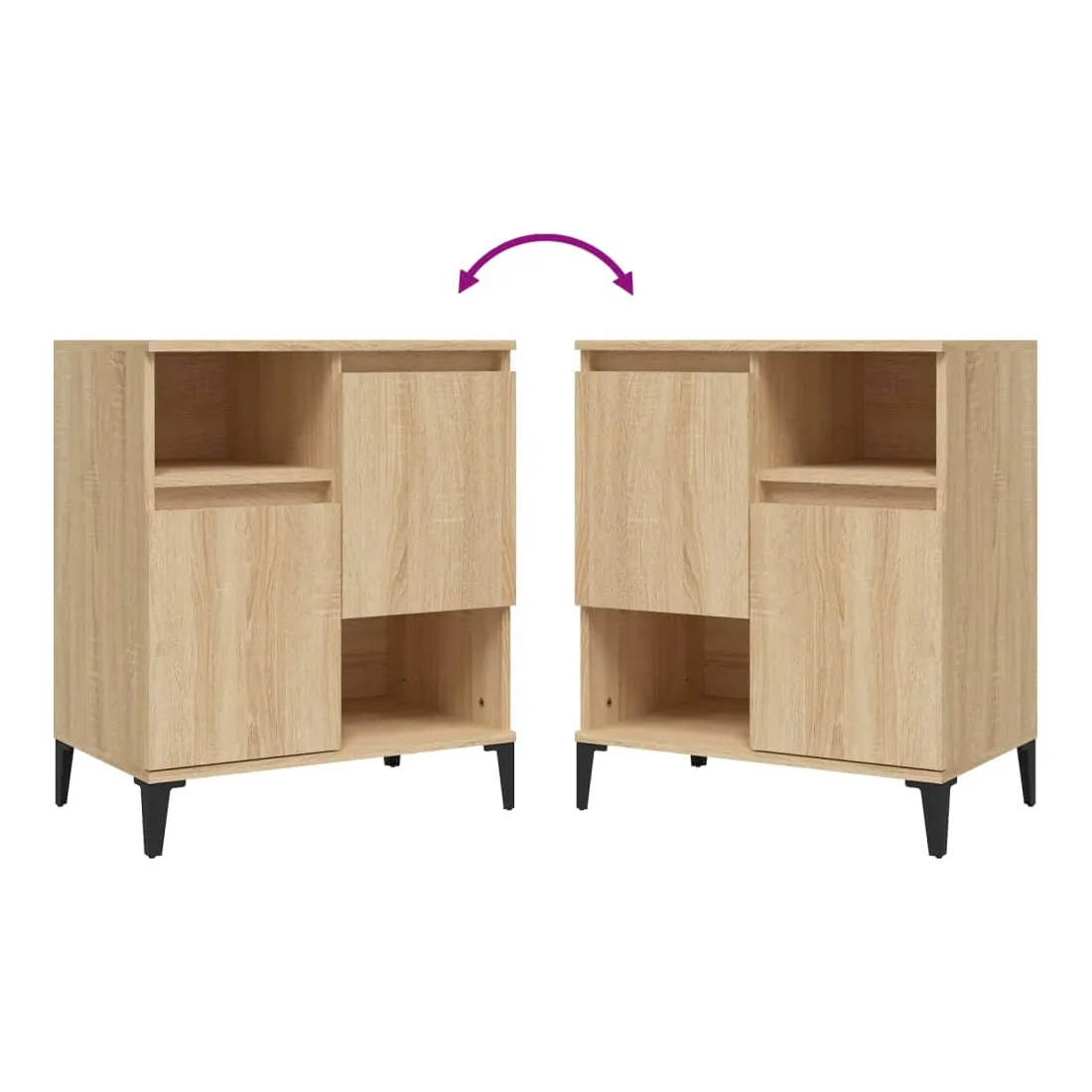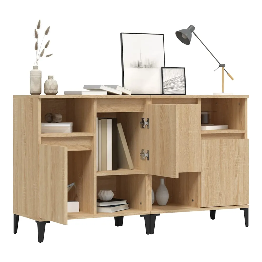 Ces buffets classiques, au look intemporel, sont conçus pour être un excellent supplément à votre maison. Matériau durable : le bois d'ingénierie est d'une qualité exceptionnelle avec une surface lisse et présente également résistance, stabilité et résistance à l'humidité. Fabriquée en bois d'ingénierie, l'armoire est facile à nettoyer avec un chiffon humide.Grand espace de rangement : équipé de 4 compartiments, le meuble buffet offre un grand espace de rangement pour garder vos différents articles essentiels quotidiens bien organisés et facilement accessibles.Fonction d'affichage : le dessus du placard est idéal pour exposer vos objets décoratifs, albums photo ou petites plantes. Bon à savoir :Les portes peuvent être installées de deux manières. Attention :Pour éviter qu'il ne soit renversé, ce produit doit être utilisé avec le dispositif de fixation au mur fourni.