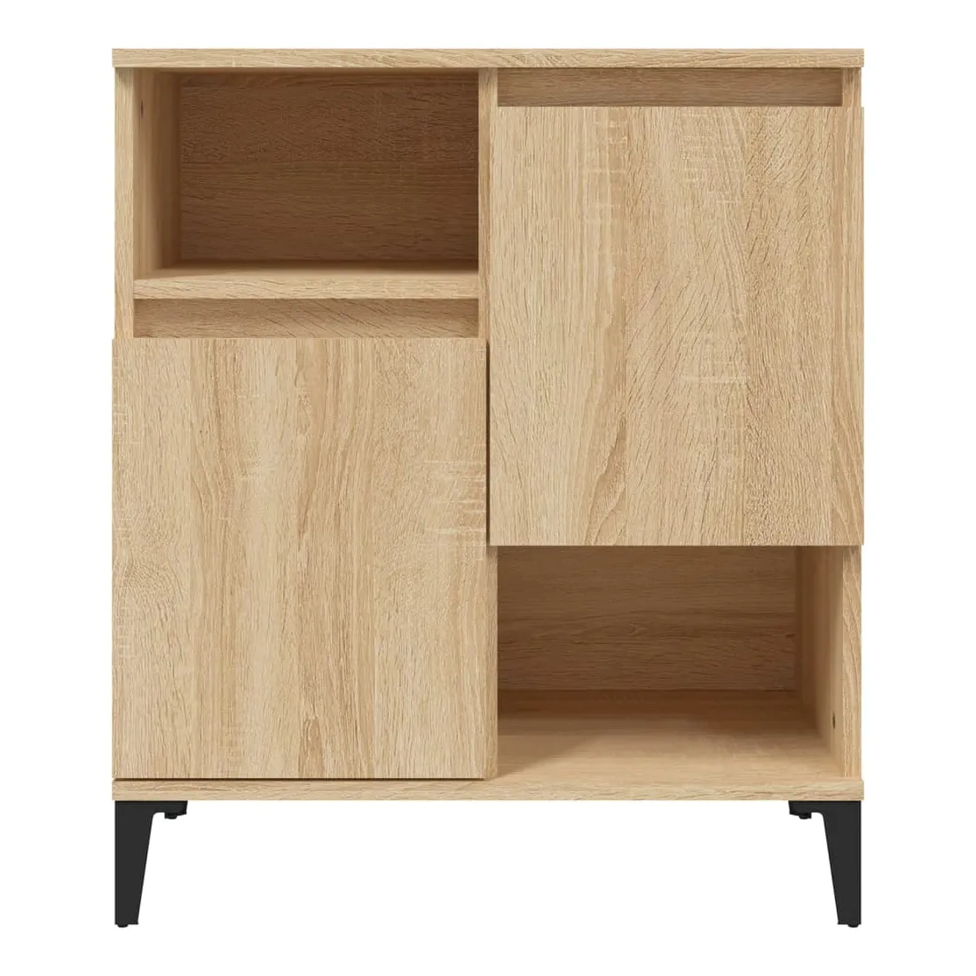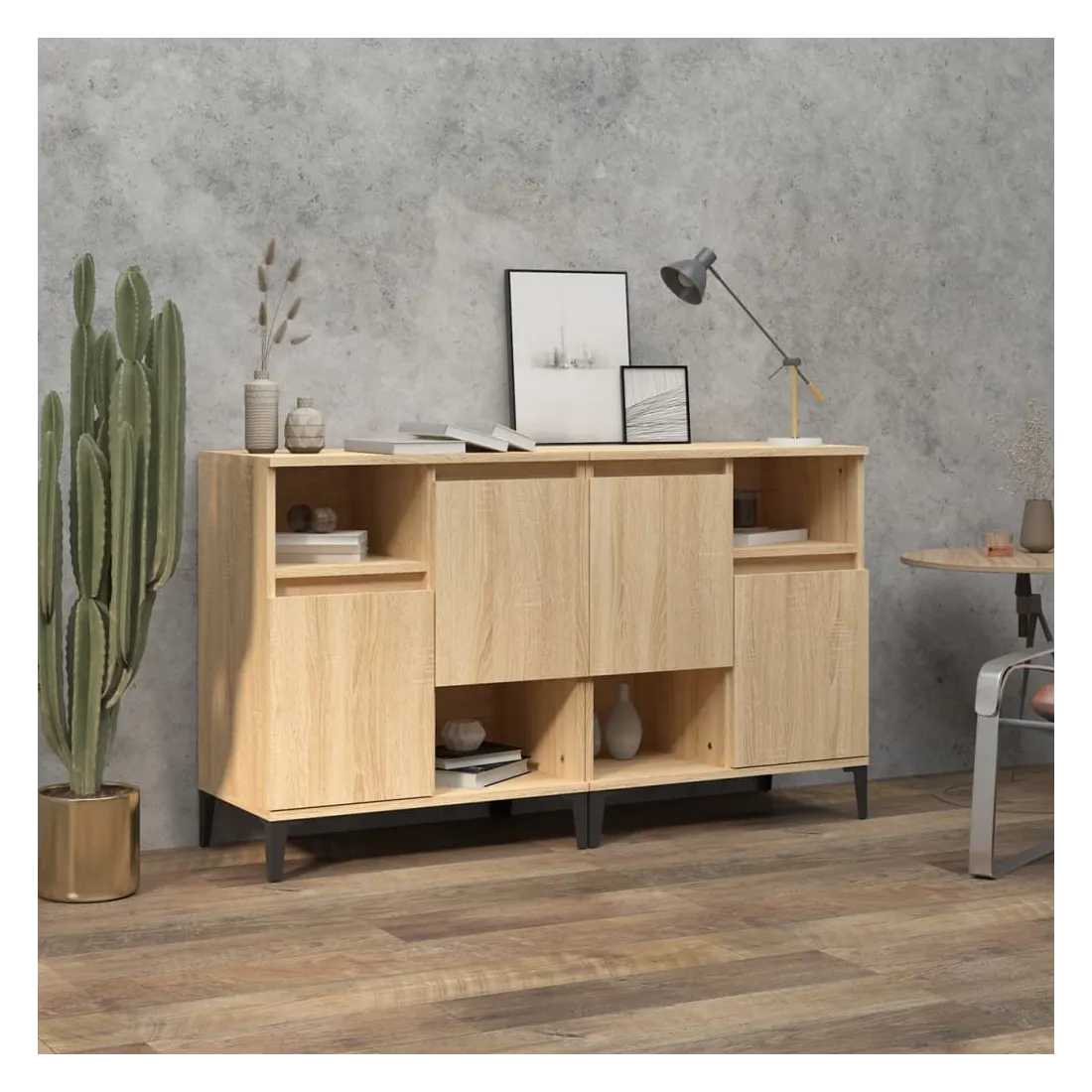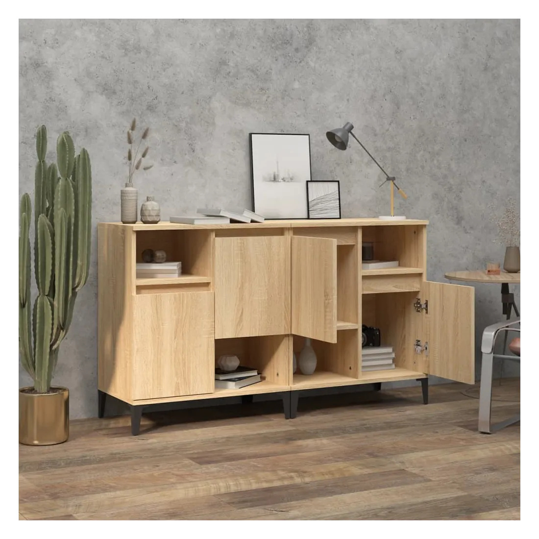 Ces buffets classiques, au look intemporel, sont conçus pour être un excellent supplément à votre maison. Matériau durable : le bois d'ingénierie est d'une qualité exceptionnelle avec une surface lisse et présente également résistance, stabilité et résistance à l'humidité. Fabriquée en bois d'ingénierie, l'armoire est facile à nettoyer avec un chiffon humide.Grand espace de rangement : équipé de 4 compartiments, le meuble buffet offre un grand espace de rangement pour garder vos différents articles essentiels quotidiens bien organisés et facilement accessibles.Fonction d'affichage : le dessus du placard est idéal pour exposer vos objets décoratifs, albums photo ou petites plantes. Bon à savoir :Les portes peuvent être installées de deux manières. Attention :Pour éviter qu'il ne soit renversé, ce produit doit être utilisé avec le dispositif de fixation au mur fourni.