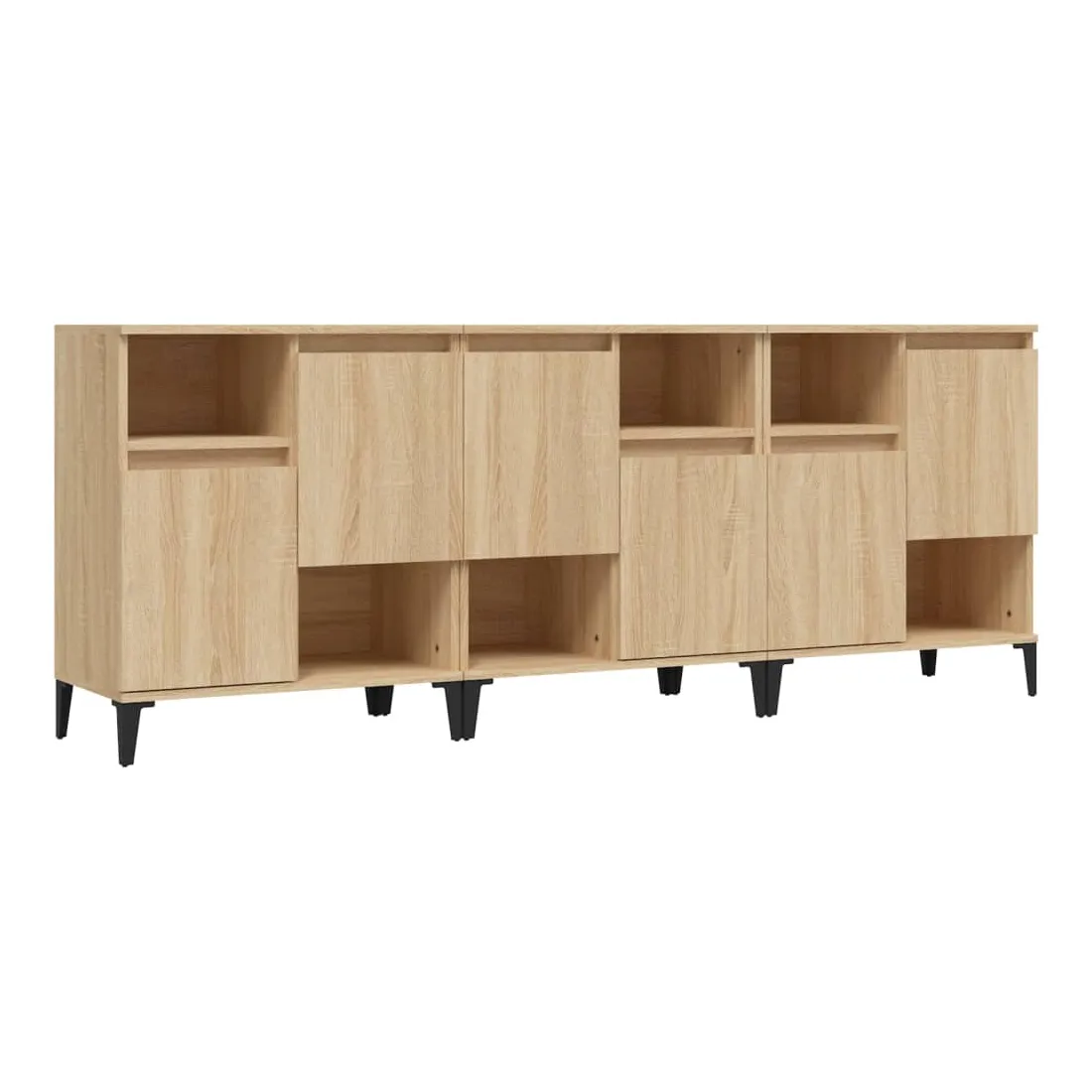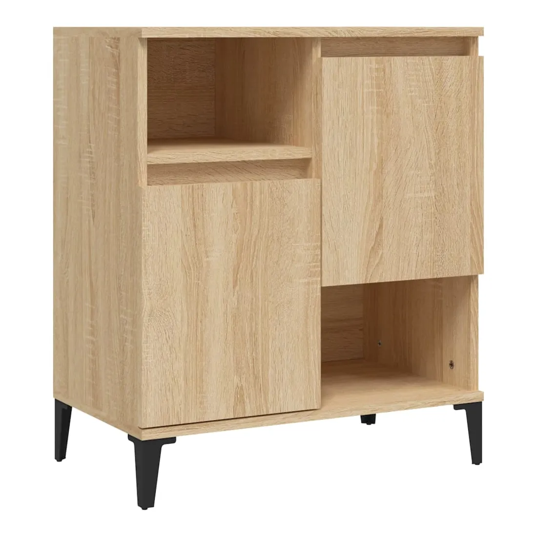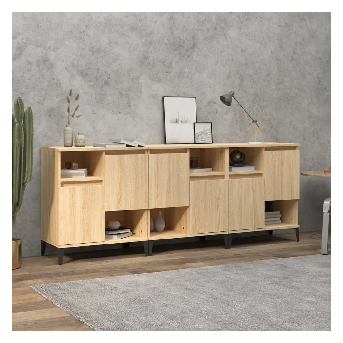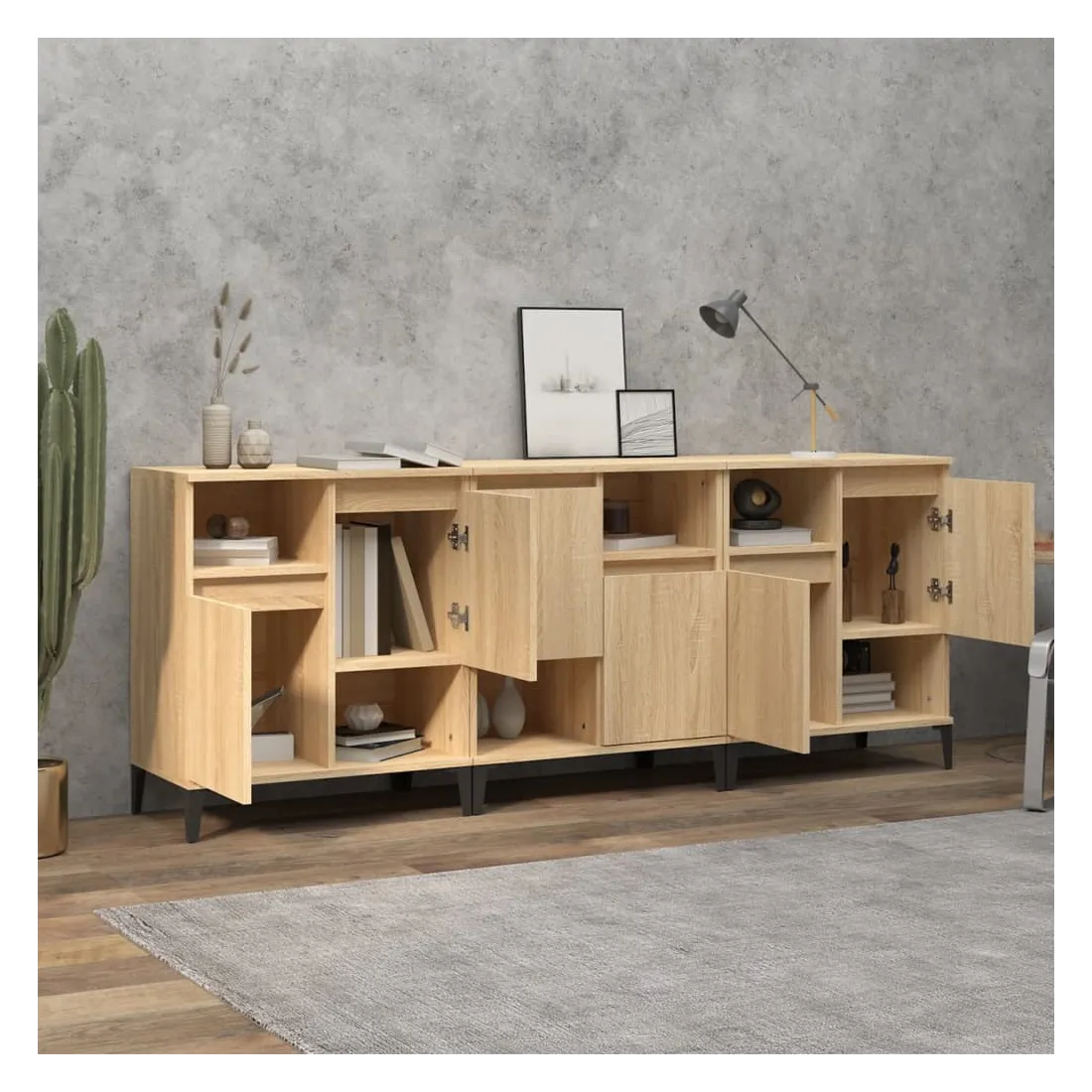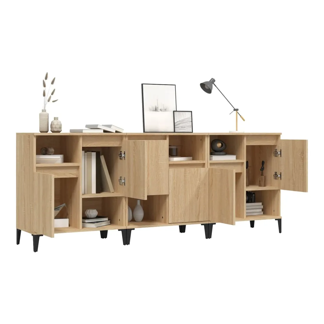 Ces buffets classiques, au look intemporel, sont conçus pour être un excellent supplément à votre maison. Matériau durable : le bois d'ingénierie est d'une qualité exceptionnelle avec une surface lisse et présente également résistance, stabilité et résistance à l'humidité. Fabriquée en bois d'ingénierie, l'armoire est facile à nettoyer avec un chiffon humide.Grand espace de rangement : équipé de 4 compartiments, le meuble buffet offre un grand espace de rangement pour garder vos différents articles essentiels quotidiens bien organisés et facilement accessibles.Fonction d'affichage : le dessus du placard est idéal pour exposer vos objets décoratifs, albums photo ou petites plantes. Bon à savoir :Les portes peuvent être installées de deux manières. Attention :Pour éviter qu'il ne soit renversé, ce produit doit être utilisé avec le dispositif de fixation au mur fourni.