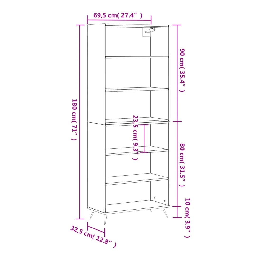 - Dimensions totales : 69,5 x 32,5 x 180 cm (l x P x H)
