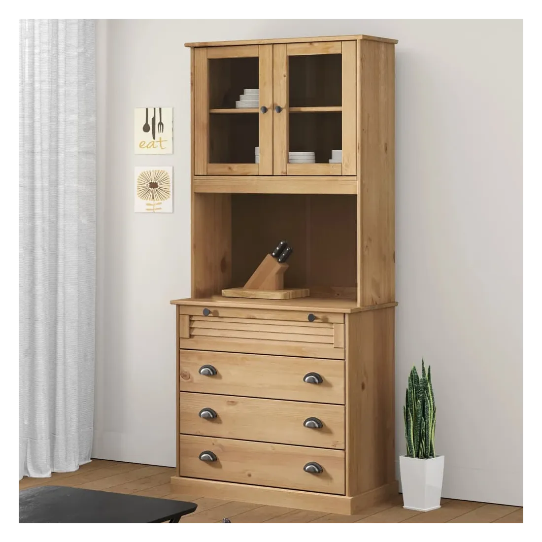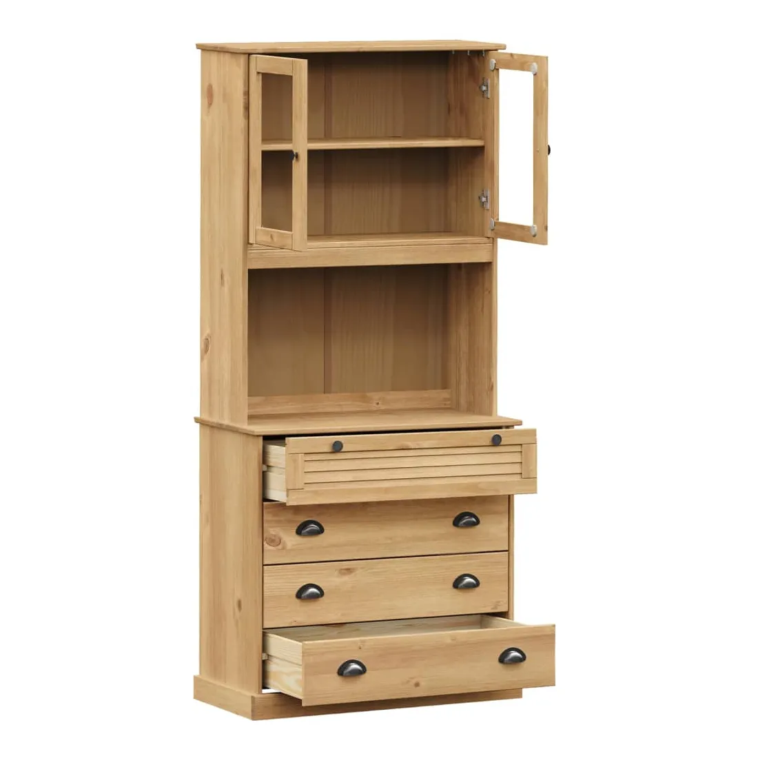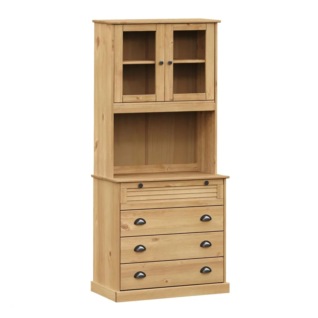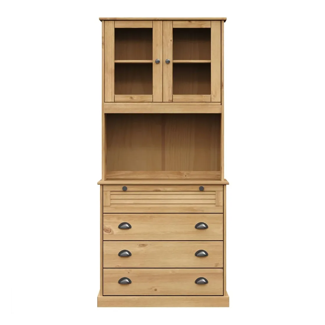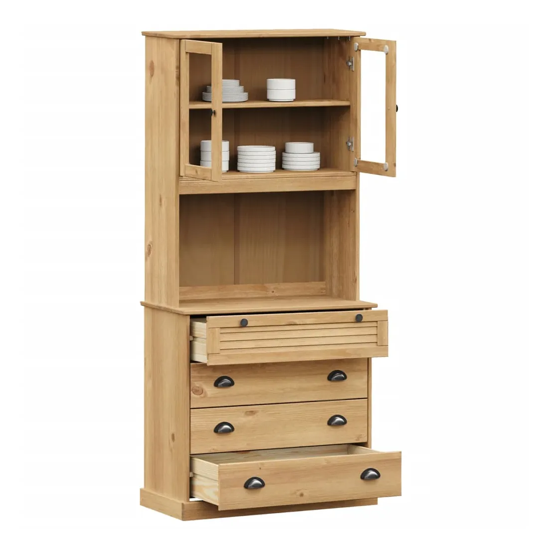 vidaXLCherchez-vous un buffet haut de gamme stylé ? Ce buffet haut ajoute un charme élégant à votre intérieur existant ! Bois de pin massif : le bois de pin massif est un beau matériau naturel. Le bois de pin a un grain droit et les nœuds lui confèrent son aspect rustique caractéristique. Fabriqué en pin massif, le buffet est durable et robuste.Grand espace de rangement : l'armoire dispose de tiroirs et de compartiments, offrant suffisamment d'espace pour garder votre collection de tasses, plats et petits objets décoratifs en bon ordre.Portes en verre : les portes de ce plan de travail en bois sont plus robustes et plus sûres grâce à leur verre trempé poli. Elles permettent également de voir à l'intérieur de la moitié supérieure et d'exposer les objets de manière élégante.Facile à entretenir : le buffet est facile à nettoyer à l'aide d'un chiffon humide et nécessite peu d'entretien.Poignées et boutons en métal : l'armoire haute est équipée de poignées et de boutons en métal qui facilitent l'ouverture et la fermeture de l'armoire, tout en lui conférant une beauté supplémentaire. Attention :Pour éviter qu'il ne soit renversé, ce produit doit être utilisé avec le dispositif de fixation au mur fourni.