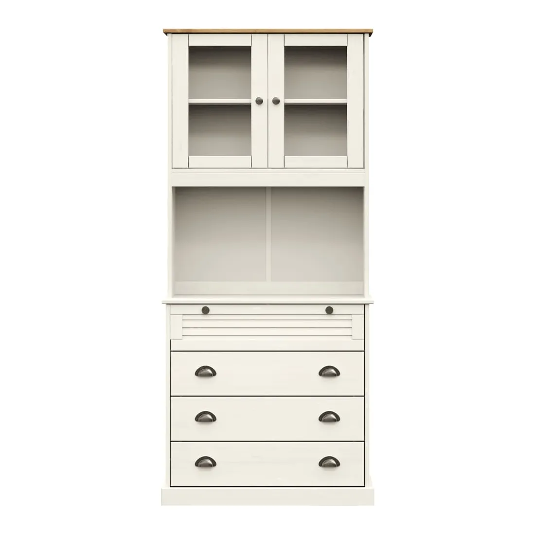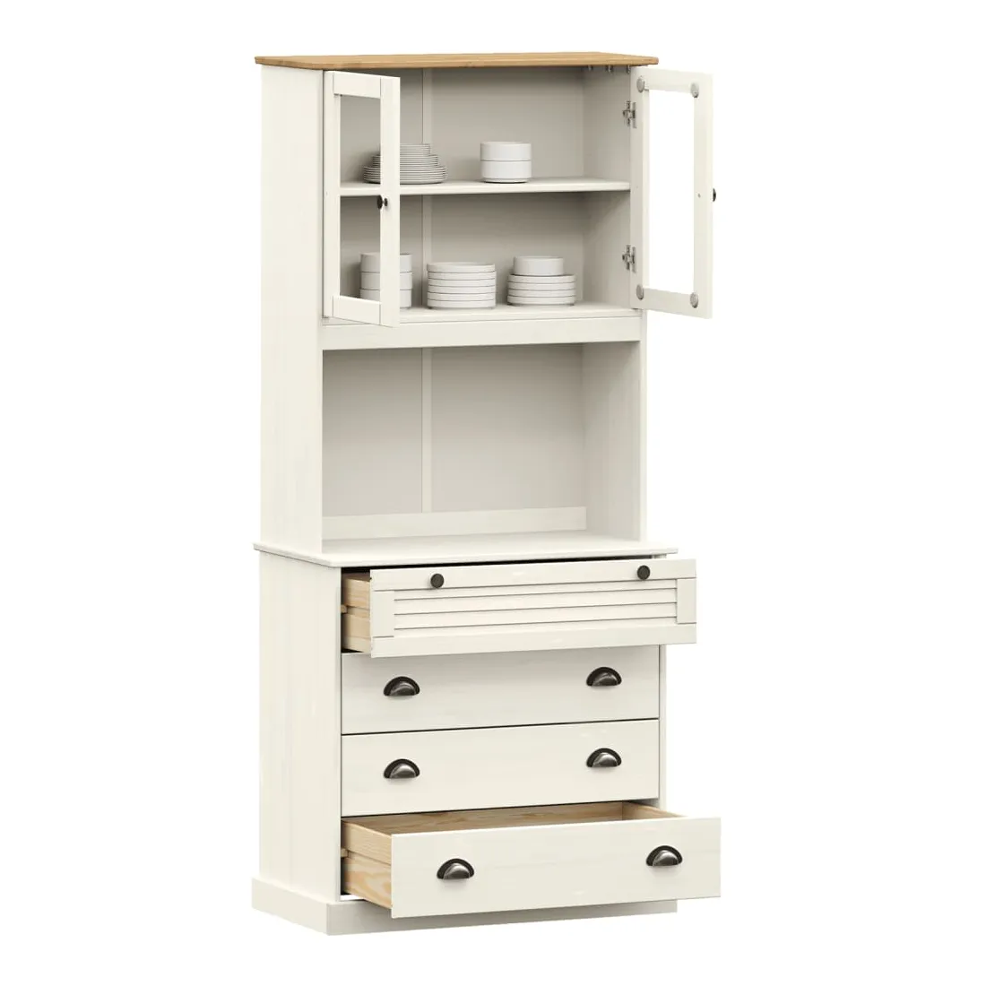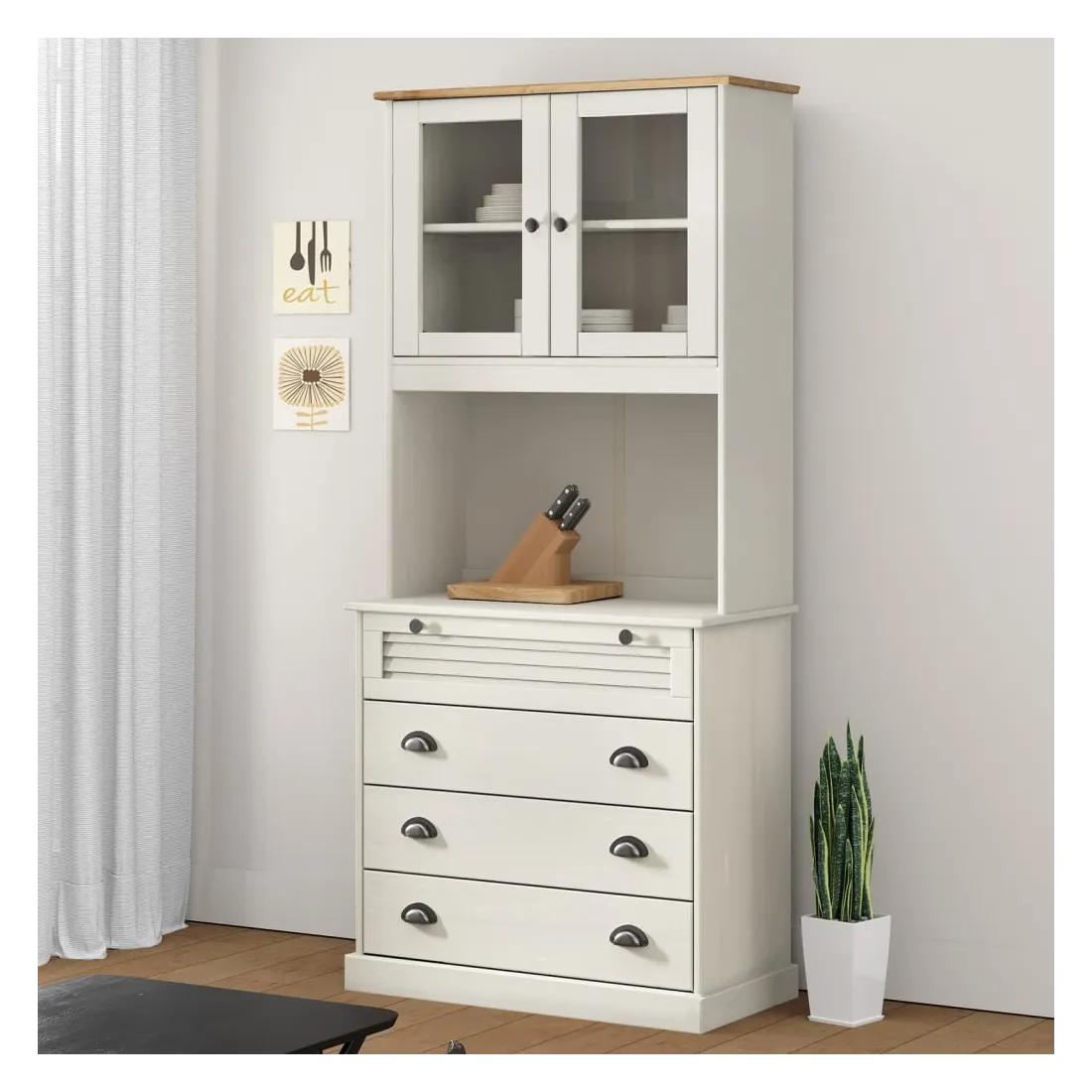 Cherchez-vous un buffet haut de gamme stylé ? Ce buffet haut ajoute un charme élégant à votre intérieur existant ! Bois de pin massif : le bois de pin massif est un beau matériau naturel. Le bois de pin a un grain droit et les nœuds lui confèrent son aspect rustique caractéristique. Fabriqué en pin massif, le buffet est durable et robuste.Grand espace de rangement : l'armoire dispose de tiroirs et de compartiments, offrant suffisamment d'espace pour garder votre collection de tasses, plats et petits objets décoratifs en bon ordre.Portes en verre : les portes de ce plan de travail en bois sont plus robustes et plus sûres grâce à leur verre trempé poli. Elles permettent également de voir à l'intérieur de la moitié supérieure et d'exposer les objets de manière élégante.Facile à entretenir : le buffet est facile à nettoyer à l'aide d'un chiffon humide et nécessite peu d'entretien.Poignées et boutons en métal : l'armoire haute est équipée de poignées et de boutons en métal qui facilitent l'ouverture et la fermeture de l'armoire, tout en lui conférant une beauté supplémentaire. Attention :Pour éviter qu'il ne soit renversé, ce produit doit être utilisé avec le dispositif de fixation au mur fourni.