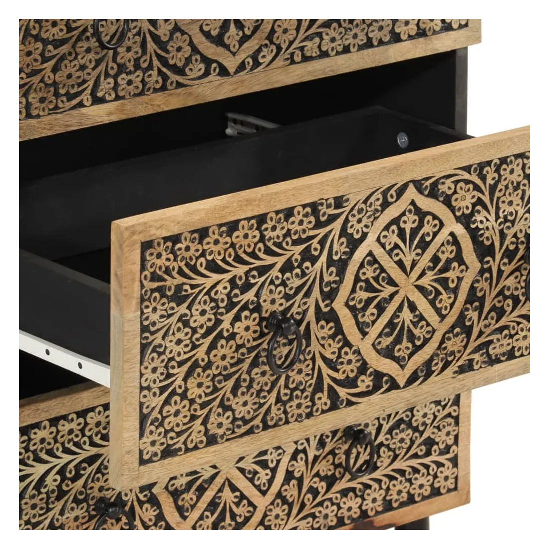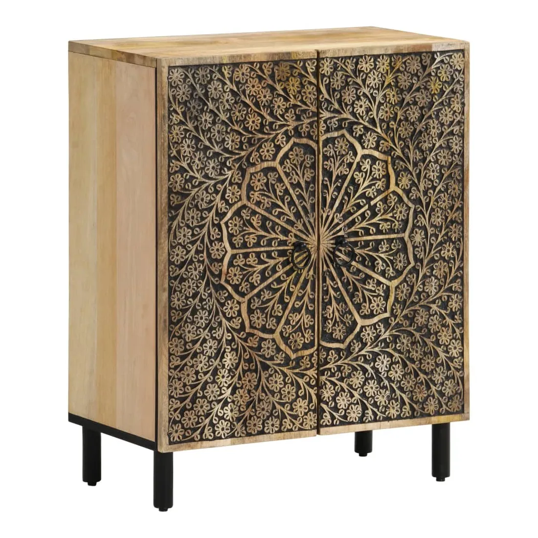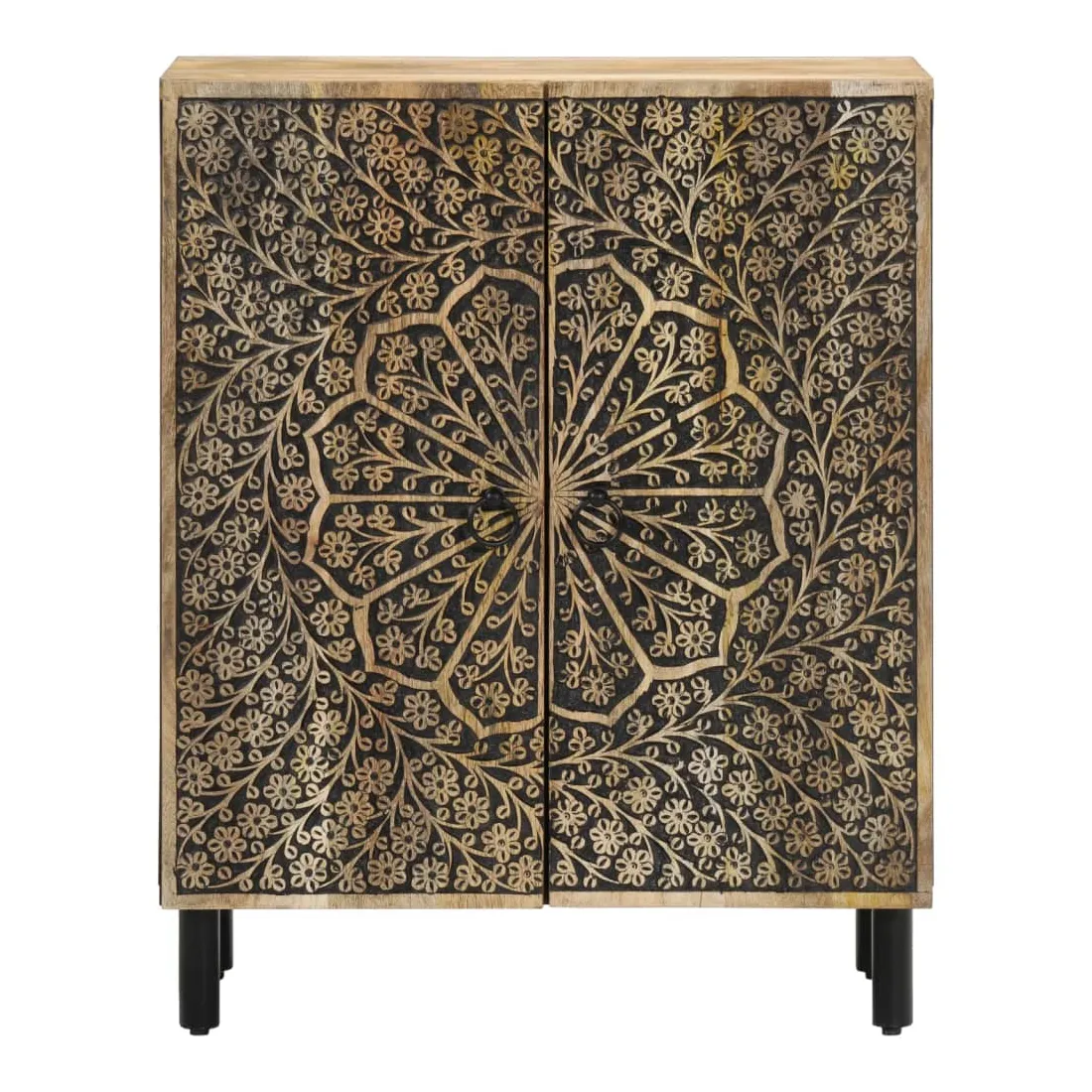 Ces armoires latérales, au look intemporel, sont conçues pour être un excellent supplément à votre maison. Bois de manguier massif : le bois de manguier massif est un bois dur tropical solide qui fait des meubles robustes. Ses beaux grains de bois rendent chaque meuble légèrement différent l'un de l'autre. Fabriquée en bois de manguier massif, le meuble est durable et stable.Grand espace de rangement : l'armoire offre un grand espace de rangement pour garder vos différents objets essentiels du quotidien bien organisés et à portée de main.Fonction d'affichage : le dessus de l'armoire de rangement est idéal pour exposer vos objets décoratifs, albums photo ou petites plantes.Pieds robustes: les pieds en fer ajoutent à la robustesse et à la stabilité de la planche latérale.Style rétro : l'organisateur de maison avec motifs floraux sculptés à la main apporte le luxe d'un style rétro à votre intérieur étant le point central de votre pièce. Bon à savoir :Chaque article est unique, avec des variations de couleurs et de grains. La livraison est aléatoire, ce qui garantit l'exclusivité et l'individualité de votre produit. Attention :Pour éviter qu'il ne bascule, ce produit doit être utilisé avec le dispositif de fixation murale fourni.