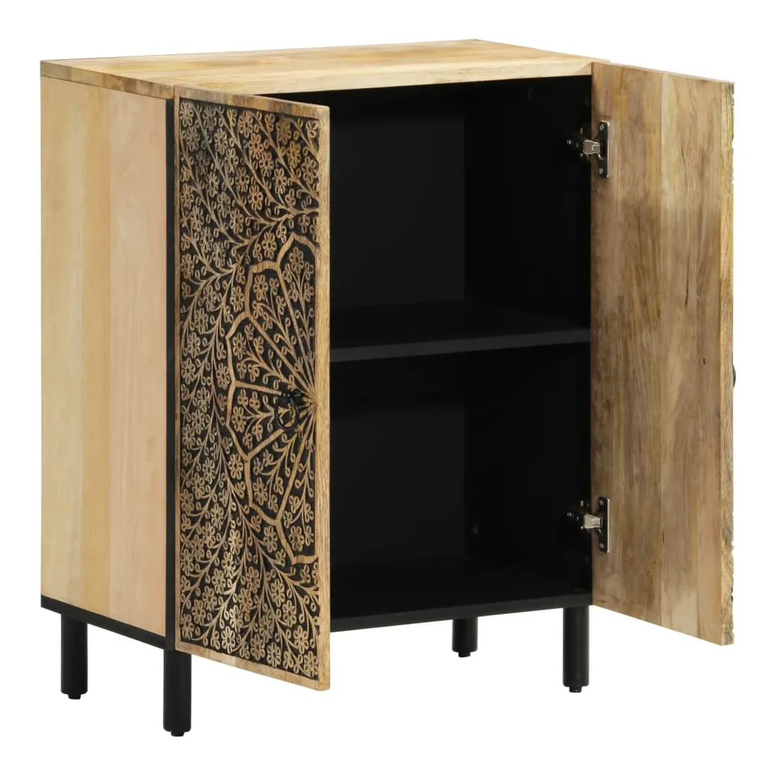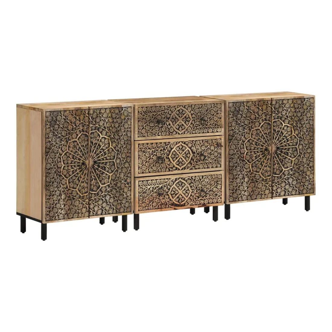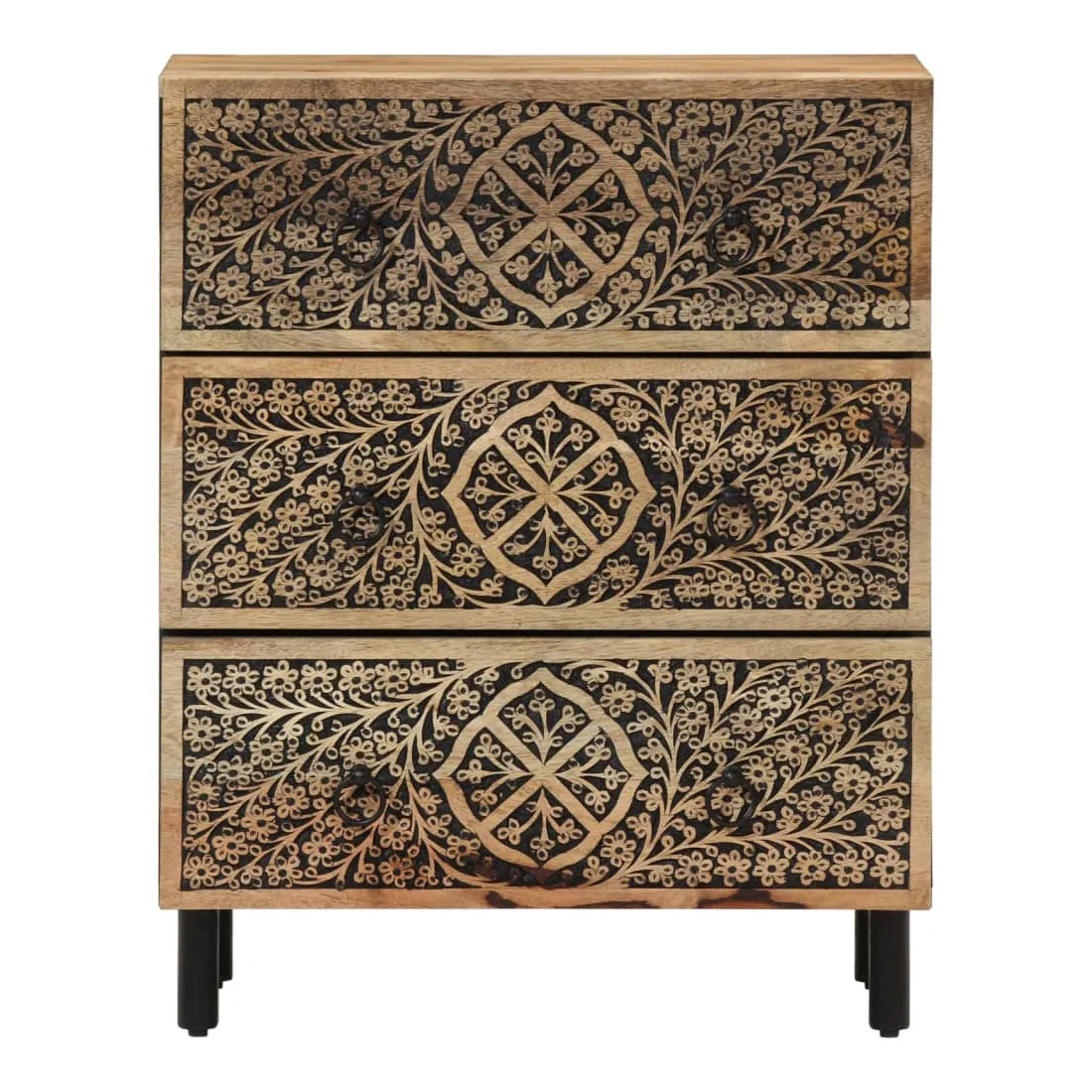 Ces armoires latérales, au look intemporel, sont conçues pour être un excellent supplément à votre maison. Bois de manguier massif : le bois de manguier massif est un bois dur tropical solide qui fait des meubles robustes. Ses beaux grains de bois rendent chaque meuble légèrement différent l'un de l'autre. Fabriquée en bois de manguier massif, le meuble est durable et stable.Grand espace de rangement : l'armoire offre un grand espace de rangement pour garder vos différents objets essentiels du quotidien bien organisés et à portée de main.Fonction d'affichage : le dessus de l'armoire de rangement est idéal pour exposer vos objets décoratifs, albums photo ou petites plantes.Pieds robustes: les pieds en fer ajoutent à la robustesse et à la stabilité de la planche latérale.Style rétro : l'organisateur de maison avec motifs floraux sculptés à la main apporte le luxe d'un style rétro à votre intérieur étant le point central de votre pièce. Bon à savoir :Chaque article est unique, avec des variations de couleurs et de grains. La livraison est aléatoire, ce qui garantit l'exclusivité et l'individualité de votre produit. Attention :Pour éviter qu'il ne bascule, ce produit doit être utilisé avec le dispositif de fixation murale fourni.