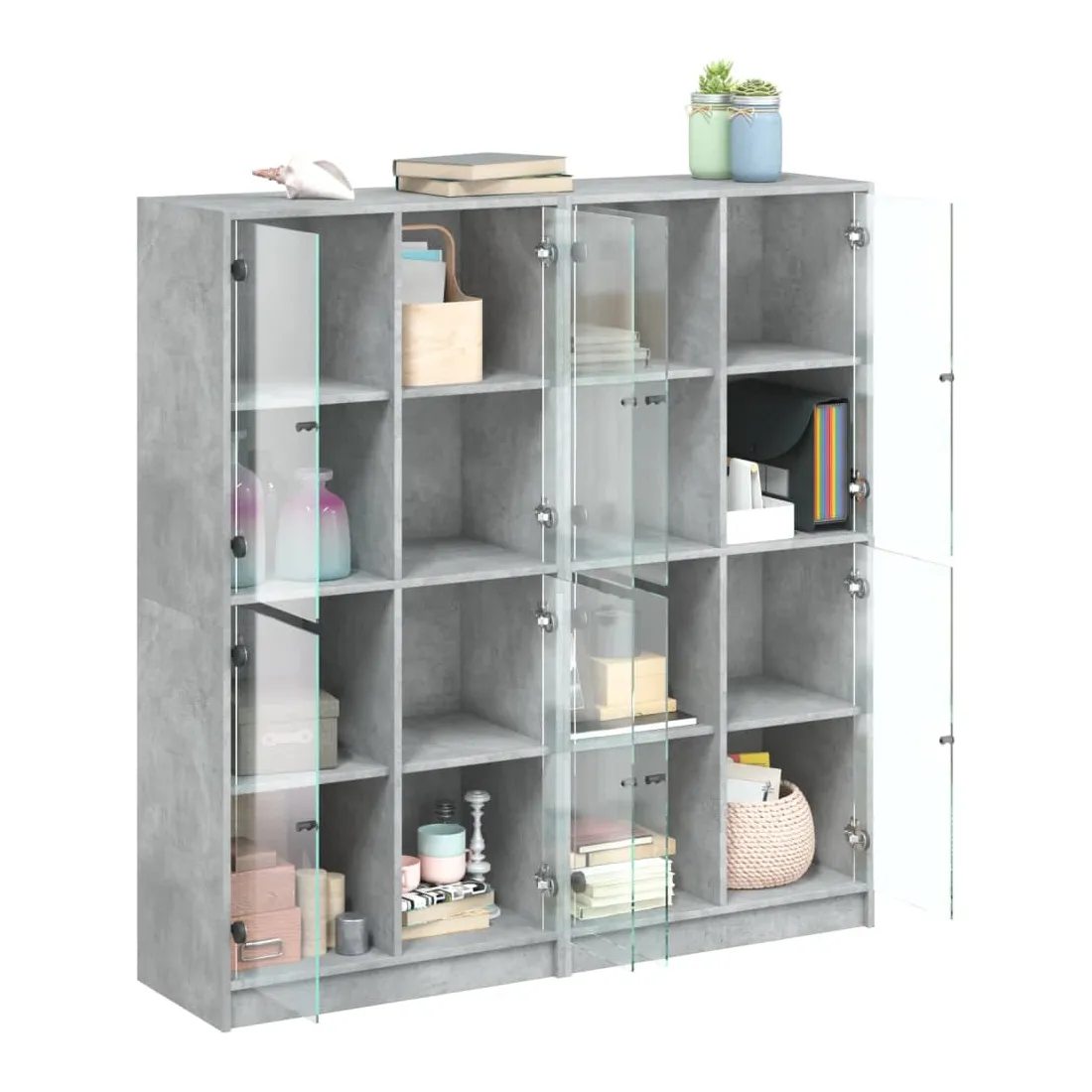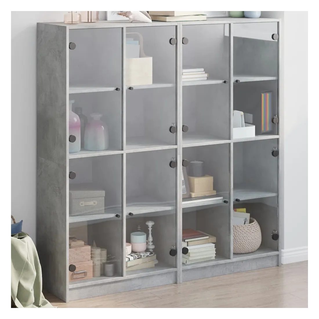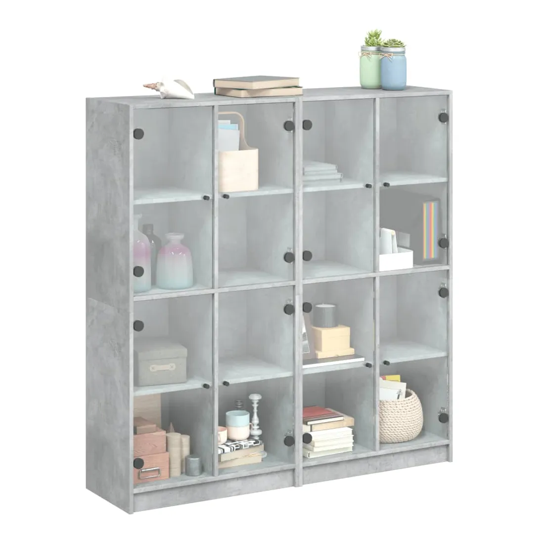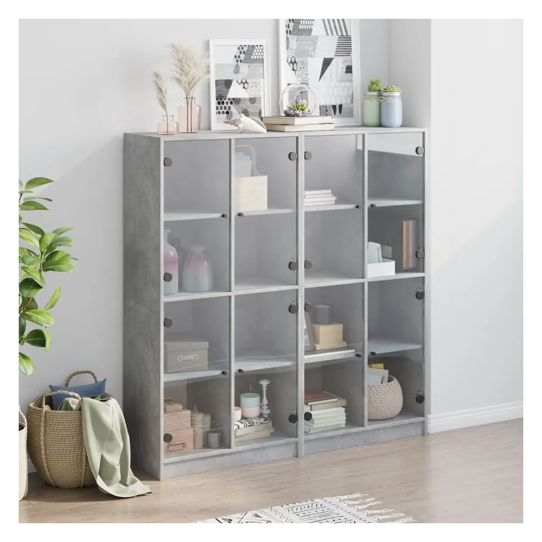 Cette bibliothèque offre une solution idéale pour organiser vos livres et ajoutera une touche de charme moderne à votre intérieur. Matériau robuste et durable : le bois d'ingénierie est d'une qualité exceptionnelle avec une surface lisse et présente également résistance, stabilité et résistance à l'humidité.Grand espace de rangement : la bibliothèque offre un grand espace de rangement pour garder votre collection de livres, magazines et documents en bon ordre.Dessus stable et robuste : le dessus de l'armoire de rangement est parfait pour exposer vos objets décoratifs, cadres photo et plantes en pot.Design pratique : gardez vos essentiels à l'abri de la poussière en les cachant derrière les portes vitrées. De plus, les poignées noires facilitent l'ouverture de la bibliothèque. Attention :Pour éviter qu'il ne bascule, ce produit doit être utilisé avec le dispositif de fixation murale fourni.