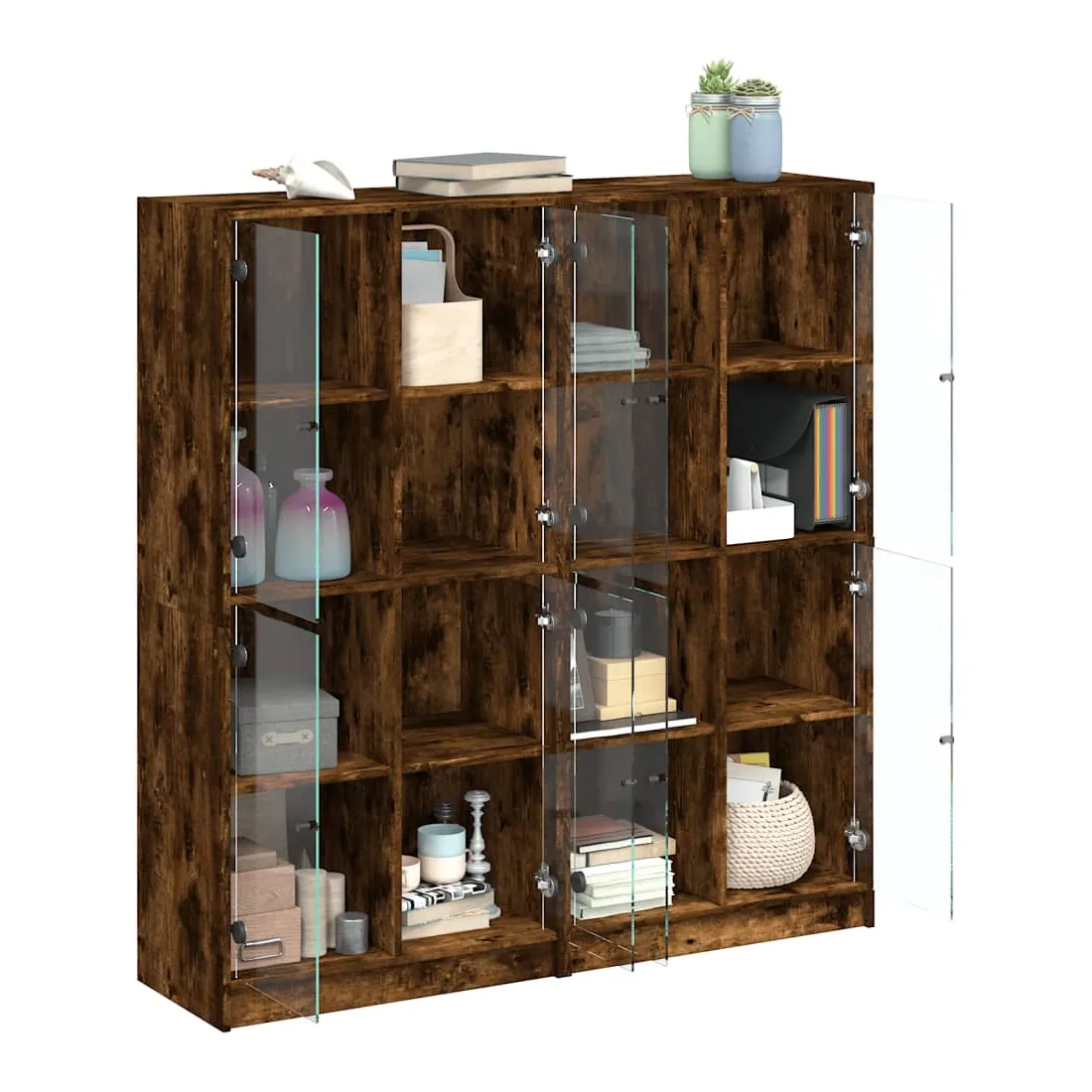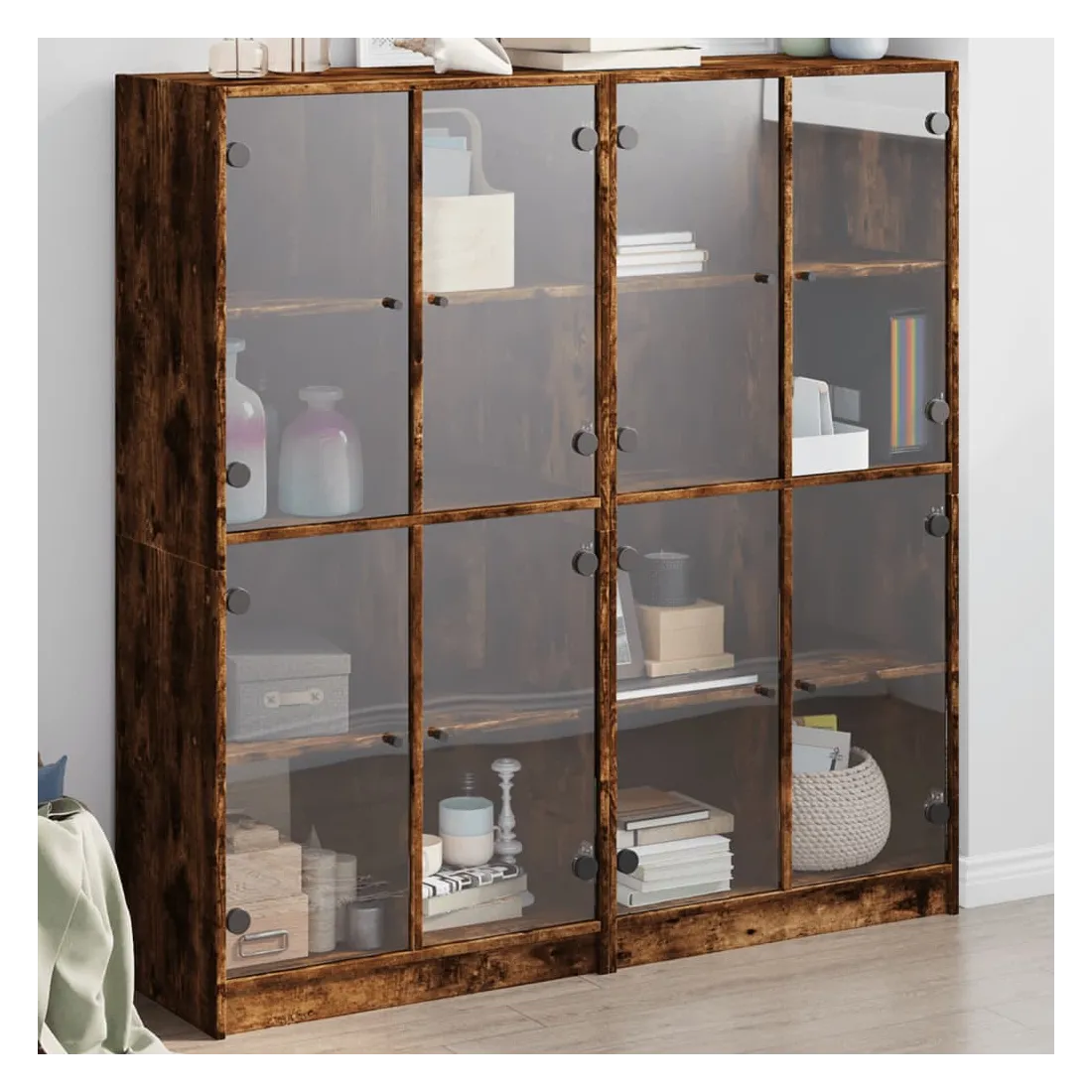 Cette bibliothèque offre une solution idéale pour organiser vos livres et ajoutera une touche de charme moderne à votre intérieur. Matériau robuste et durable : le bois d'ingénierie est d'une qualité exceptionnelle avec une surface lisse et présente également résistance, stabilité et résistance à l'humidité.Grand espace de rangement : la bibliothèque offre un grand espace de rangement pour garder votre collection de livres, magazines et documents en bon ordre.Dessus stable et robuste : le dessus de l'armoire de rangement est parfait pour exposer vos objets décoratifs, cadres photo et plantes en pot.Design pratique : gardez vos essentiels à l'abri de la poussière en les cachant derrière les portes vitrées. De plus, les poignées noires facilitent l'ouverture de la bibliothèque. Attention :Pour éviter qu'il ne soit renversé, ce produit doit être utilisé avec le dispositif de fixation au mur fourni.