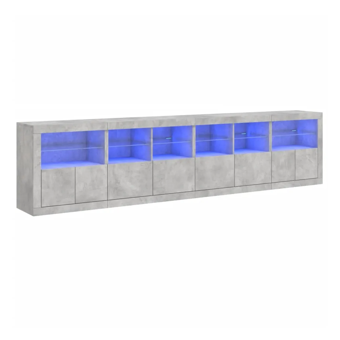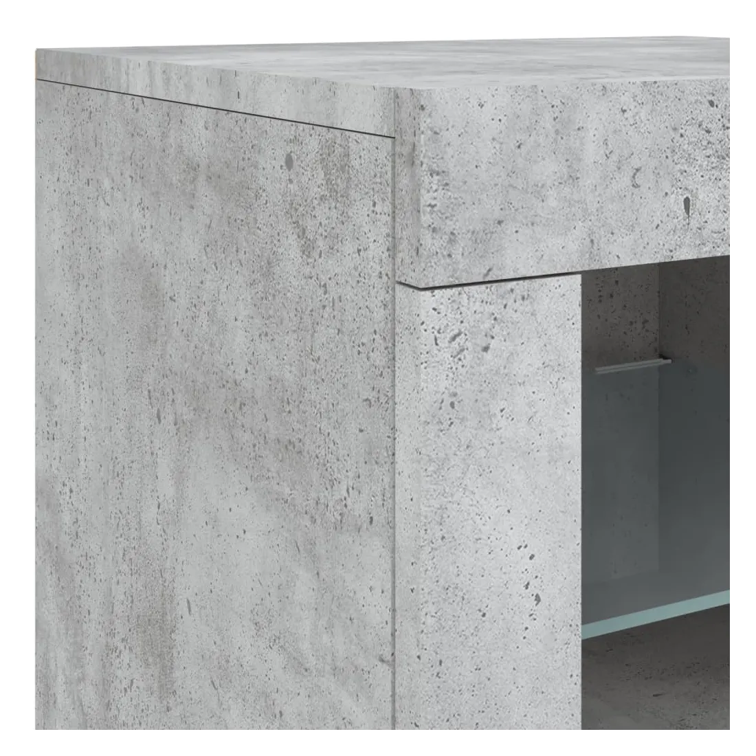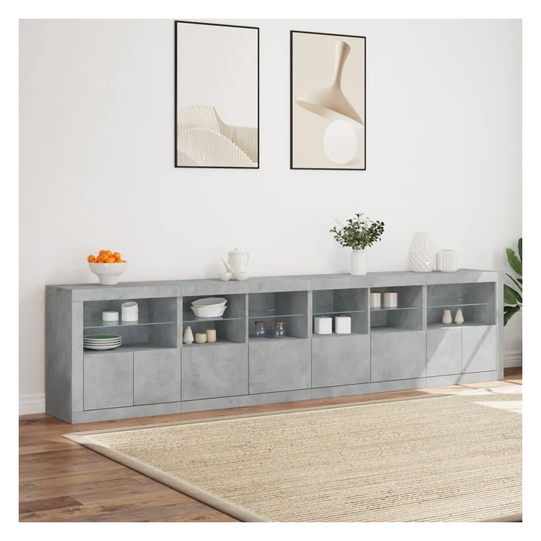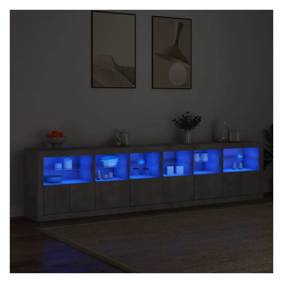 Décorez votre pièce avec ce buffet moderne avec éclairage LED, il s'harmonise facilement avec les meubles de tout style de votre maison. Matériau durable : le bois d'ingénierie est d'une qualité exceptionnelle avec une surface lisse et présente également résistance, stabilité et résistance à l'humidité.Lumières LED RVB : le buffet est équipé de lumières LED RVB vibrantes. Avec divers menus personnalisables, vous pouvez changer sans effort la couleur des lumières et même les régler automatiquement. Ces lumières LED renforcent non seulement l'aspect contemporain du buffet, mais aussi son attrait pour la mode.Grand espace de rangement : l'armoire de rangement offre beaucoup d'espace pour garder vos objets du quotidien bien rangés et facilement accessibles.Fonction d'exposition : la partie supérieure robuste de l'armoire d'entrée est idéale pour exposer des objets décoratifs, des cadres photo ou des plantes en pot.Porte pratiques : gardez vos essentiels à l'abri de la poussière en les cachant derrière les portes de l'armoire latérale. Bon à savoir :Ce produit est doté d'un connecteur USB qui nécessite une source d'alimentation USB de 5V certifiée (non incluse). Attention :Pour éviter qu'il ne soit renversé, ce produit doit être utilisé avec le dispositif de fixation au mur fourni.