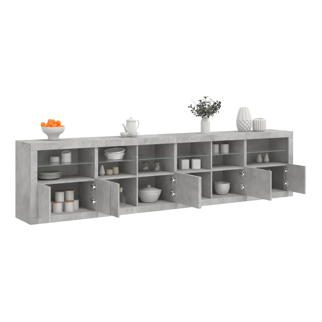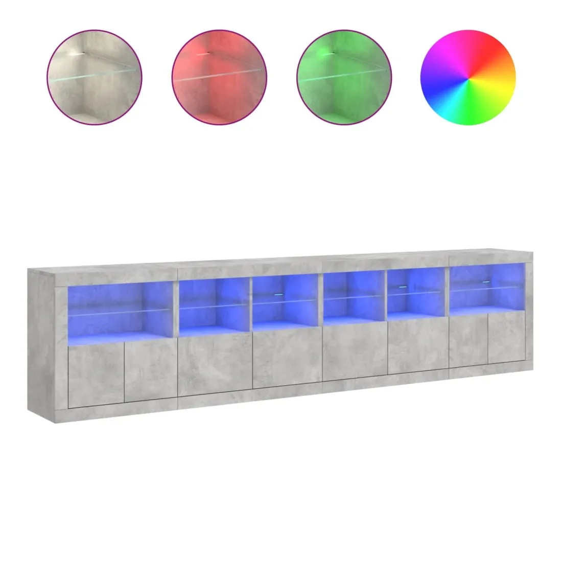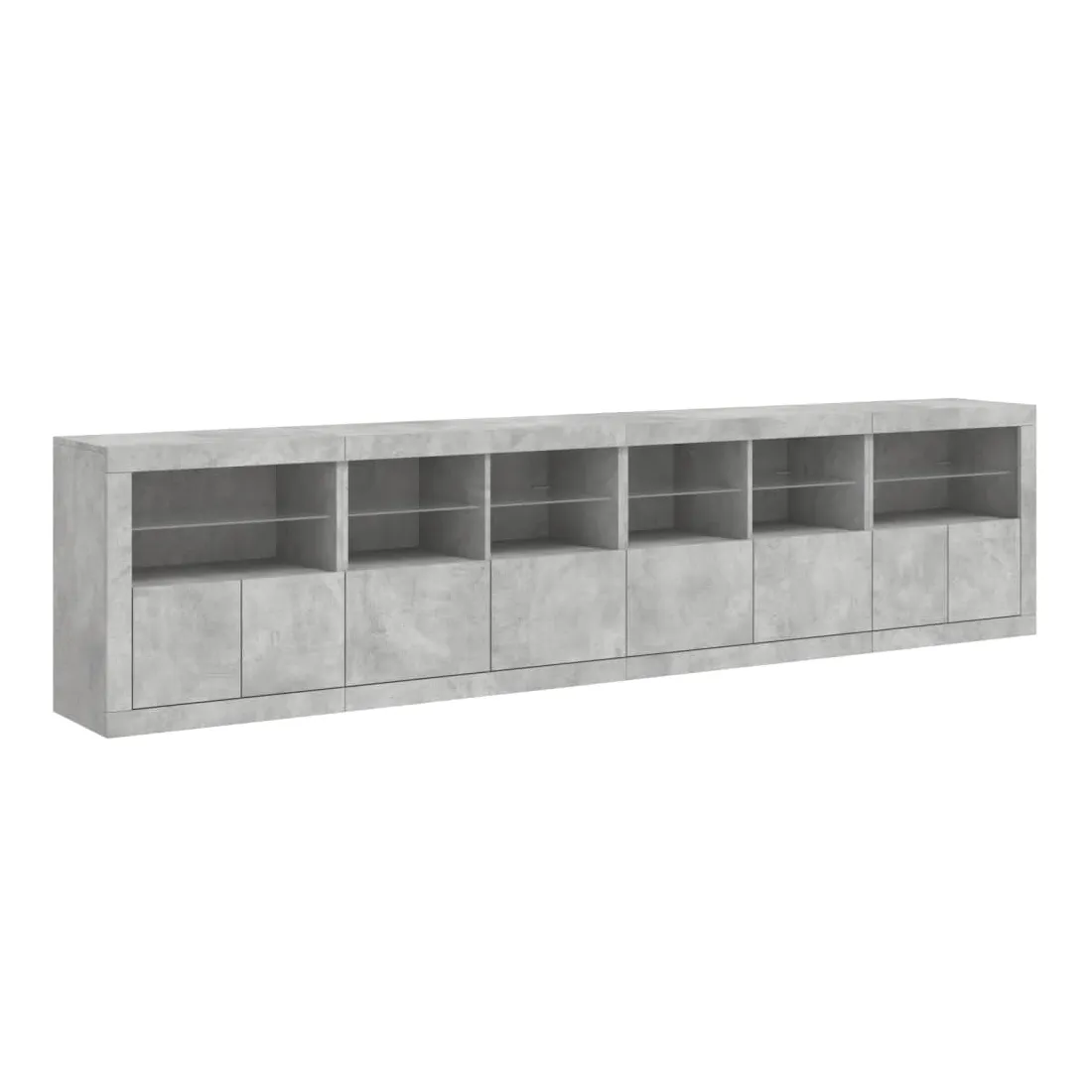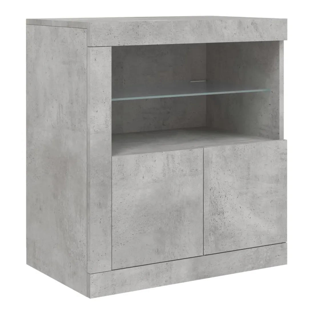Décorez votre pièce avec ce buffet moderne avec éclairage LED, il s'harmonise facilement avec les meubles de tout style de votre maison. Matériau durable : le bois d'ingénierie est d'une qualité exceptionnelle avec une surface lisse et présente également résistance, stabilité et résistance à l'humidité.Lumières LED RVB : le buffet est équipé de lumières LED RVB vibrantes. Avec divers menus personnalisables, vous pouvez changer sans effort la couleur des lumières et même les régler automatiquement. Ces lumières LED renforcent non seulement l'aspect contemporain du buffet, mais aussi son attrait pour la mode.Grand espace de rangement : l'armoire de rangement offre beaucoup d'espace pour garder vos objets du quotidien bien rangés et facilement accessibles.Fonction d'exposition : la partie supérieure robuste de l'armoire d'entrée est idéale pour exposer des objets décoratifs, des cadres photo ou des plantes en pot.Porte pratiques : gardez vos essentiels à l'abri de la poussière en les cachant derrière les portes de l'armoire latérale. Bon à savoir :Ce produit est doté d'un connecteur USB qui nécessite une source d'alimentation USB de 5V certifiée (non incluse). Attention :Pour éviter qu'il ne soit renversé, ce produit doit être utilisé avec le dispositif de fixation au mur fourni.