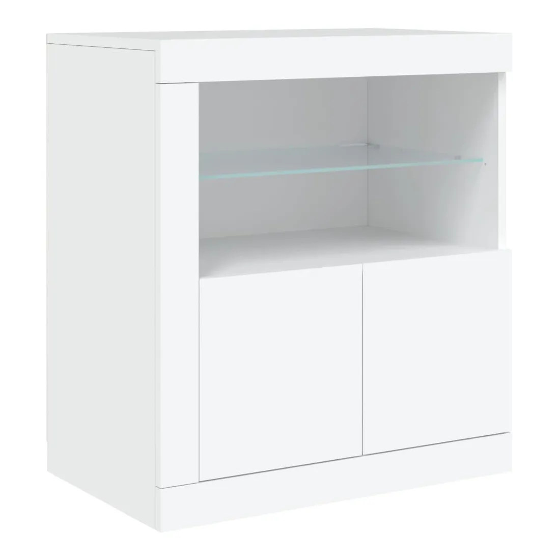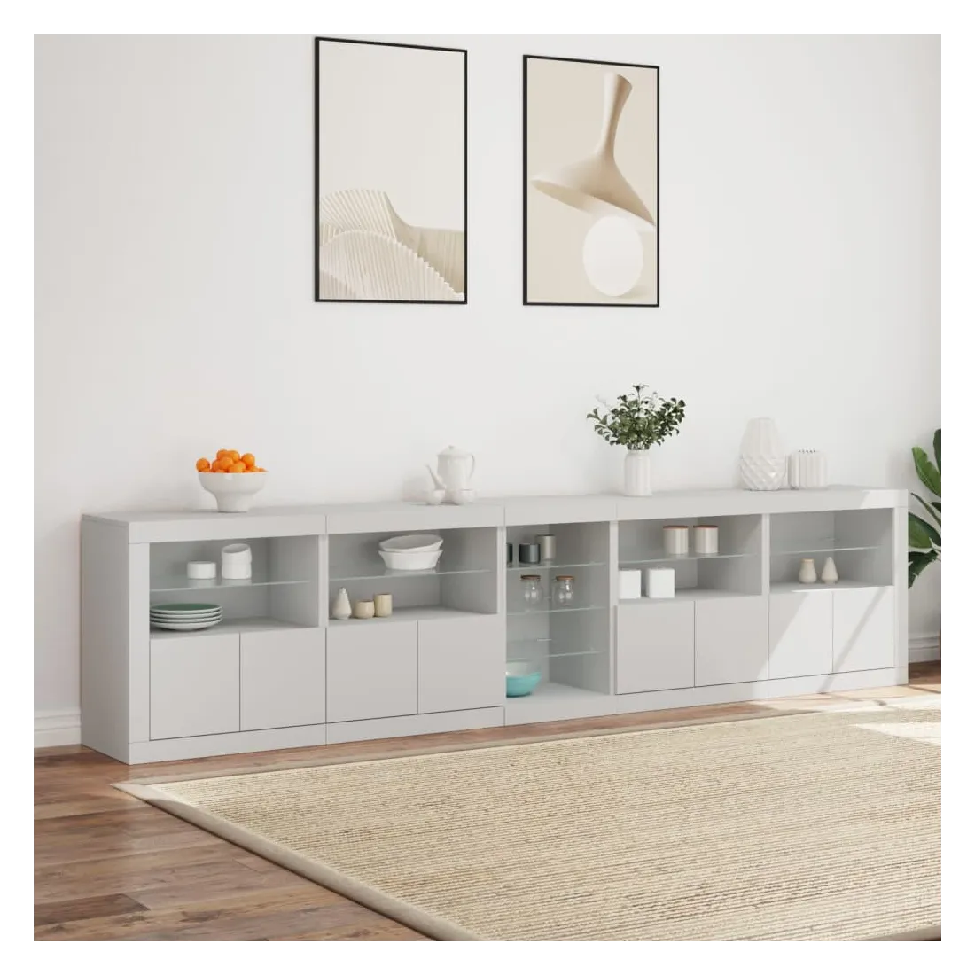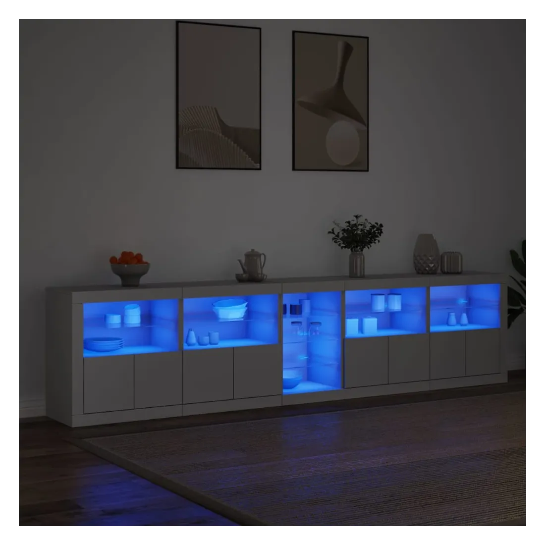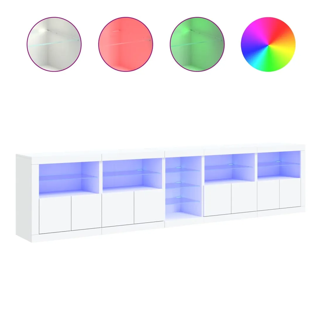 Décorez votre pièce avec ce buffet moderne avec éclairage LED, il s'harmonise facilement avec les meubles de tout style de votre maison. Matériau durable : le bois d'ingénierie est d'une qualité exceptionnelle avec une surface lisse et présente également résistance, stabilité et résistance à l'humidité.Lumières LED RVB : le buffet est équipé de lumières LED RVB vibrantes. Avec divers menus personnalisables, vous pouvez changer sans effort la couleur des lumières et même les régler automatiquement. Ces lumières LED renforcent non seulement l'aspect contemporain du buffet, mais aussi son attrait pour la mode.Grand espace de rangement : l'armoire de rangement offre beaucoup d'espace pour garder vos objets du quotidien bien rangés et facilement accessibles.Fonction d'exposition : la partie supérieure robuste de l'armoire d'entrée est idéale pour exposer des objets décoratifs, des cadres photo ou des plantes en pot.Porte pratiques : gardez vos essentiels à l'abri de la poussière en les cachant derrière les portes de l'armoire latérale. Bon à savoir :Ce produit est doté d'un connecteur USB qui nécessite une source d'alimentation USB de 5V certifiée (non incluse). Attention :Pour éviter qu'il ne soit renversé, ce produit doit être utilisé avec le dispositif de fixation au mur fourni.