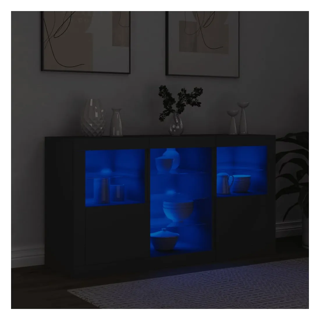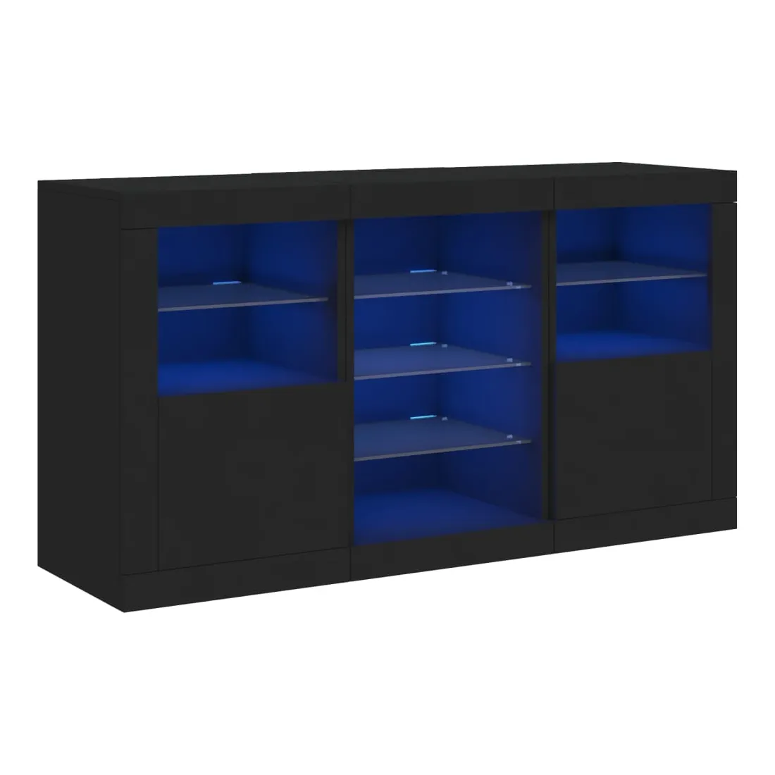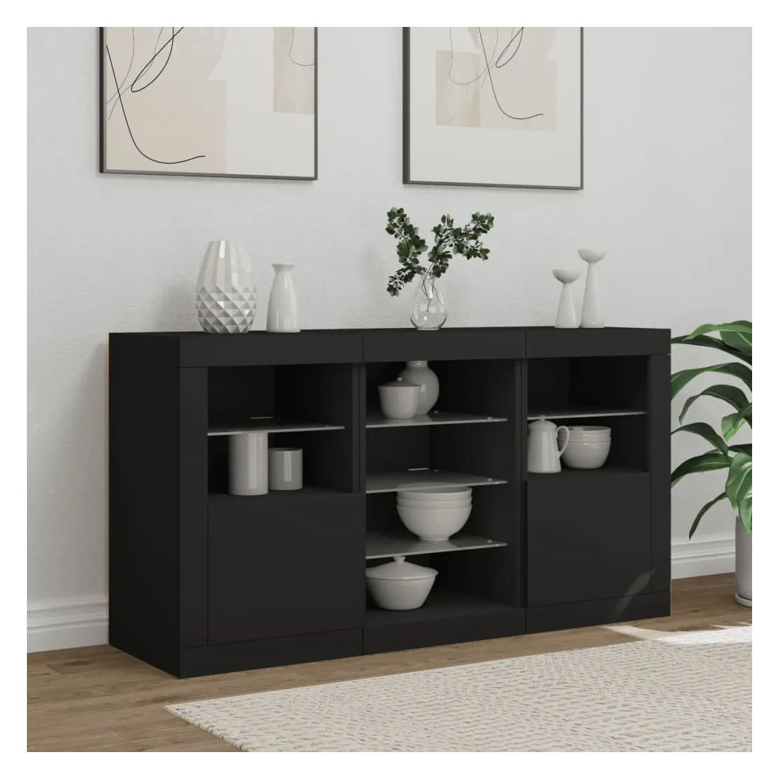 Décorez votre pièce avec ce buffet moderne avec éclairage LED, il s'harmonise facilement avec les meubles de tout style de votre maison. Matériau durable : le bois d'ingénierie est d'une qualité exceptionnelle avec une surface lisse et présente également résistance, stabilité et résistance à l'humidité.Lumières LED RVB : le buffet est équipé de lumières LED RVB vibrantes. Avec divers menus personnalisables, vous pouvez changer sans effort la couleur des lumières et même les régler automatiquement. Ces lumières LED renforcent non seulement l'aspect contemporain du buffet, mais aussi son attrait pour la mode.Grand espace de rangement : l'armoire de rangement offre beaucoup d'espace pour garder vos objets du quotidien bien rangés et facilement accessibles.Fonction d'exposition : la partie supérieure robuste de l'armoire d'entrée est idéale pour exposer des objets décoratifs, des cadres photo ou des plantes en pot.Porte pratiques : gardez vos essentiels à l'abri de la poussière en les cachant derrière les portes de l'armoire latérale. Bon à savoir :Ce produit est doté d'un connecteur USB qui nécessite une source d'alimentation USB de 5V certifiée (non incluse). Attention :Pour éviter qu'il ne soit renversé, ce produit doit être utilisé avec le dispositif de fixation au mur fourni.