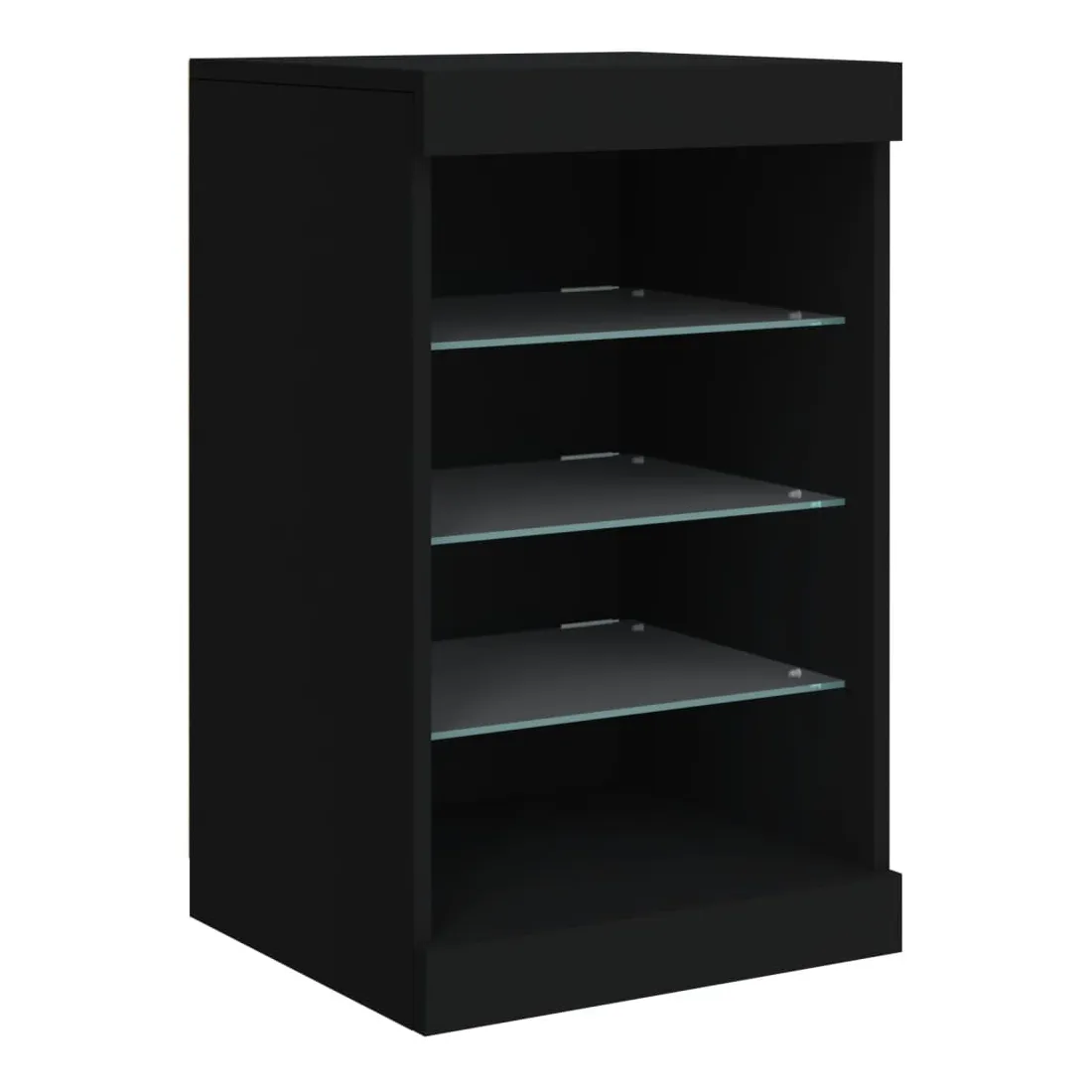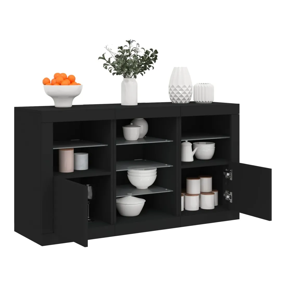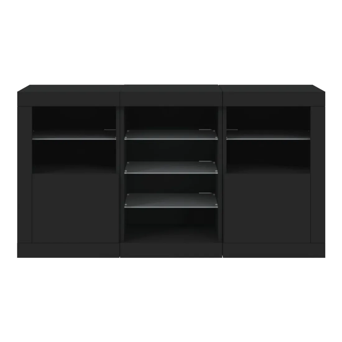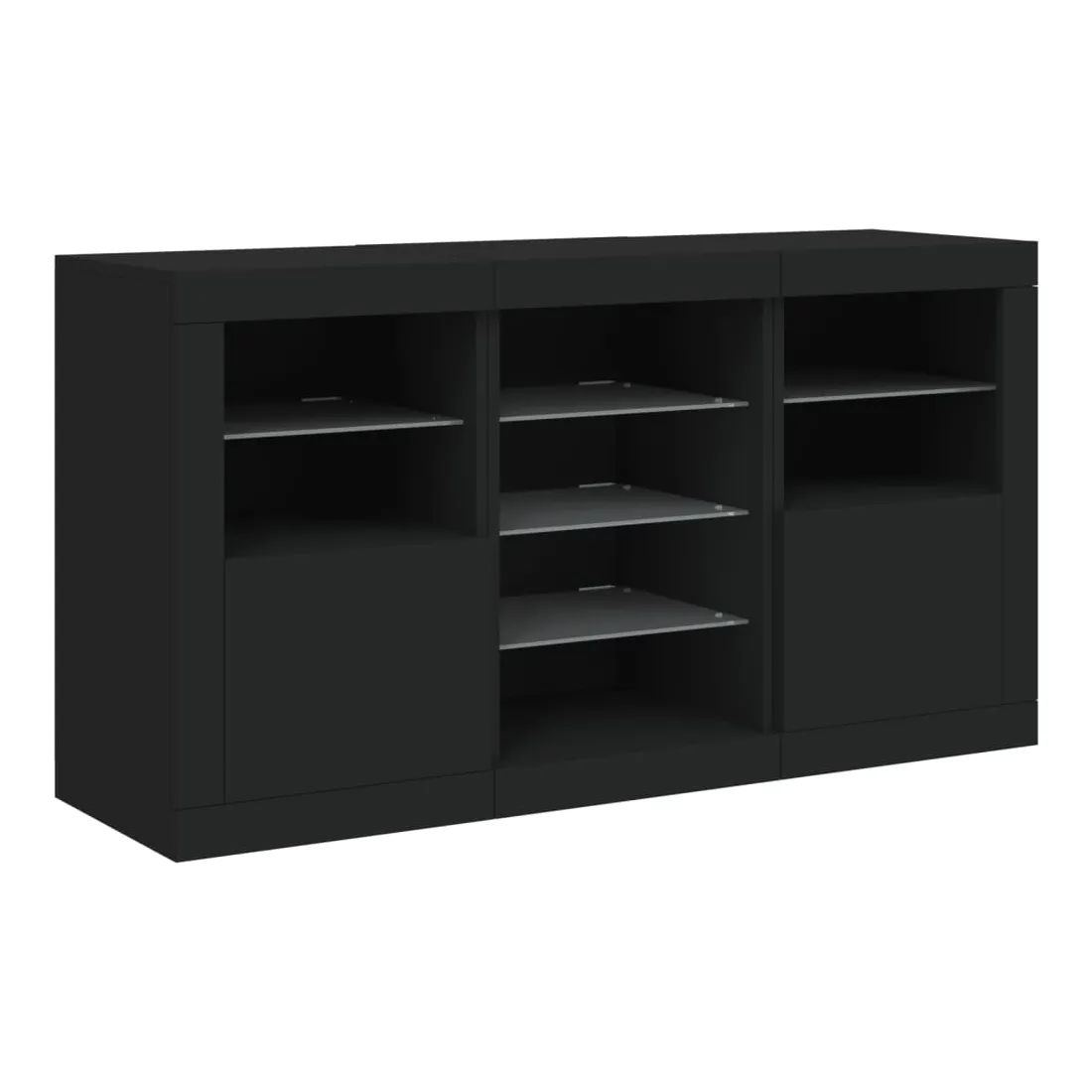 Décorez votre pièce avec ce buffet moderne avec éclairage LED, il s'harmonise facilement avec les meubles de tout style de votre maison. Matériau durable : le bois d'ingénierie est d'une qualité exceptionnelle avec une surface lisse et présente également résistance, stabilité et résistance à l'humidité.Lumières LED RVB : le buffet est équipé de lumières LED RVB vibrantes. Avec divers menus personnalisables, vous pouvez changer sans effort la couleur des lumières et même les régler automatiquement. Ces lumières LED renforcent non seulement l'aspect contemporain du buffet, mais aussi son attrait pour la mode.Grand espace de rangement : l'armoire de rangement offre beaucoup d'espace pour garder vos objets du quotidien bien rangés et facilement accessibles.Fonction d'exposition : la partie supérieure robuste de l'armoire d'entrée est idéale pour exposer des objets décoratifs, des cadres photo ou des plantes en pot.Porte pratiques : gardez vos essentiels à l'abri de la poussière en les cachant derrière les portes de l'armoire latérale. Bon à savoir :Ce produit est doté d'un connecteur USB qui nécessite une source d'alimentation USB de 5V certifiée (non incluse). Attention :Pour éviter qu'il ne soit renversé, ce produit doit être utilisé avec le dispositif de fixation au mur fourni.