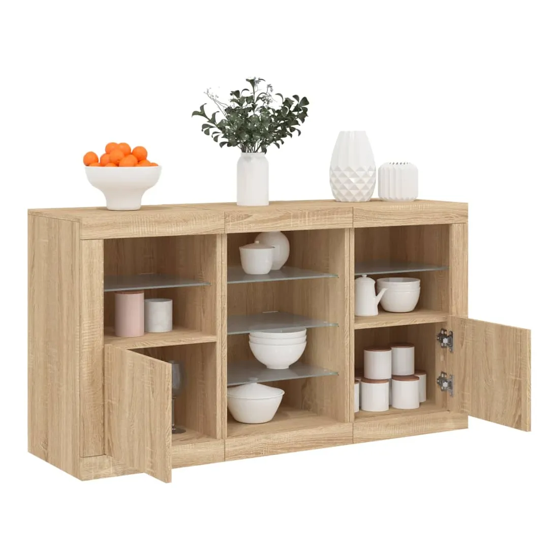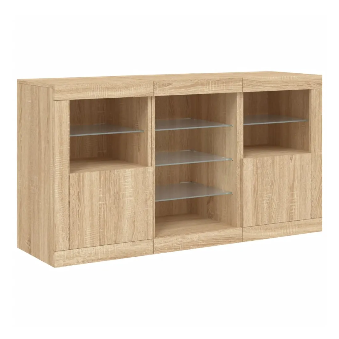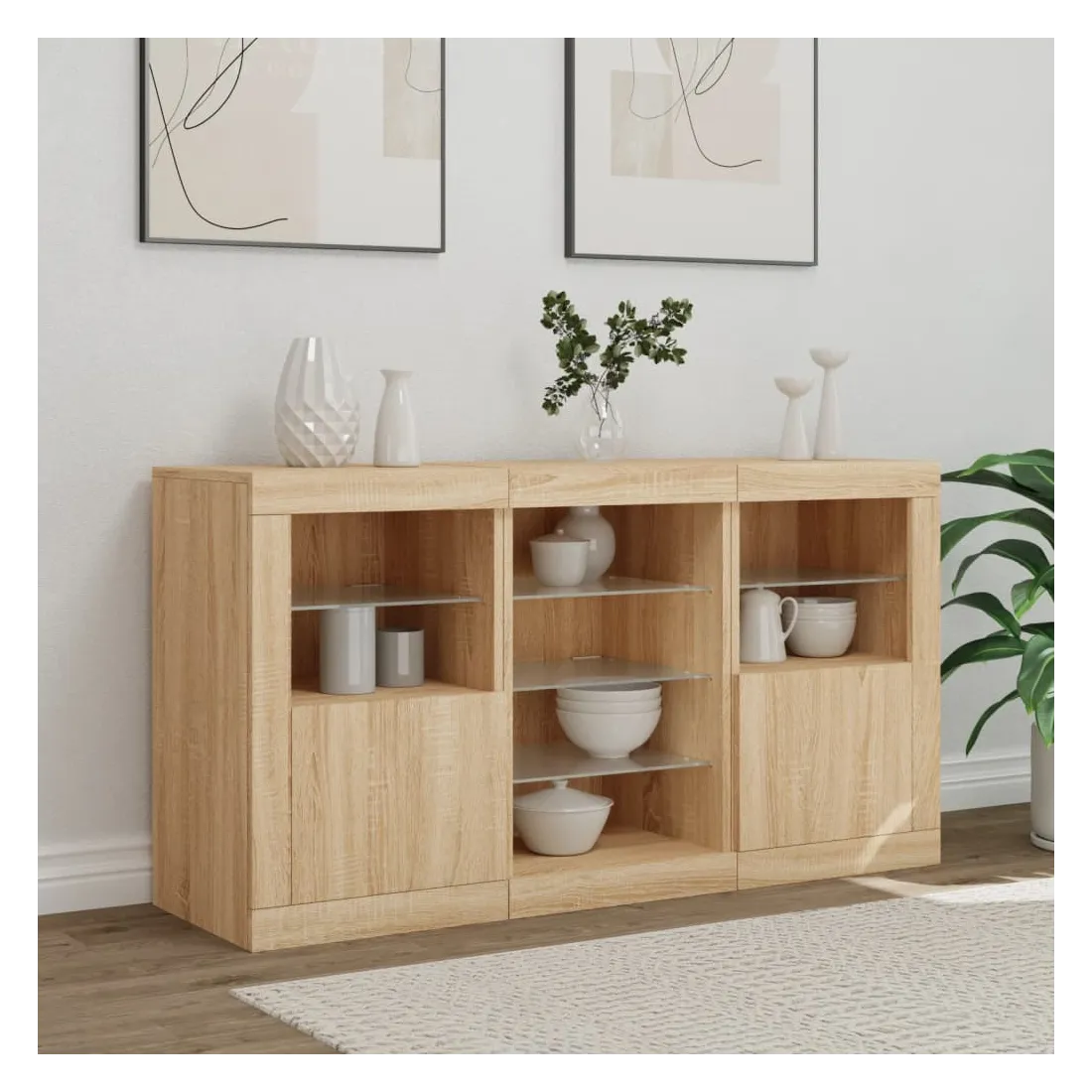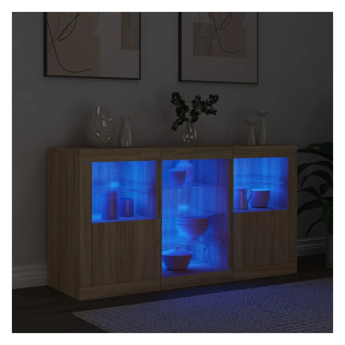 Décorez votre pièce avec ce buffet moderne avec éclairage LED, il s'harmonise facilement avec les meubles de tout style de votre maison. Matériau durable : le bois d'ingénierie est d'une qualité exceptionnelle avec une surface lisse et présente également résistance, stabilité et résistance à l'humidité.Lumières LED RVB : le buffet est équipé de lumières LED RVB vibrantes. Avec divers menus personnalisables, vous pouvez changer sans effort la couleur des lumières et même les régler automatiquement. Ces lumières LED renforcent non seulement l'aspect contemporain du buffet, mais aussi son attrait pour la mode.Grand espace de rangement : l'armoire de rangement offre beaucoup d'espace pour garder vos objets du quotidien bien rangés et facilement accessibles.Fonction d'exposition : la partie supérieure robuste de l'armoire d'entrée est idéale pour exposer des objets décoratifs, des cadres photo ou des plantes en pot.Porte pratiques : gardez vos essentiels à l'abri de la poussière en les cachant derrière les portes de l'armoire latérale. Bon à savoir :Ce produit est doté d'un connecteur USB qui nécessite une source d'alimentation USB de 5V certifiée (non incluse). Attention :Pour éviter qu'il ne soit renversé, ce produit doit être utilisé avec le dispositif de fixation au mur fourni.