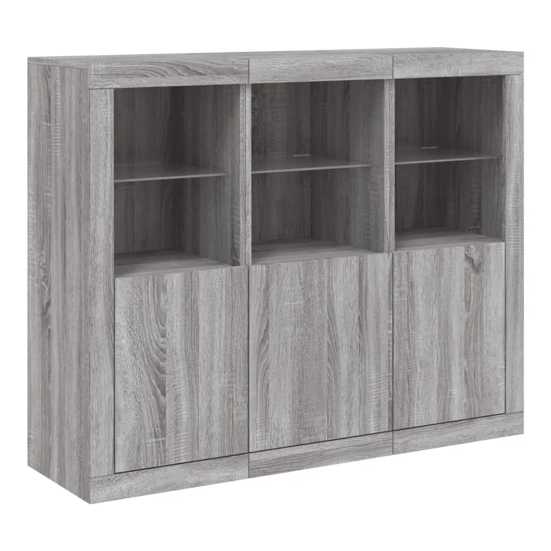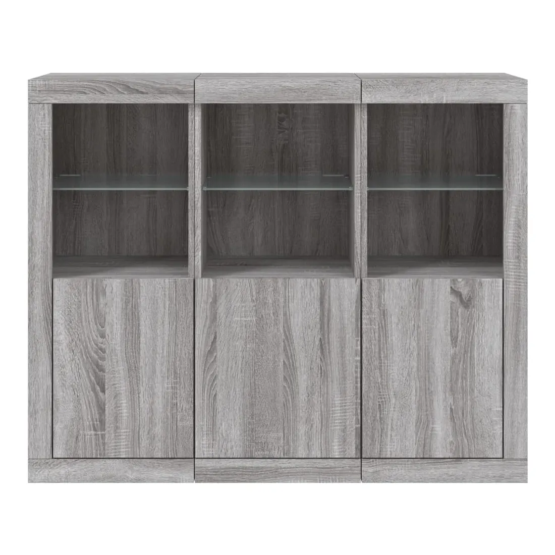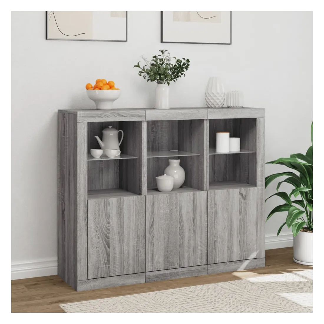 Décorez votre pièce avec ces buffets modernes à éclairage LED qui s'harmonisent facilement avec les meubles de tout style de votre maison. Matériau durable : le bois d'ingénierie est d'une qualité exceptionnelle avec une surface lisse et présente également résistance, stabilité et résistance à l'humidité.Grand espace de rangement : ces buffets offrent un grand espace de rangement pour garder vos magazines, livres, télécommandes et autres petits objets bien organisés et à portée de main.Fonction d'affichage : le dessus de ces buffets est idéal pour afficher des objets décoratifs, des cadres photo ou des plantes en pot.Lumières LED réglables : ces armoires de rangement sont équipées de lumières LED RVB, qui ont différents menus pour changer la couleur de la lumière et l'ajuster automatiquement, décorant votre maison de manière colorée et belle. Attention :Pour éviter qu'il ne soit renversé, ce produit doit être utilisé avec le dispositif de fixation au mur fourni.Bon à savoir :Ce produit est doté d'un connecteur USB qui nécessite une source d'alimentation USB de 5V certifiée (non incluse).