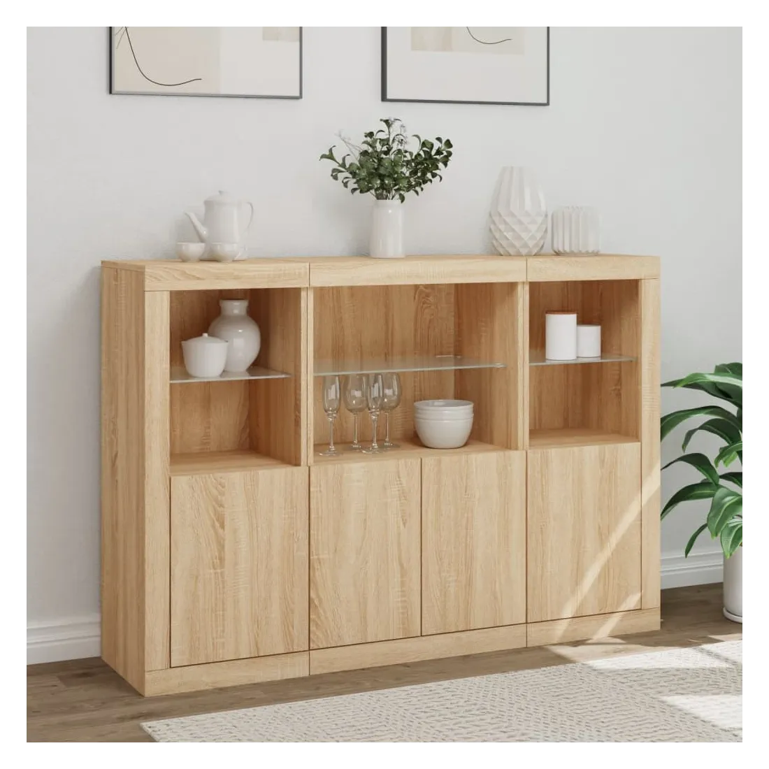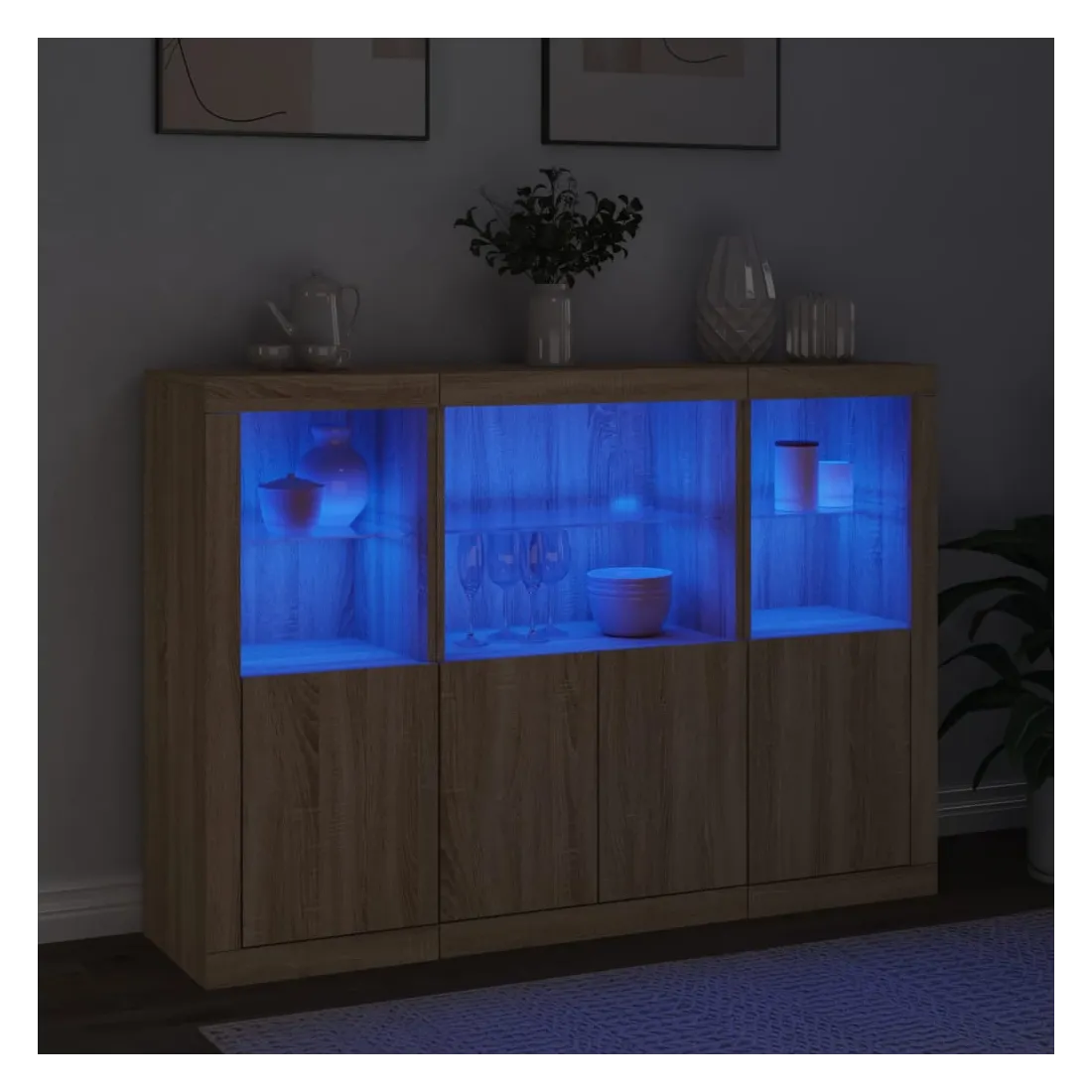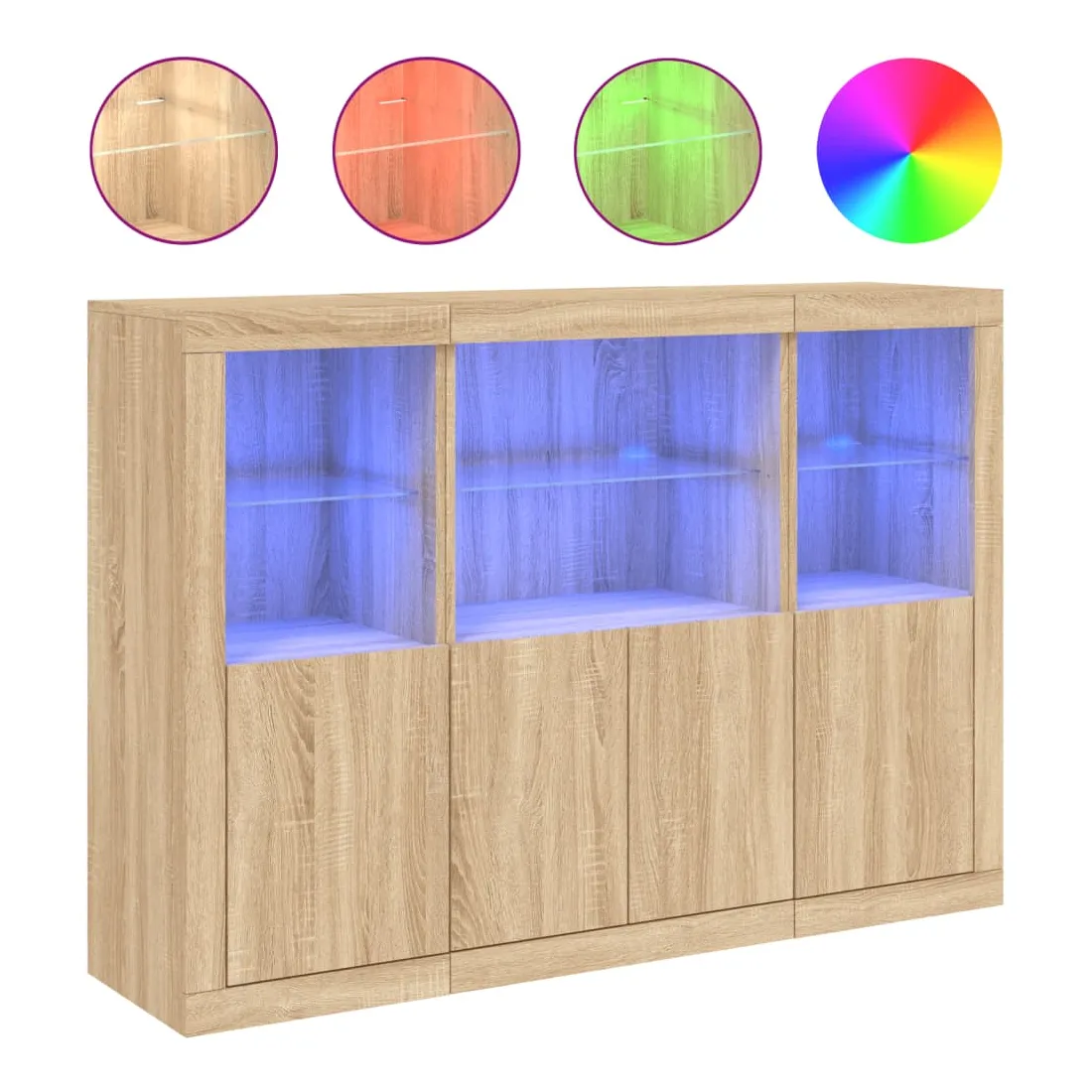 Décorez votre pièce avec ces buffets modernes à éclairage LED qui s'harmonisent facilement avec les meubles de tout style de votre maison. Matériau durable : le bois d'ingénierie est d'une qualité exceptionnelle avec une surface lisse et présente également résistance, stabilité et résistance à l'humidité.Grand espace de rangement : ces buffets offrent un grand espace de rangement pour garder vos magazines, livres, télécommandes et autres petits objets bien organisés et à portée de main.Fonction d'affichage : le dessus de ces buffets est idéal pour afficher des objets décoratifs, des cadres photo ou des plantes en pot.Lumières LED réglables : ces armoires de rangement sont équipées de lumières LED RVB, qui ont différents menus pour changer la couleur de la lumière et l'ajuster automatiquement, décorant votre maison de manière colorée et belle. Attention :Pour éviter qu'il ne soit renversé, ce produit doit être utilisé avec le dispositif de fixation au mur fourni.Bon à savoir :Ce produit est doté d'un connecteur USB qui nécessite une source d'alimentation USB de 5V certifiée (non incluse).