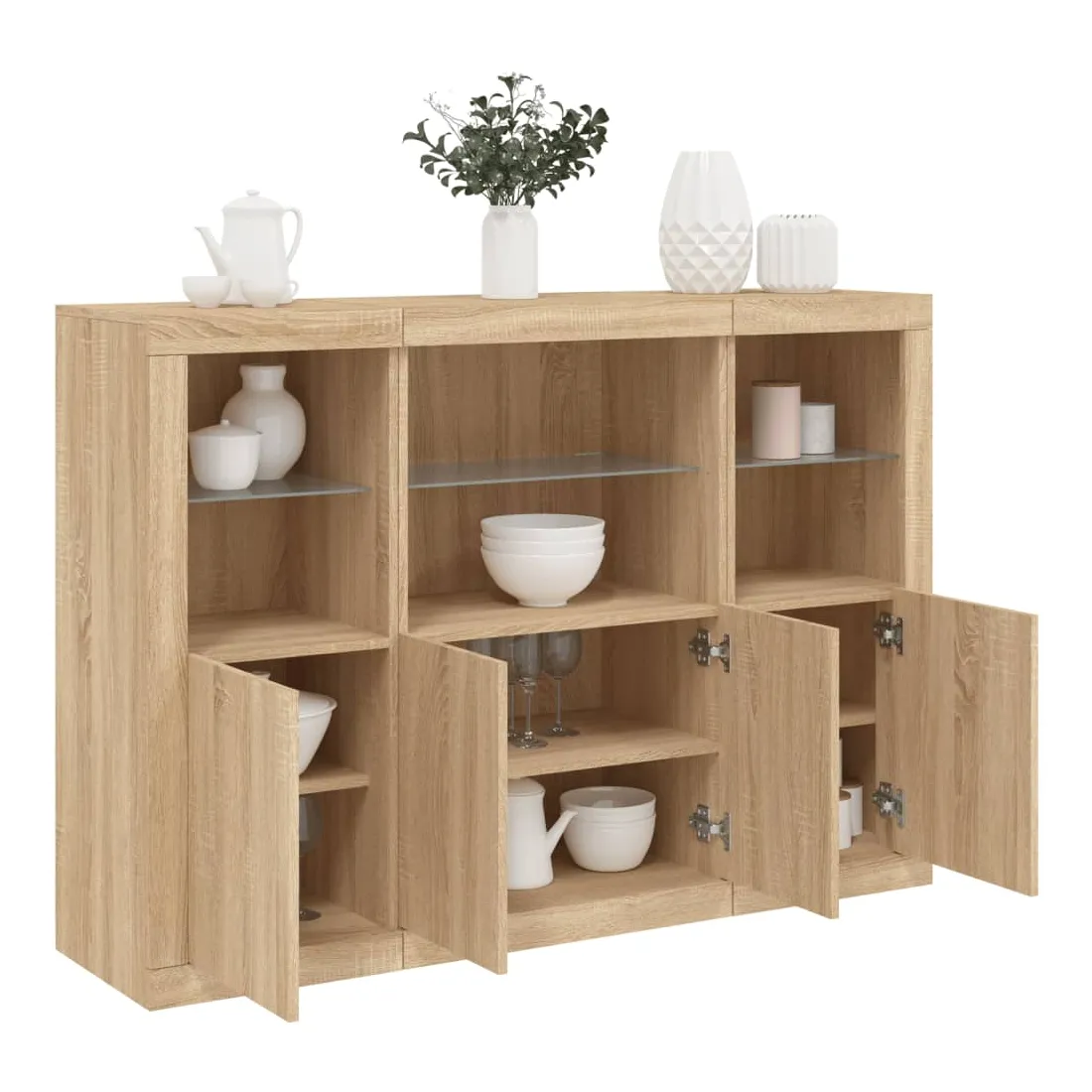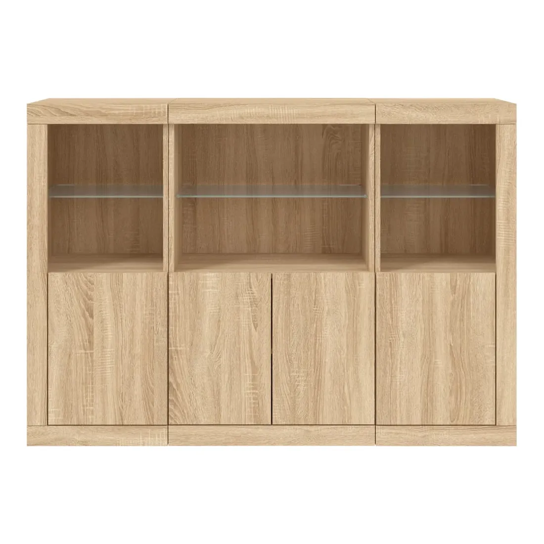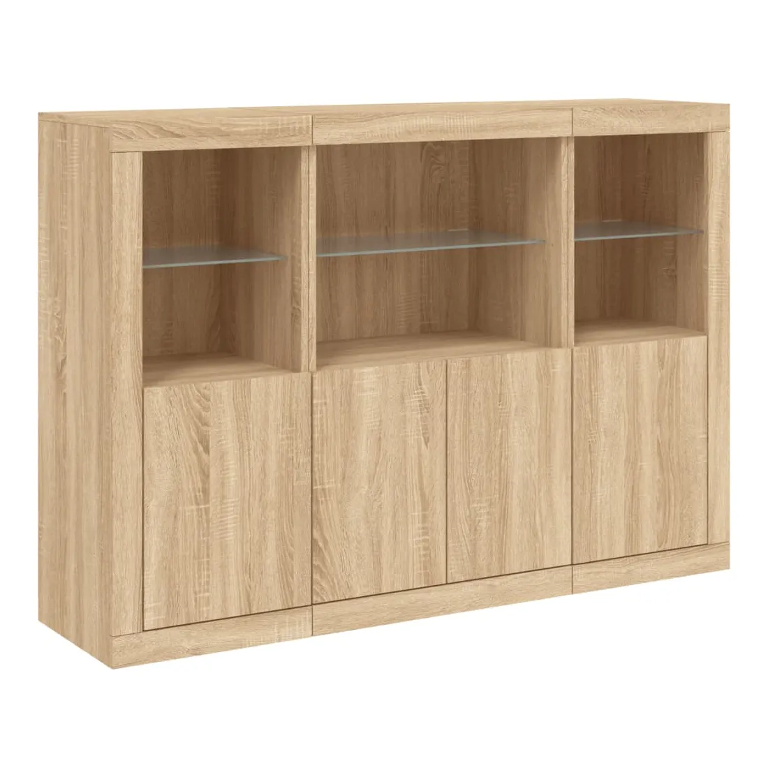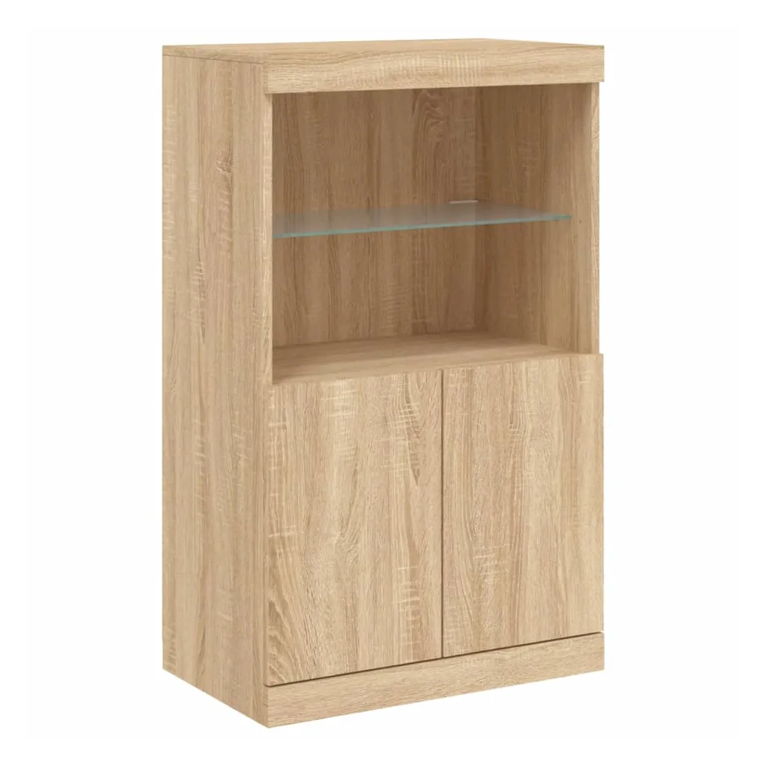 Décorez votre pièce avec ces buffets modernes à éclairage LED qui s'harmonisent facilement avec les meubles de tout style de votre maison. Matériau durable : le bois d'ingénierie est d'une qualité exceptionnelle avec une surface lisse et présente également résistance, stabilité et résistance à l'humidité.Grand espace de rangement : ces buffets offrent un grand espace de rangement pour garder vos magazines, livres, télécommandes et autres petits objets bien organisés et à portée de main.Fonction d'affichage : le dessus de ces buffets est idéal pour afficher des objets décoratifs, des cadres photo ou des plantes en pot.Lumières LED réglables : ces armoires de rangement sont équipées de lumières LED RVB, qui ont différents menus pour changer la couleur de la lumière et l'ajuster automatiquement, décorant votre maison de manière colorée et belle. Attention :Pour éviter qu'il ne soit renversé, ce produit doit être utilisé avec le dispositif de fixation au mur fourni.Bon à savoir :Ce produit est doté d'un connecteur USB qui nécessite une source d'alimentation USB de 5V certifiée (non incluse).