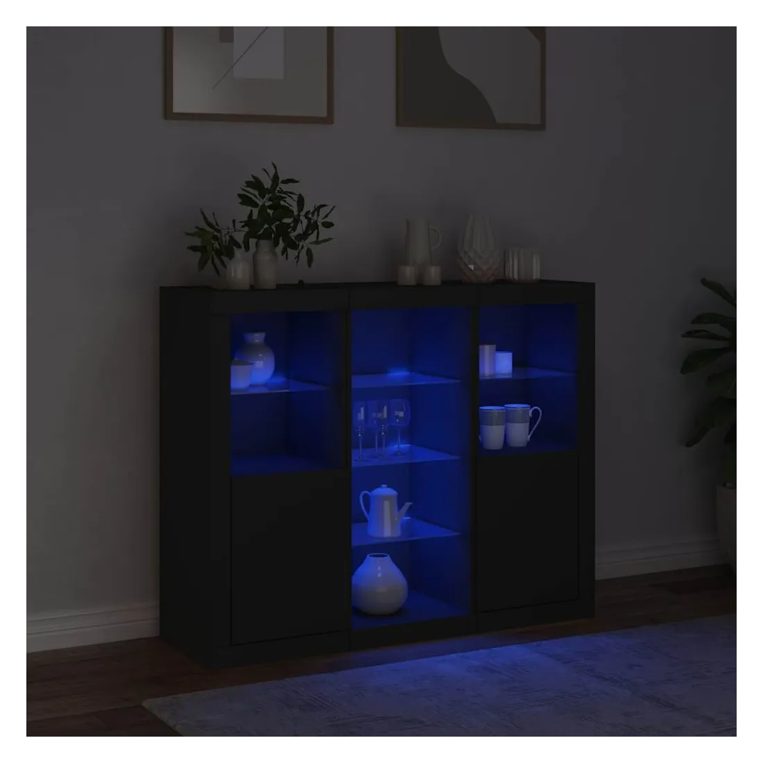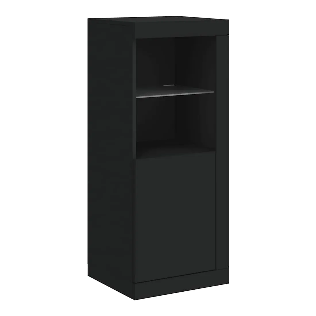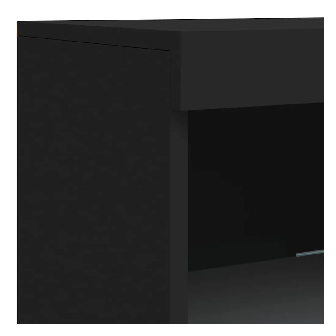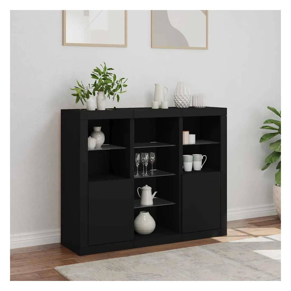 Décorez votre pièce avec ces buffets modernes à éclairage LED qui s'harmonisent facilement avec les meubles de tout style de votre maison. Matériau durable : le bois d'ingénierie est d'une qualité exceptionnelle avec une surface lisse et présente également résistance, stabilité et résistance à l'humidité.Grand espace de rangement : ces buffets offrent un grand espace de rangement pour garder vos magazines, livres, télécommandes et autres petits objets bien organisés et à portée de main.Fonction d'affichage : le dessus de ces buffets est idéal pour afficher des objets décoratifs, des cadres photo ou des plantes en pot.Lumières LED réglables : ces armoires de rangement sont équipées de lumières LED RVB, qui ont différents menus pour changer la couleur de la lumière et l'ajuster automatiquement, décorant votre maison de manière colorée et belle. Attention :Pour éviter qu'il ne soit renversé, ce produit doit être utilisé avec le dispositif de fixation au mur fourni.Bon à savoir :Ce produit est doté d'un connecteur USB qui nécessite une source d'alimentation USB de 5V certifiée (non incluse).