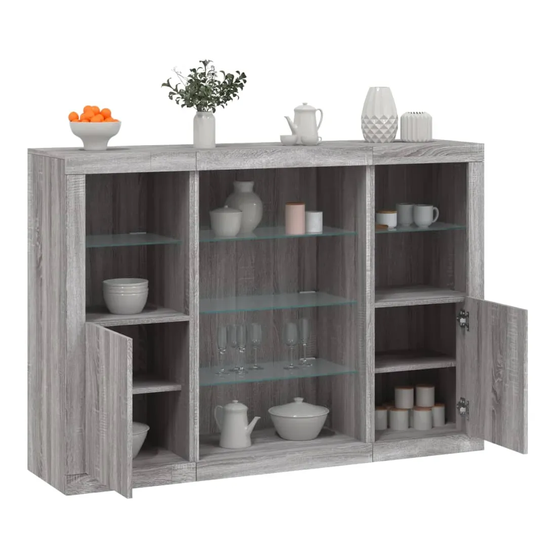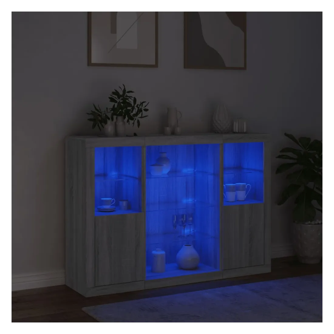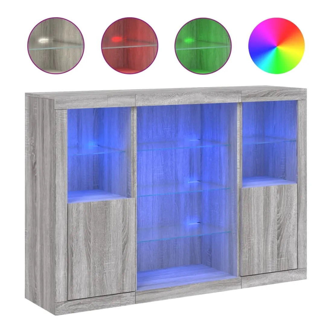 Décorez votre pièce avec ces buffets modernes à éclairage LED qui s'harmonisent facilement avec les meubles de tout style de votre maison. Matériau haute de gamme : le bois d'ingénierie est d'une qualité exceptionnelle avec une surface lisse et présente également résistance, stabilité et résistance à l'humidité.Grand espace de rangement : ces buffets offrent un grand espace de rangement pour garder vos magazines, livres, télécommandes et autres petits objets bien organisés et à portée de main.Fonction d'affichage : le dessus de ces buffets est idéal pour afficher des objets décoratifs, des cadres photo ou des plantes en pot.Lumières LED réglables : ces armoires de rangement sont équipées de lumières LED RVB, qui ont différents menus pour changer la couleur de la lumière et l'ajuster automatiquement, décorant votre maison de manière colorée et belle. Attention :Pour éviter qu'il ne soit renversé, ce produit doit être utilisé avec le dispositif de fixation au mur fourni.Bon à savoir :Ce produit est doté d'un connecteur USB qui nécessite une source d'alimentation certifiée de USB 5V (non incluse).