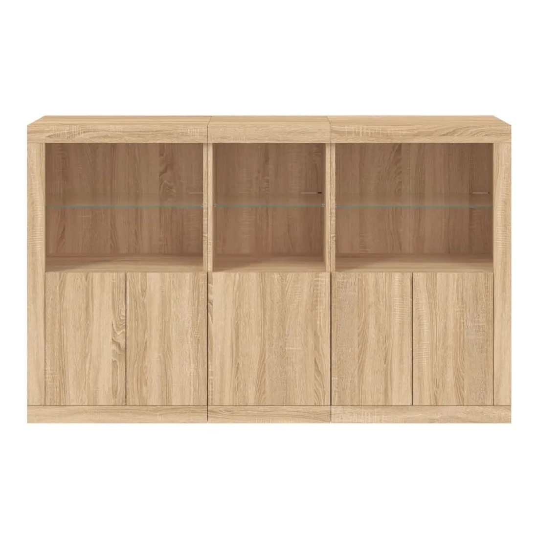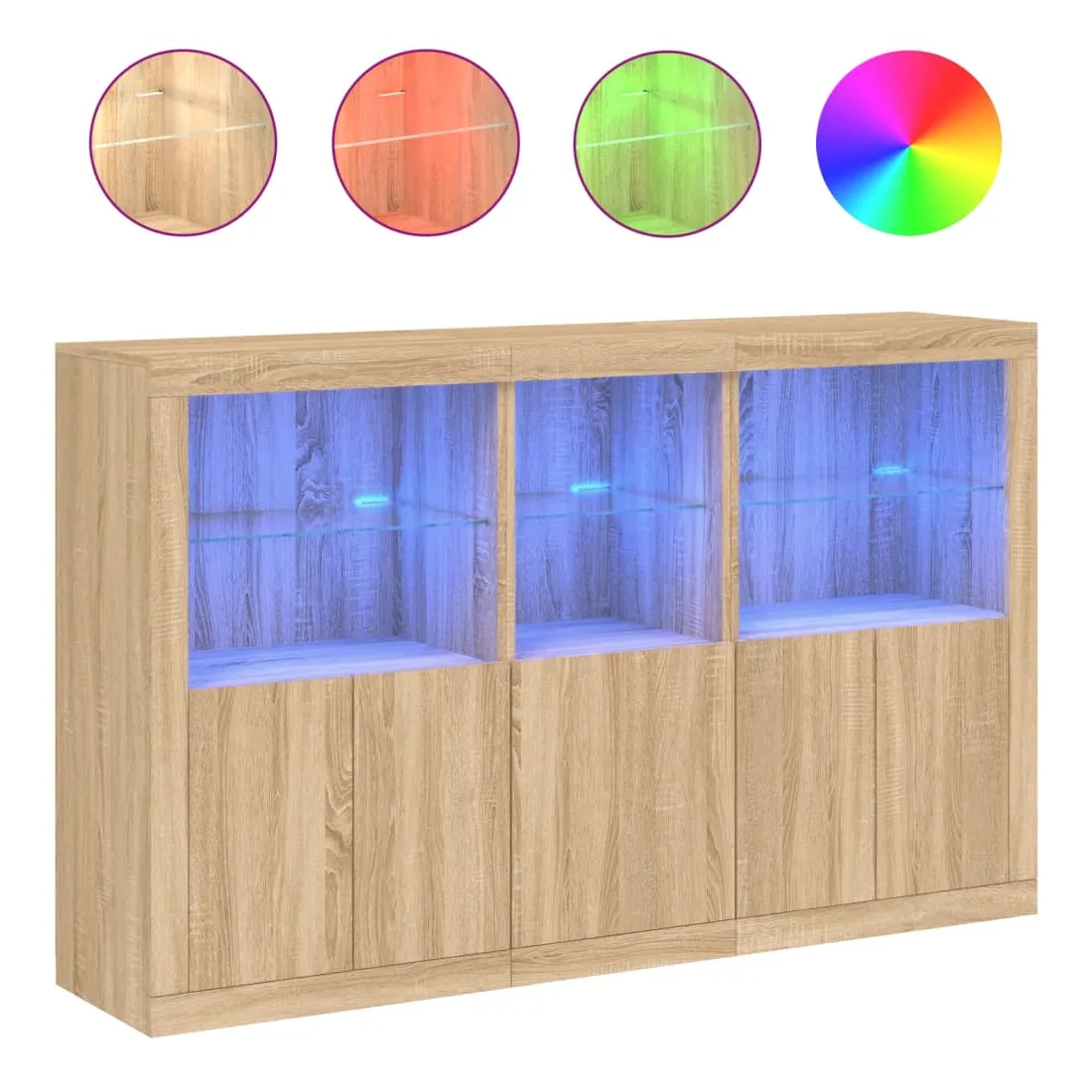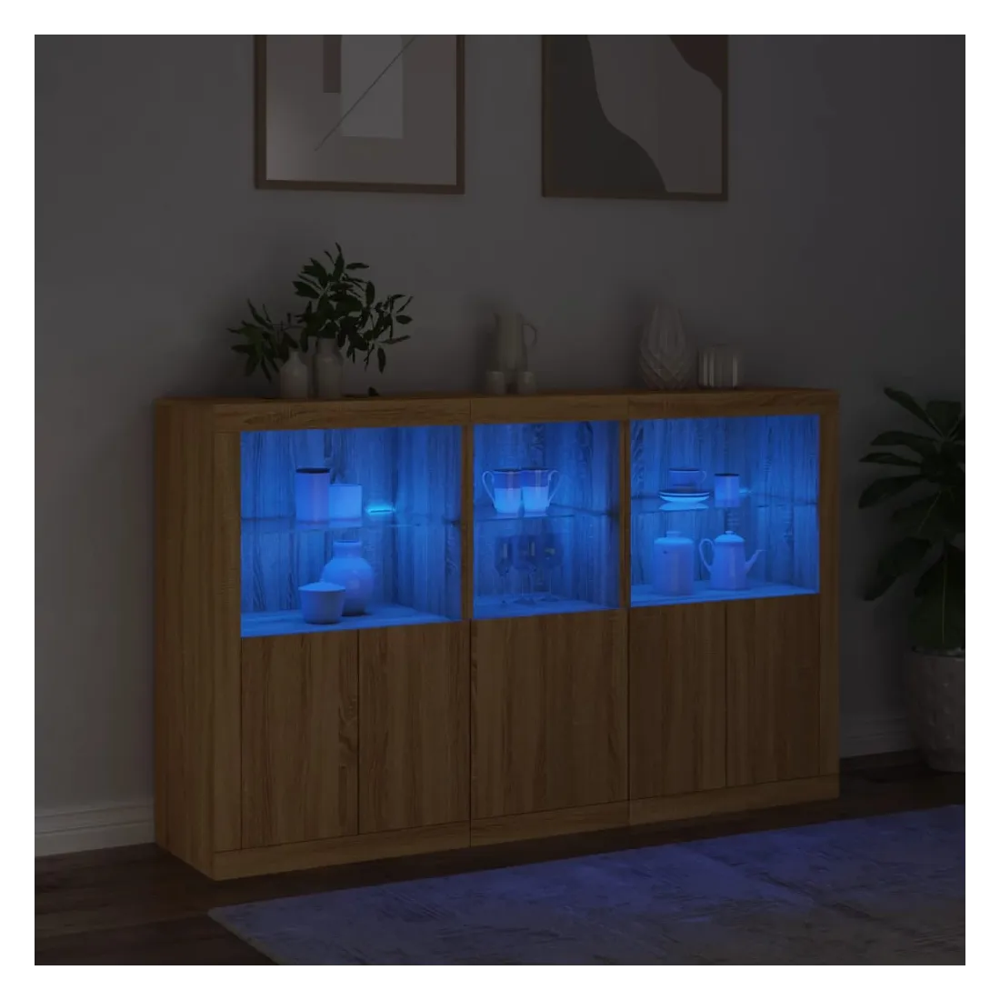 Décorez votre pièce avec ce buffet moderne avec éclairage LED, il s'harmonise facilement avec les meubles de tout style de votre maison. Matériau durable : le bois d'ingénierie est d'une qualité exceptionnelle avec une surface lisse et présente également résistance, stabilité et résistance à l'humidité.Lumières LED RVB : le buffet est équipé de lumières LED RVB vibrantes. Avec divers menus personnalisables, vous pouvez changer sans effort la couleur des lumières et même les régler automatiquement. Ces lumières LED renforcent non seulement l'aspect contemporain du buffet, mais aussi son attrait pour la mode.Grand espace de rangement : l'armoire de rangement offre beaucoup d'espace pour garder vos objets du quotidien bien rangés et facilement accessibles.Fonction d'exposition : la partie supérieure robuste de l'armoire d'entrée est idéale pour exposer des objets décoratifs, des cadres photo ou des plantes en pot.Porte pratiques : gardez vos essentiels à l'abri de la poussière en les cachant derrière les portes de l'armoire latérale. Bon à savoir :Ce produit est doté d'un connecteur USB qui nécessite une source d'alimentation USB de 5V certifiée (non incluse). Attention :Pour éviter qu'il ne soit renversé, ce produit doit être utilisé avec le dispositif de fixation au mur fourni.