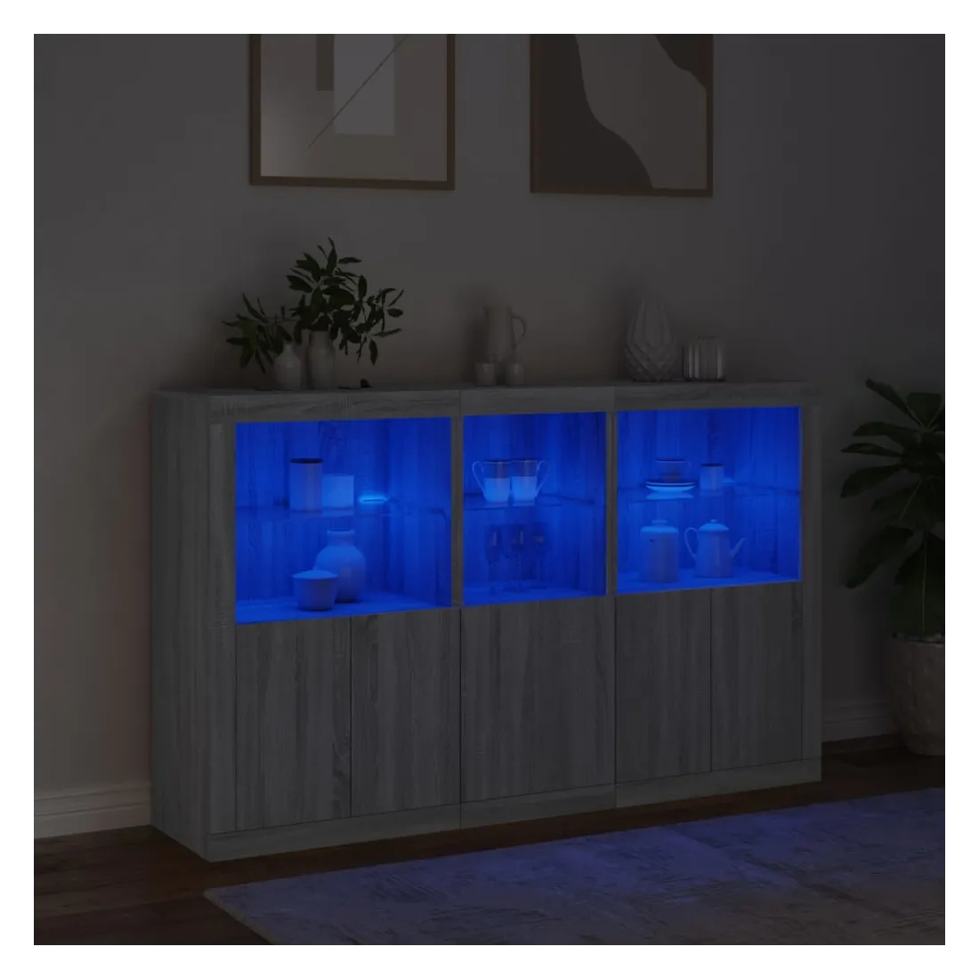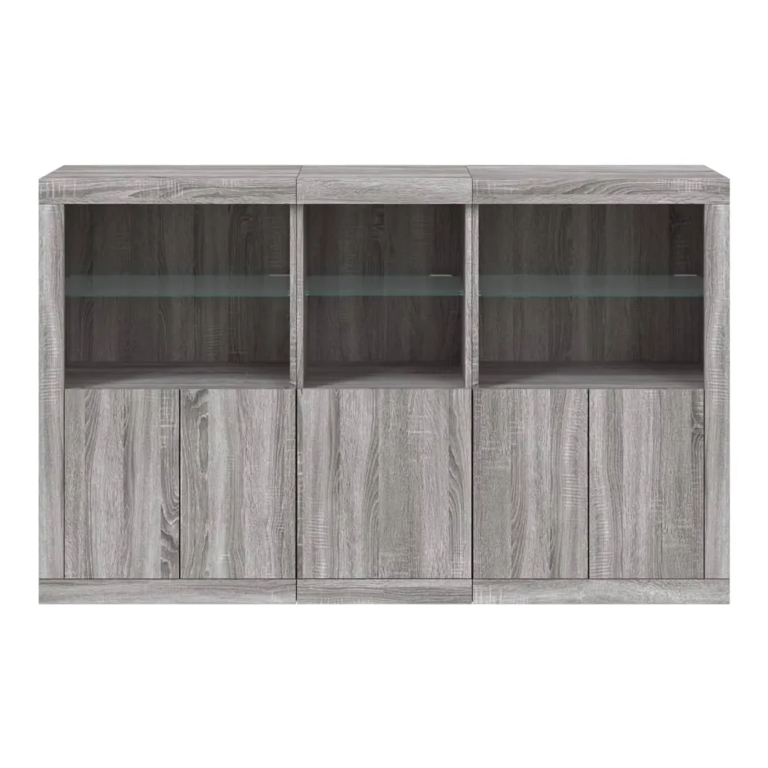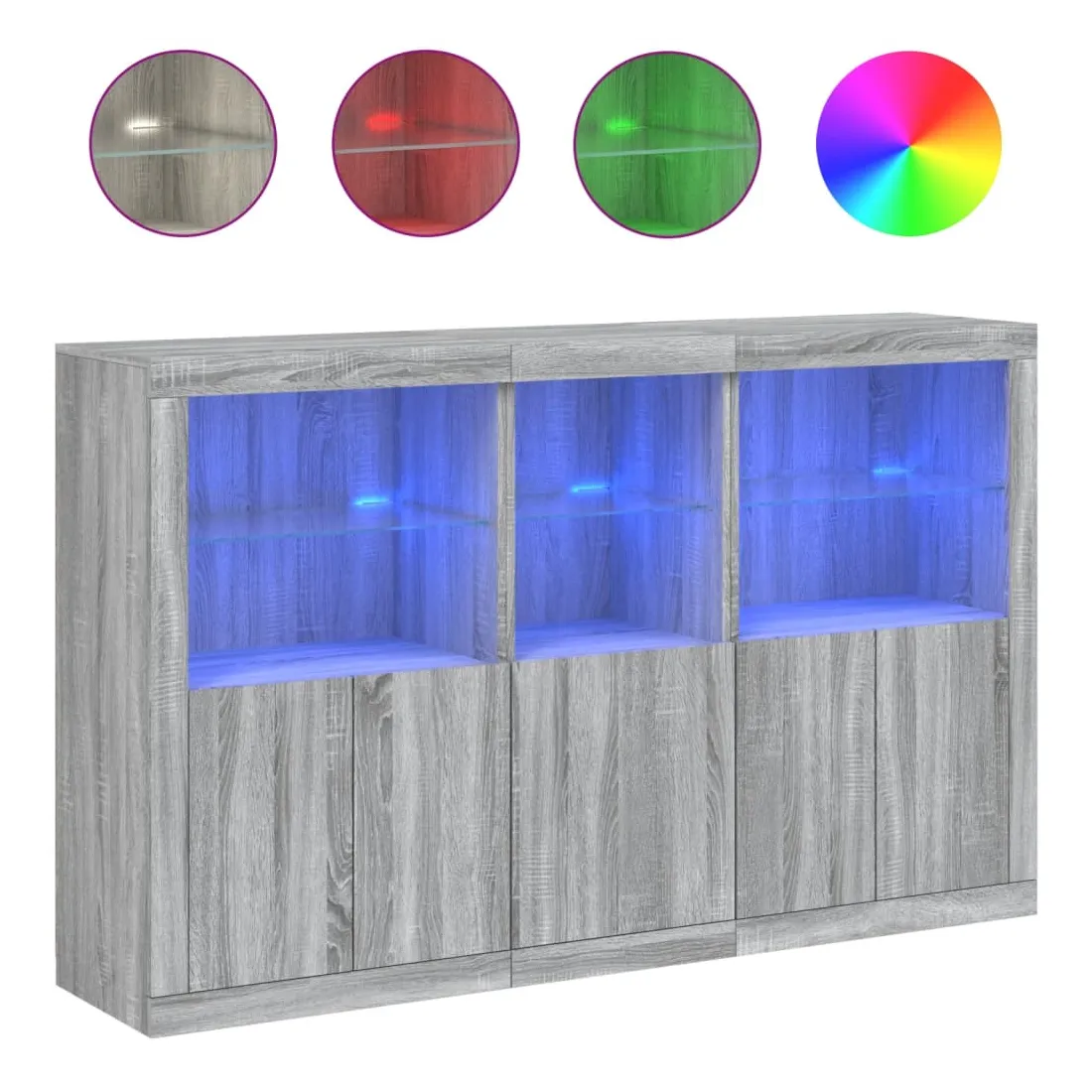 Décorez votre pièce avec ce buffet moderne avec éclairage LED, il s'harmonise facilement avec les meubles de tout style de votre maison. Matériau durable : le bois d'ingénierie est d'une qualité exceptionnelle avec une surface lisse et présente également résistance, stabilité et résistance à l'humidité.Lumières LED RVB : le buffet est équipé de lumières LED RVB vibrantes. Avec divers menus personnalisables, vous pouvez changer sans effort la couleur des lumières et même les régler automatiquement. Ces lumières LED renforcent non seulement l'aspect contemporain du buffet, mais aussi son attrait pour la mode.Grand espace de rangement : l'armoire de rangement offre beaucoup d'espace pour garder vos objets du quotidien bien rangés et facilement accessibles.Fonction d'exposition : la partie supérieure robuste de l'armoire d'entrée est idéale pour exposer des objets décoratifs, des cadres photo ou des plantes en pot.Porte pratiques : gardez vos essentiels à l'abri de la poussière en les cachant derrière les portes de l'armoire latérale. Bon à savoir :Ce produit est doté d'un connecteur USB qui nécessite une source d'alimentation USB de 5V certifiée (non incluse). Attention :Pour éviter qu'il ne soit renversé, ce produit doit être utilisé avec le dispositif de fixation au mur fourni.