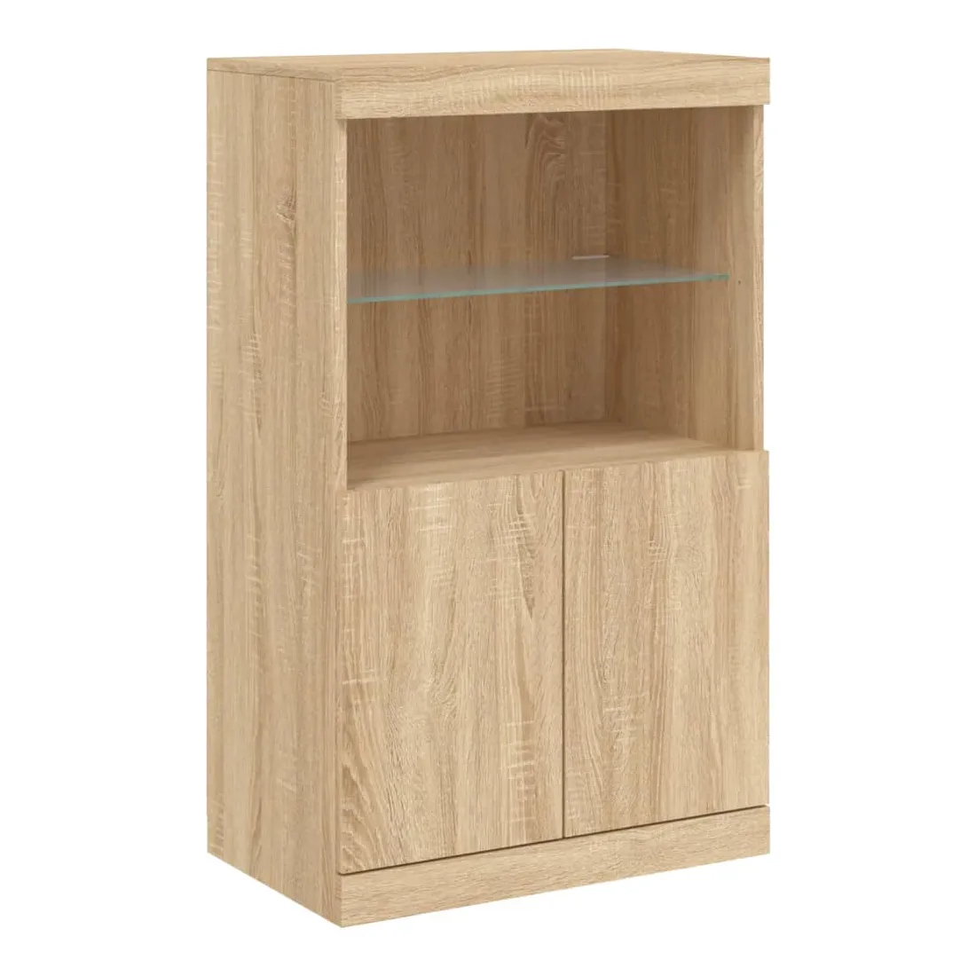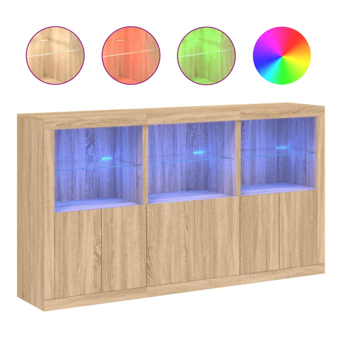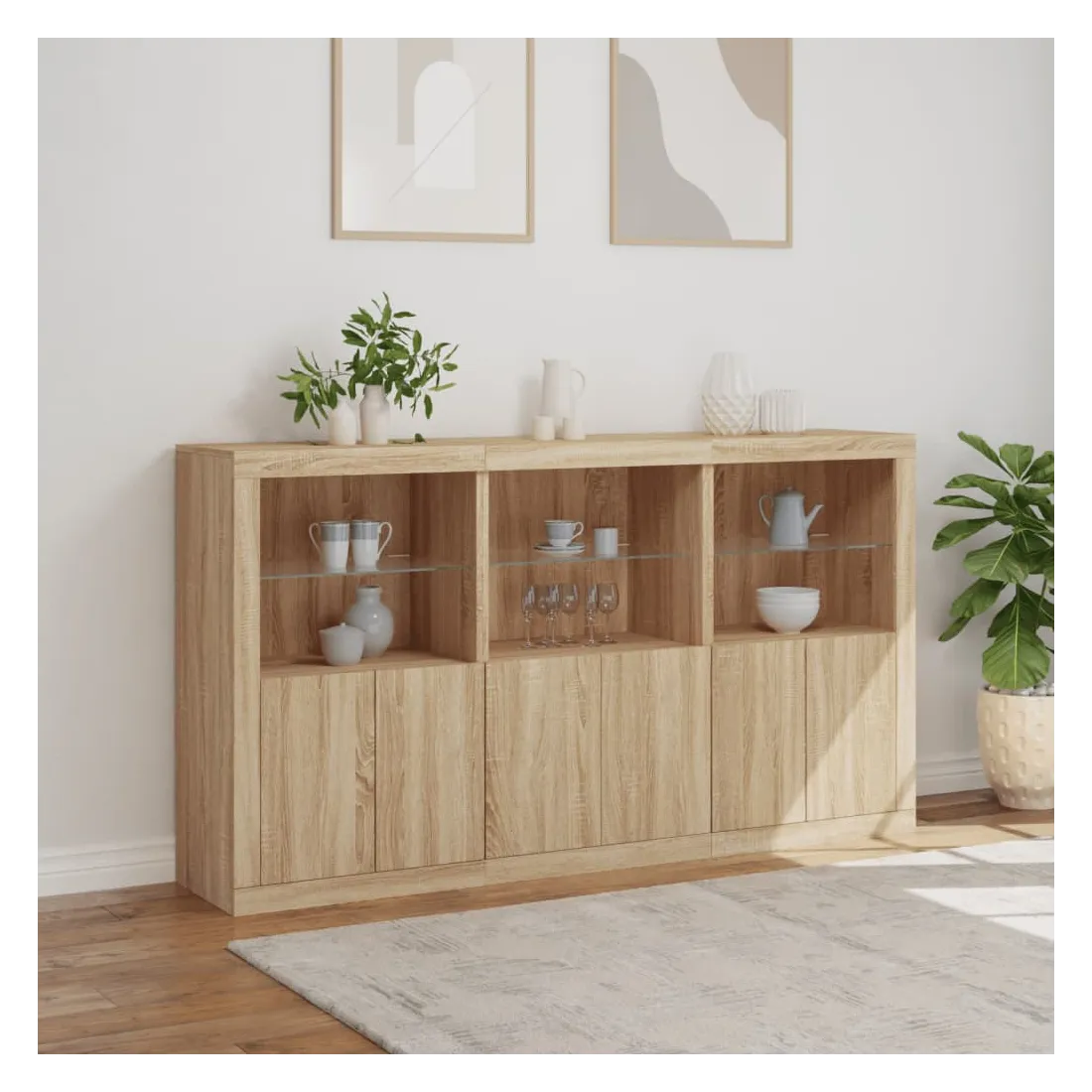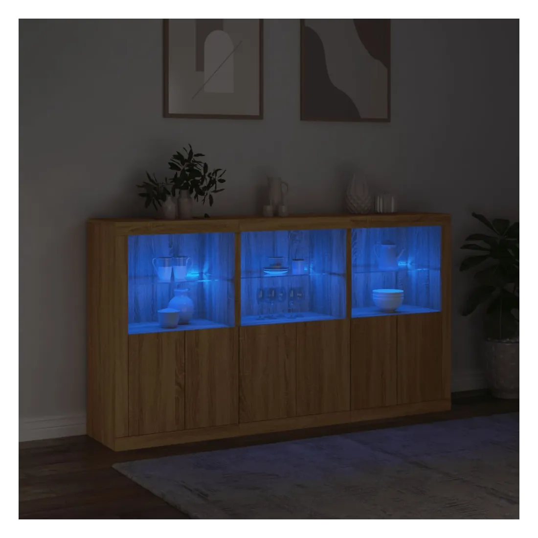 Décorez votre pièce avec ce buffet moderne avec éclairage LED, il s'harmonise facilement avec les meubles de tout style de votre maison. Matériau durable : le bois d'ingénierie est d'une qualité exceptionnelle avec une surface lisse et présente également résistance, stabilité et résistance à l'humidité.Lumières LED RVB : le buffet est équipé de lumières LED RVB vibrantes. Avec divers menus personnalisables, vous pouvez changer sans effort la couleur des lumières et même les régler automatiquement. Ces lumières LED renforcent non seulement l'aspect contemporain du buffet, mais aussi son attrait pour la mode.Grand espace de rangement : l'armoire de rangement offre beaucoup d'espace pour garder vos objets du quotidien bien rangés et facilement accessibles.Fonction d'exposition : la partie supérieure robuste de l'armoire d'entrée est idéale pour exposer des objets décoratifs, des cadres photo ou des plantes en pot.Porte pratiques : gardez vos essentiels à l'abri de la poussière en les cachant derrière les portes de l'armoire latérale. Bon à savoir :Ce produit est doté d'un connecteur USB qui nécessite une source d'alimentation USB de 5V certifiée (non incluse). Attention :Pour éviter qu'il ne soit renversé, ce produit doit être utilisé avec le dispositif de fixation au mur fourni.