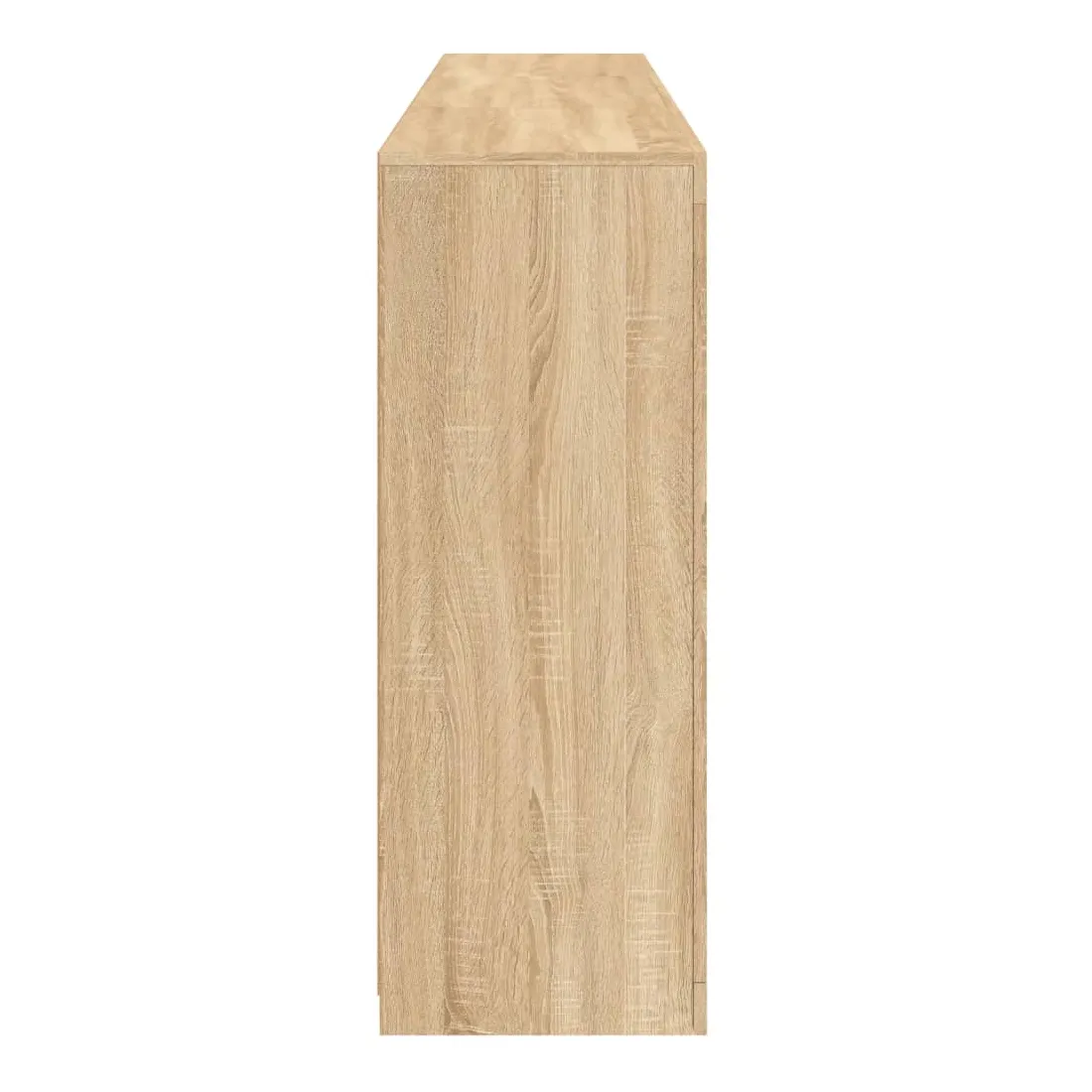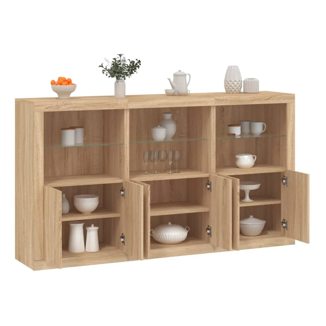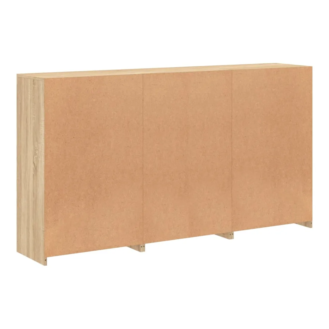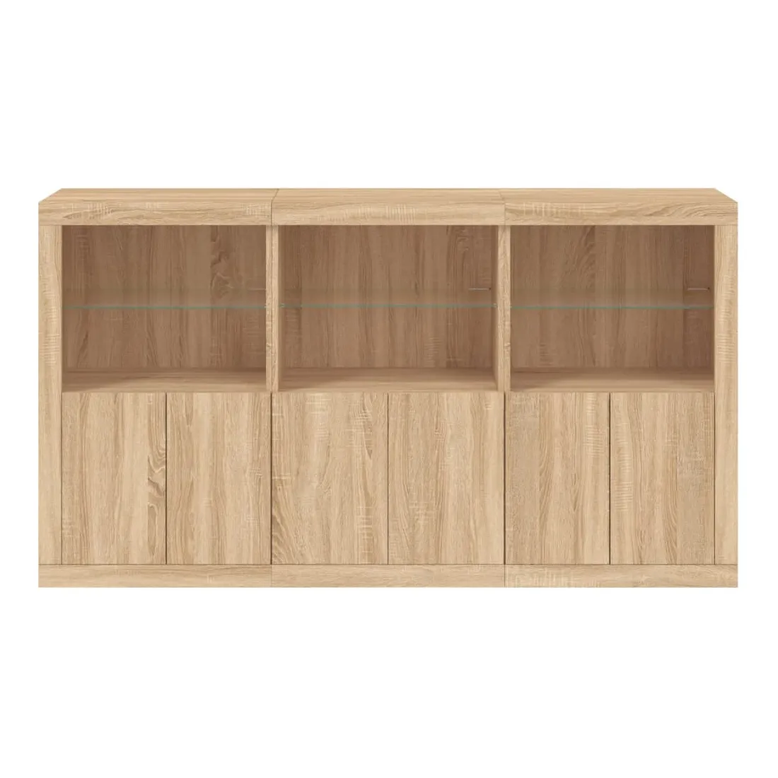 Décorez votre pièce avec ce buffet moderne avec éclairage LED, il s'harmonise facilement avec les meubles de tout style de votre maison. Matériau durable : le bois d'ingénierie est d'une qualité exceptionnelle avec une surface lisse et présente également résistance, stabilité et résistance à l'humidité.Lumières LED RVB : le buffet est équipé de lumières LED RVB vibrantes. Avec divers menus personnalisables, vous pouvez changer sans effort la couleur des lumières et même les régler automatiquement. Ces lumières LED renforcent non seulement l'aspect contemporain du buffet, mais aussi son attrait pour la mode.Grand espace de rangement : l'armoire de rangement offre beaucoup d'espace pour garder vos objets du quotidien bien rangés et facilement accessibles.Fonction d'exposition : la partie supérieure robuste de l'armoire d'entrée est idéale pour exposer des objets décoratifs, des cadres photo ou des plantes en pot.Porte pratiques : gardez vos essentiels à l'abri de la poussière en les cachant derrière les portes de l'armoire latérale. Bon à savoir :Ce produit est doté d'un connecteur USB qui nécessite une source d'alimentation USB de 5V certifiée (non incluse). Attention :Pour éviter qu'il ne soit renversé, ce produit doit être utilisé avec le dispositif de fixation au mur fourni.