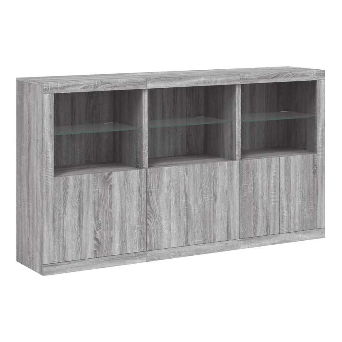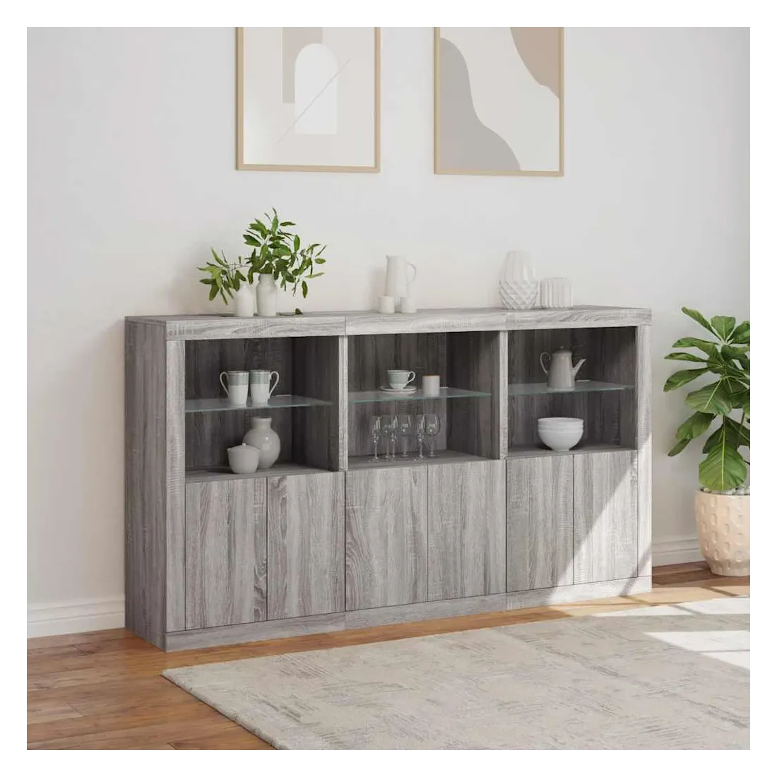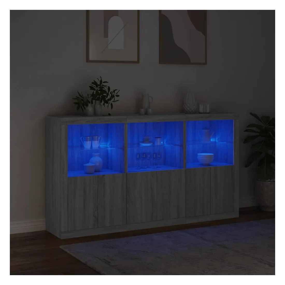 Décorez votre pièce avec ce buffet moderne avec éclairage LED, il s'harmonise facilement avec les meubles de tout style de votre maison. Matériau durable : le bois d'ingénierie est d'une qualité exceptionnelle avec une surface lisse et présente également résistance, stabilité et résistance à l'humidité.Lumières LED RVB : le buffet est équipé de lumières LED RVB vibrantes. Avec divers menus personnalisables, vous pouvez changer sans effort la couleur des lumières et même les régler automatiquement. Ces lumières LED renforcent non seulement l'aspect contemporain du buffet, mais aussi son attrait pour la mode.Grand espace de rangement : l'armoire de rangement offre beaucoup d'espace pour garder vos objets du quotidien bien rangés et facilement accessibles.Fonction d'exposition : la partie supérieure robuste de l'armoire d'entrée est idéale pour exposer des objets décoratifs, des cadres photo ou des plantes en pot.Porte pratiques : gardez vos essentiels à l'abri de la poussière en les cachant derrière les portes de l'armoire latérale. Bon à savoir :Ce produit est doté d'un connecteur USB qui nécessite une source d'alimentation USB de 5V certifiée (non incluse). Attention :Pour éviter qu'il ne soit renversé, ce produit doit être utilisé avec le dispositif de fixation au mur fourni.