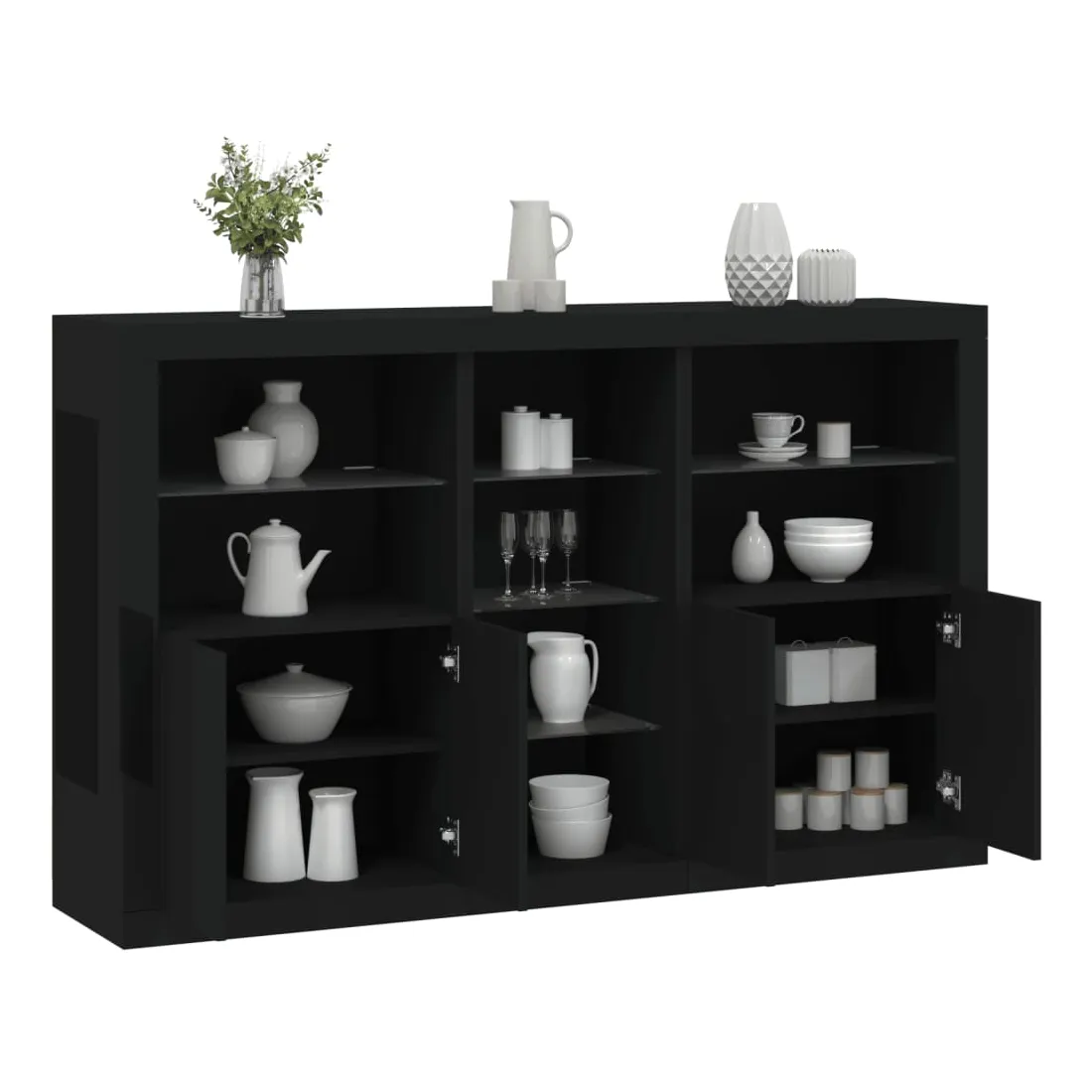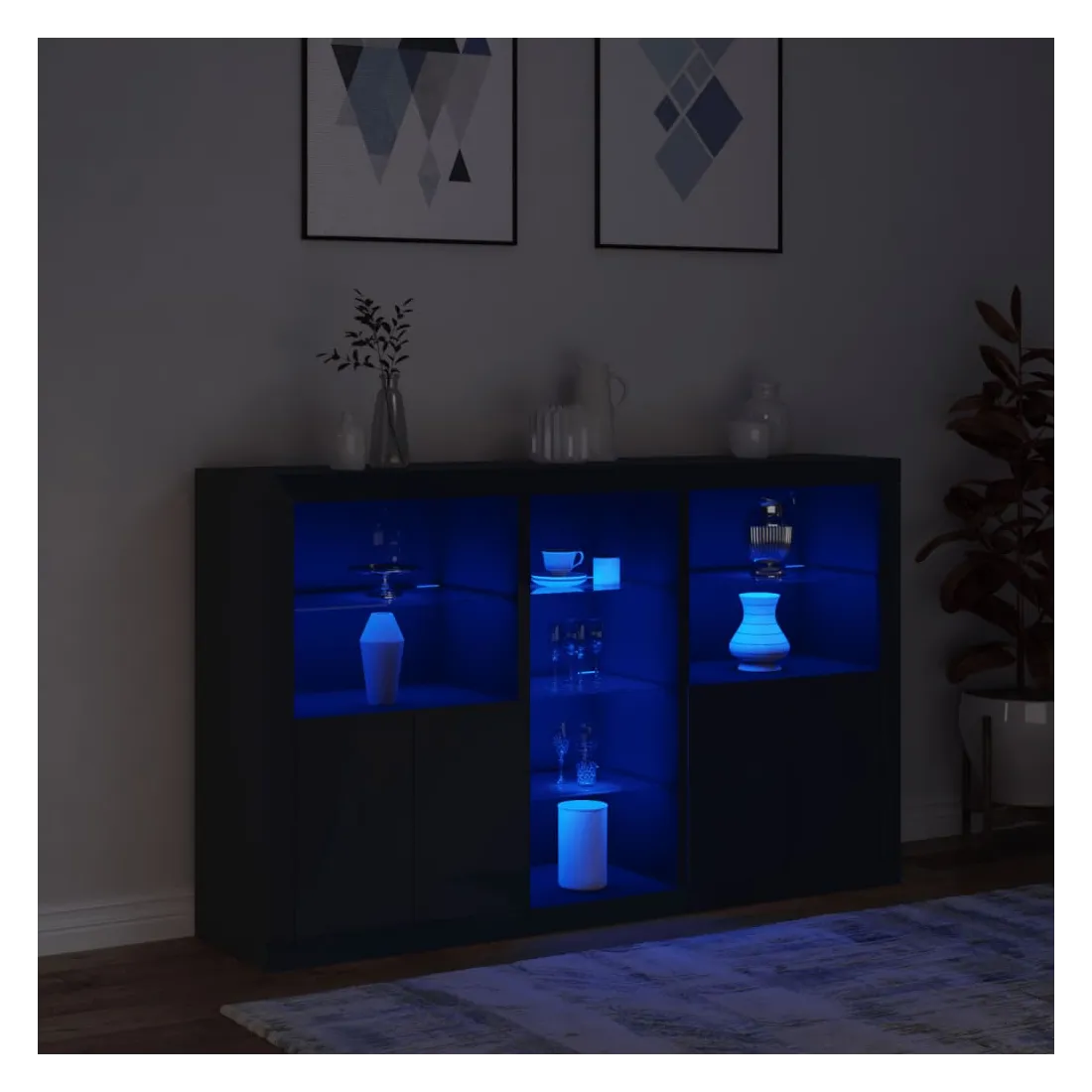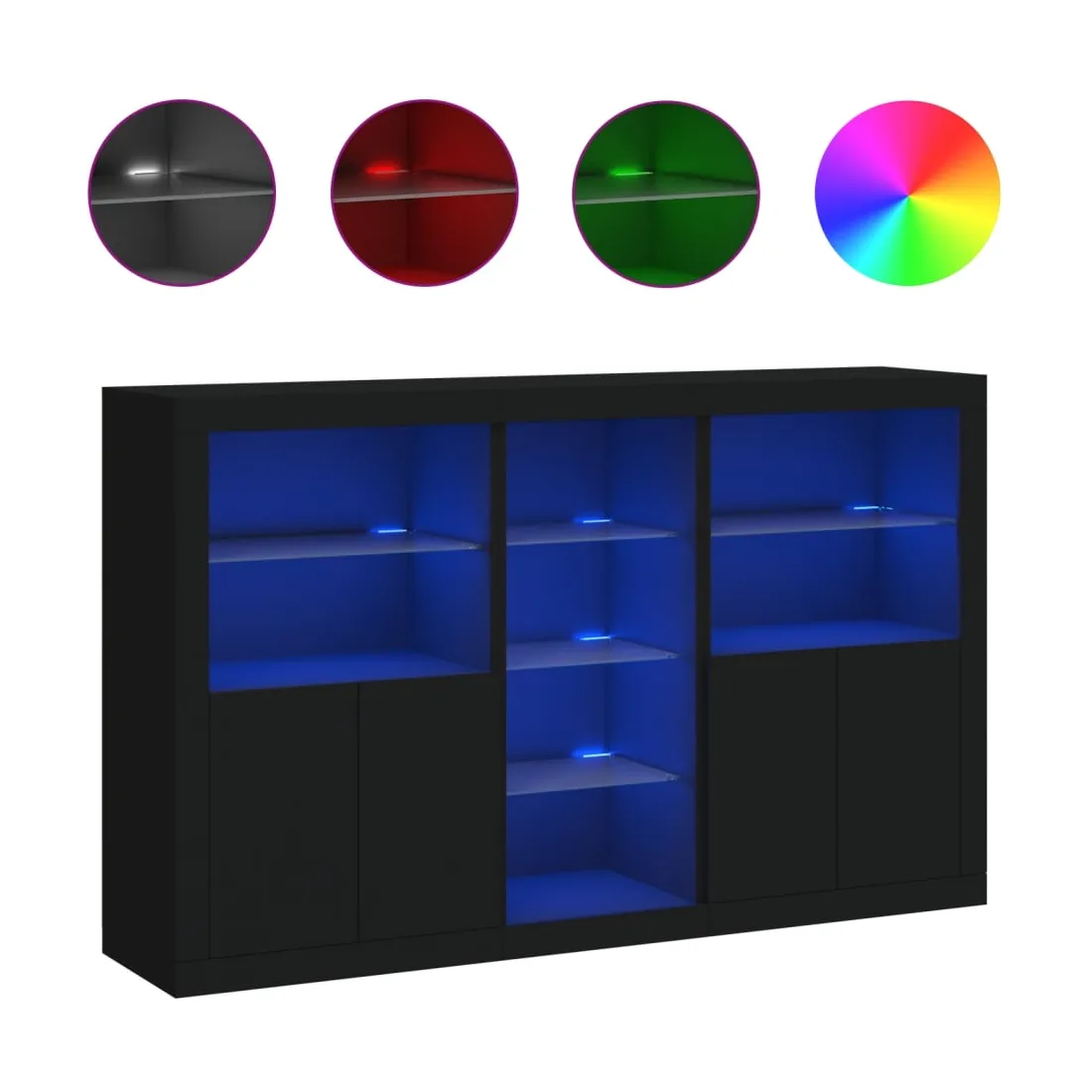 Décorez votre pièce avec ce buffet moderne avec éclairage LED, il s'harmonise facilement avec les meubles de tout style de votre maison. Matériau durable : le bois d'ingénierie est d'une qualité exceptionnelle avec une surface lisse et présente également résistance, stabilité et résistance à l'humidité.Lumières LED RVB : le buffet est équipé de lumières LED RVB vibrantes. Avec divers menus personnalisables, vous pouvez changer sans effort la couleur des lumières et même les régler automatiquement. Ces lumières LED renforcent non seulement l'aspect contemporain du buffet, mais aussi son attrait pour la mode.Grand espace de rangement : l'armoire de rangement offre beaucoup d'espace pour garder vos objets du quotidien bien rangés et facilement accessibles.Fonction d'exposition : la partie supérieure robuste de l'armoire d'entrée est idéale pour exposer des objets décoratifs, des cadres photo ou des plantes en pot.Porte pratiques : gardez vos essentiels à l'abri de la poussière en les cachant derrière les portes de l'armoire latérale. Bon à savoir :Ce produit est doté d'un connecteur USB qui nécessite une source d'alimentation USB de 5V certifiée (non incluse). Attention :Pour éviter qu'il ne soit renversé, ce produit doit être utilisé avec le dispositif de fixation au mur fourni.