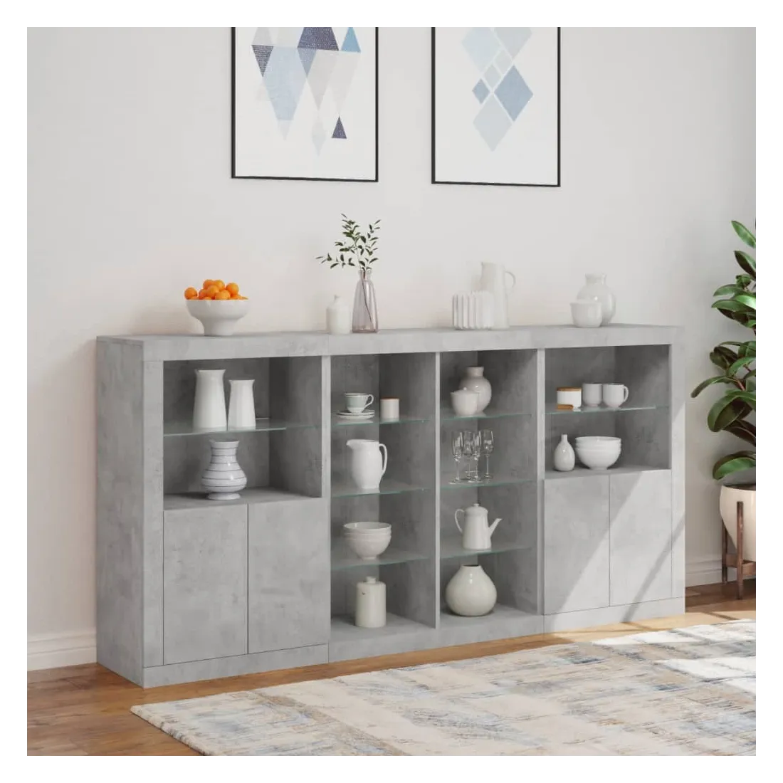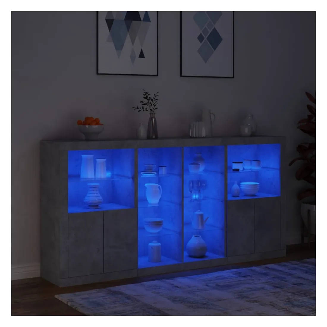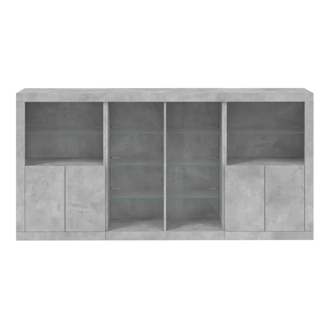 Décorez votre pièce avec ce buffet moderne avec éclairage LED, il s'harmonise facilement avec les meubles de tout style de votre maison. Matériau durable : le bois d'ingénierie est d'une qualité exceptionnelle avec une surface lisse et présente également résistance, stabilité et résistance à l'humidité.Lumières LED RVB : le buffet est équipé de lumières LED RVB vibrantes. Avec divers menus personnalisables, vous pouvez changer sans effort la couleur des lumières et même les régler automatiquement. Ces lumières LED renforcent non seulement l'aspect contemporain du buffet, mais aussi son attrait pour la mode.Grand espace de rangement : l'armoire de rangement offre beaucoup d'espace pour garder vos objets du quotidien bien rangés et facilement accessibles.Fonction d'exposition : la partie supérieure robuste de l'armoire d'entrée est idéale pour exposer des objets décoratifs, des cadres photo ou des plantes en pot.Porte pratiques : gardez vos essentiels à l'abri de la poussière en les cachant derrière les portes de l'armoire latérale. Bon à savoir :Ce produit est doté d'un connecteur USB qui nécessite une source d'alimentation USB de 5V certifiée (non incluse). Attention :Pour éviter qu'il ne soit renversé, ce produit doit être utilisé avec le dispositif de fixation au mur fourni.