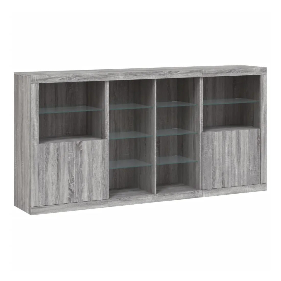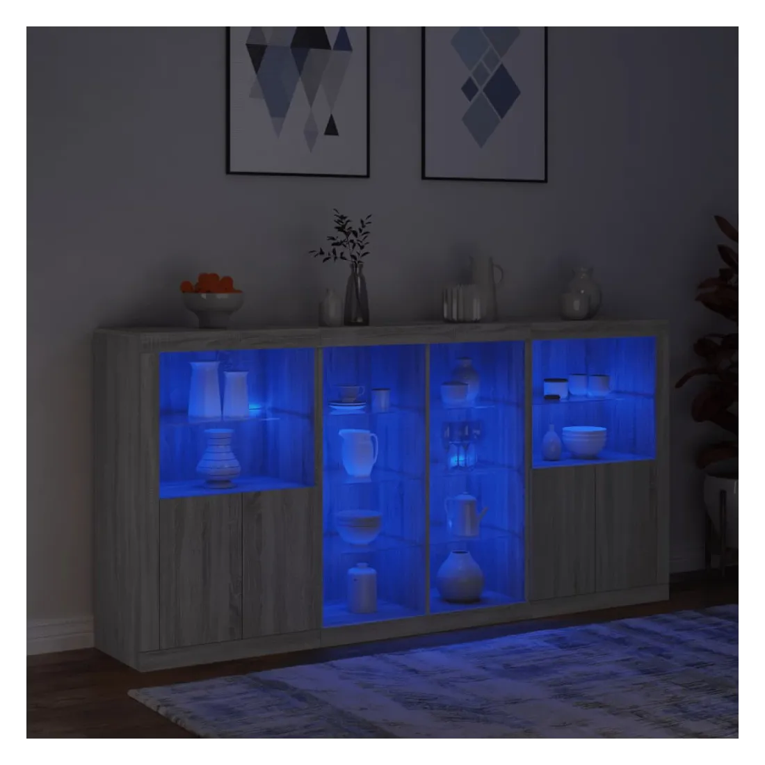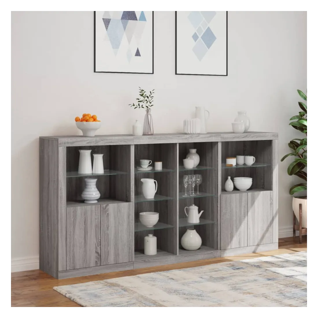 Décorez votre pièce avec ce buffet moderne avec éclairage LED, il s'harmonise facilement avec les meubles de tout style de votre maison. Matériau durable : le bois d'ingénierie est d'une qualité exceptionnelle avec une surface lisse et présente également résistance, stabilité et résistance à l'humidité.Lumières LED RVB : le buffet est équipé de lumières LED RVB vibrantes. Avec divers menus personnalisables, vous pouvez changer sans effort la couleur des lumières et même les régler automatiquement. Ces lumières LED renforcent non seulement l'aspect contemporain du buffet, mais aussi son attrait pour la mode.Grand espace de rangement : l'armoire de rangement offre beaucoup d'espace pour garder vos objets du quotidien bien rangés et facilement accessibles.Fonction d'exposition : la partie supérieure robuste de l'armoire d'entrée est idéale pour exposer des objets décoratifs, des cadres photo ou des plantes en pot.Porte pratiques : gardez vos essentiels à l'abri de la poussière en les cachant derrière les portes de l'armoire latérale. Bon à savoir :Ce produit est doté d'un connecteur USB qui nécessite une source d'alimentation USB de 5V certifiée (non incluse). Attention :Pour éviter qu'il ne soit renversé, ce produit doit être utilisé avec le dispositif de fixation au mur fourni.