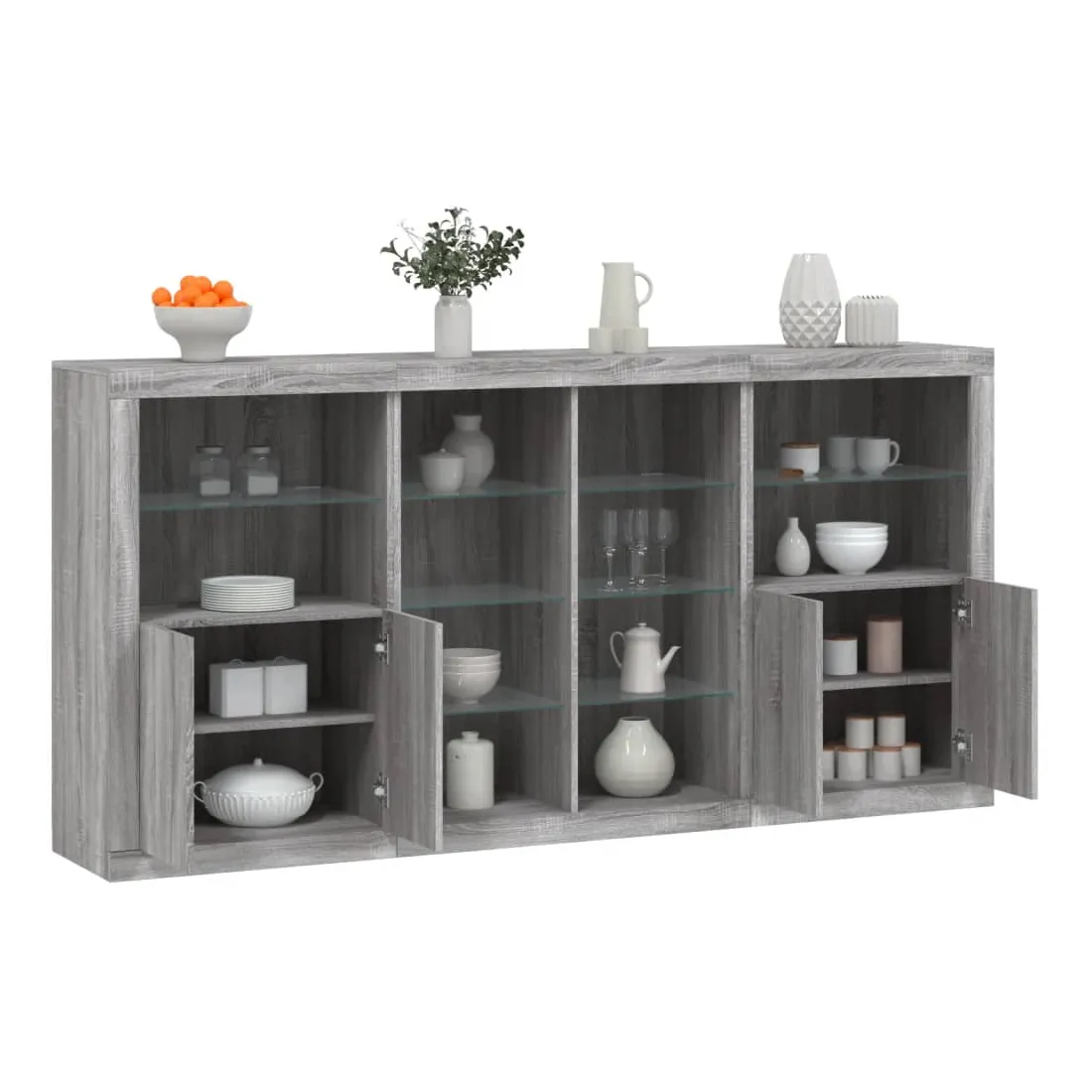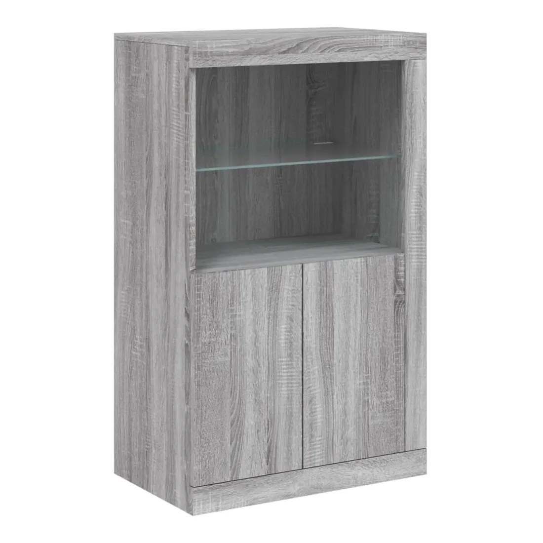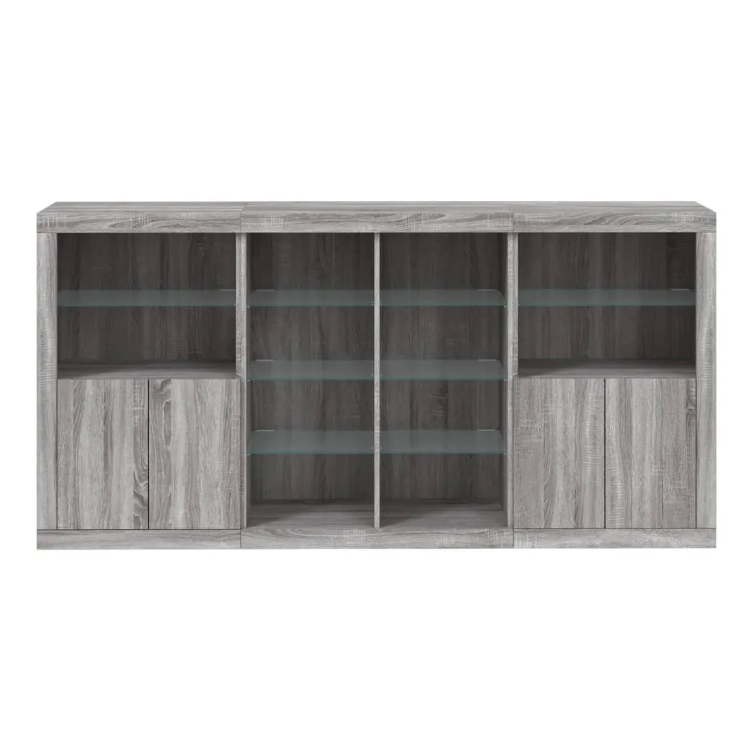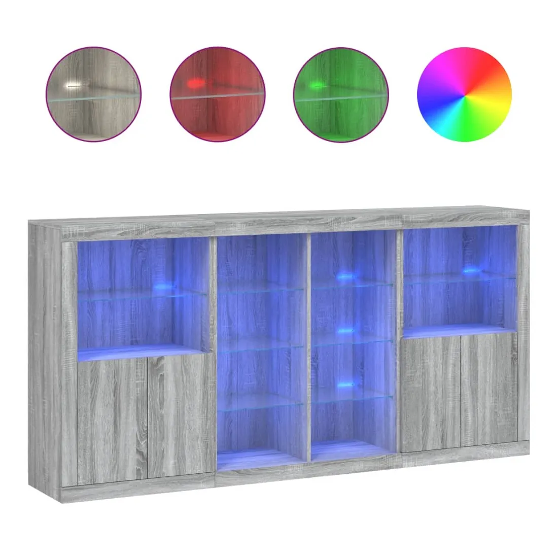 Décorez votre pièce avec ce buffet moderne avec éclairage LED, il s'harmonise facilement avec les meubles de tout style de votre maison. Matériau durable : le bois d'ingénierie est d'une qualité exceptionnelle avec une surface lisse et présente également résistance, stabilité et résistance à l'humidité.Lumières LED RVB : le buffet est équipé de lumières LED RVB vibrantes. Avec divers menus personnalisables, vous pouvez changer sans effort la couleur des lumières et même les régler automatiquement. Ces lumières LED renforcent non seulement l'aspect contemporain du buffet, mais aussi son attrait pour la mode.Grand espace de rangement : l'armoire de rangement offre beaucoup d'espace pour garder vos objets du quotidien bien rangés et facilement accessibles.Fonction d'exposition : la partie supérieure robuste de l'armoire d'entrée est idéale pour exposer des objets décoratifs, des cadres photo ou des plantes en pot.Porte pratiques : gardez vos essentiels à l'abri de la poussière en les cachant derrière les portes de l'armoire latérale. Bon à savoir :Ce produit est doté d'un connecteur USB qui nécessite une source d'alimentation USB de 5V certifiée (non incluse). Attention :Pour éviter qu'il ne soit renversé, ce produit doit être utilisé avec le dispositif de fixation au mur fourni.