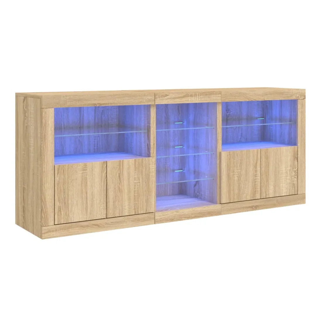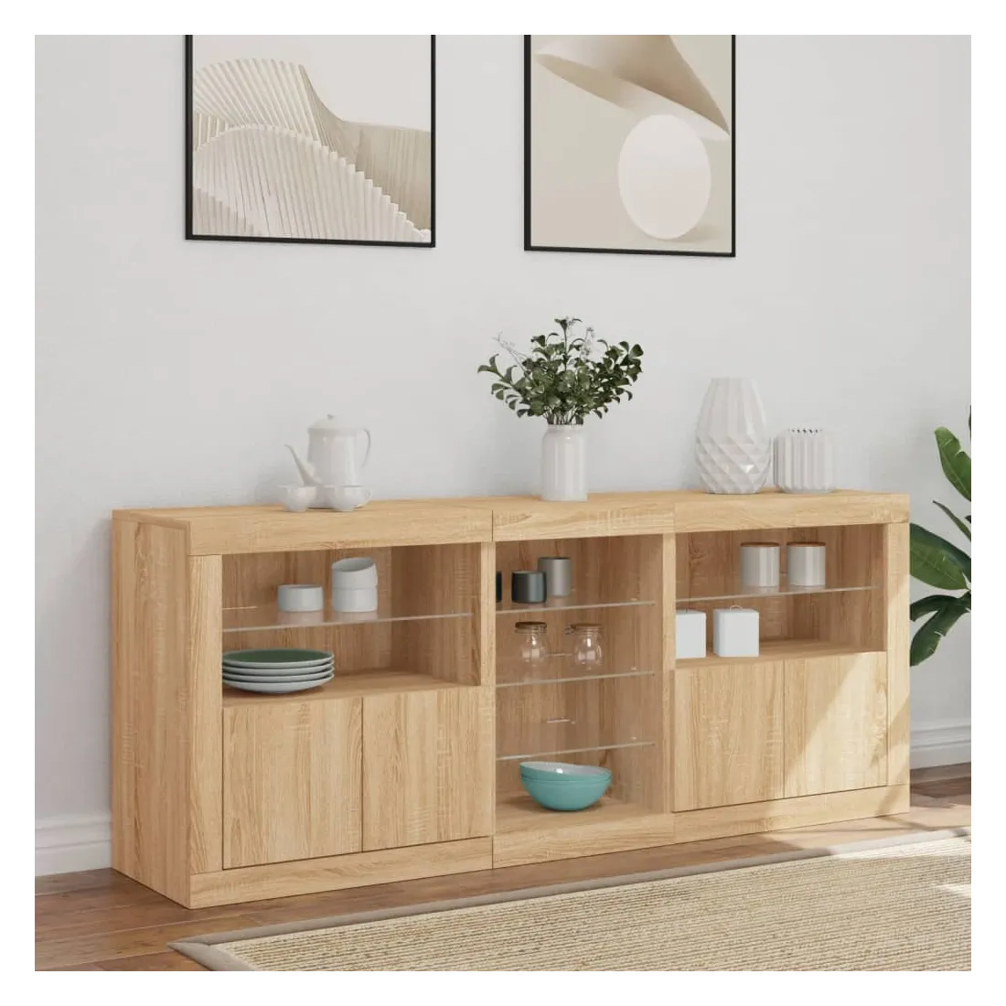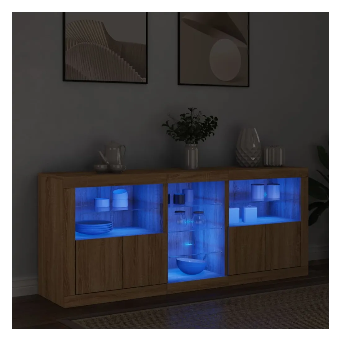 Décorez votre pièce avec ce buffet moderne avec éclairage LED, il s'harmonise facilement avec les meubles de tout style de votre maison. Matériau durable : le bois d'ingénierie est d'une qualité exceptionnelle avec une surface lisse et présente également résistance, stabilité et résistance à l'humidité.Lumières LED RVB : le buffet est équipé de lumières LED RVB vibrantes. Avec divers menus personnalisables, vous pouvez changer sans effort la couleur des lumières et même les régler automatiquement. Ces lumières LED renforcent non seulement l'aspect contemporain du buffet, mais aussi son attrait pour la mode.Grand espace de rangement : l'armoire de rangement offre beaucoup d'espace pour garder vos objets du quotidien bien rangés et facilement accessibles.Fonction d'exposition : la partie supérieure robuste de l'armoire d'entrée est idéale pour exposer des objets décoratifs, des cadres photo ou des plantes en pot.Porte pratiques : gardez vos essentiels à l'abri de la poussière en les cachant derrière les portes de l'armoire latérale. Bon à savoir :Ce produit est doté d'un connecteur USB qui nécessite une source d'alimentation USB de 5V certifiée (non incluse). Attention :Pour éviter qu'il ne soit renversé, ce produit doit être utilisé avec le dispositif de fixation au mur fourni.