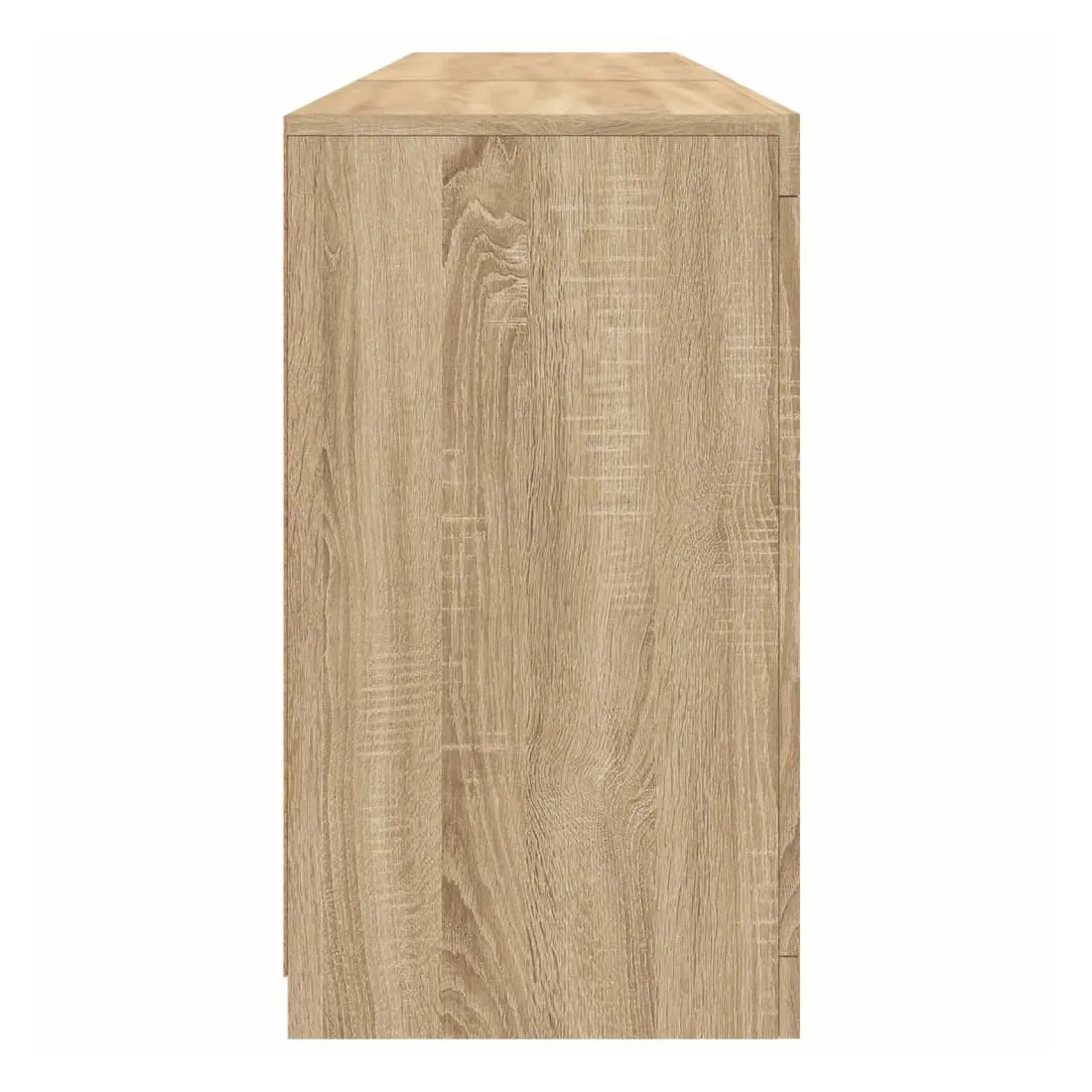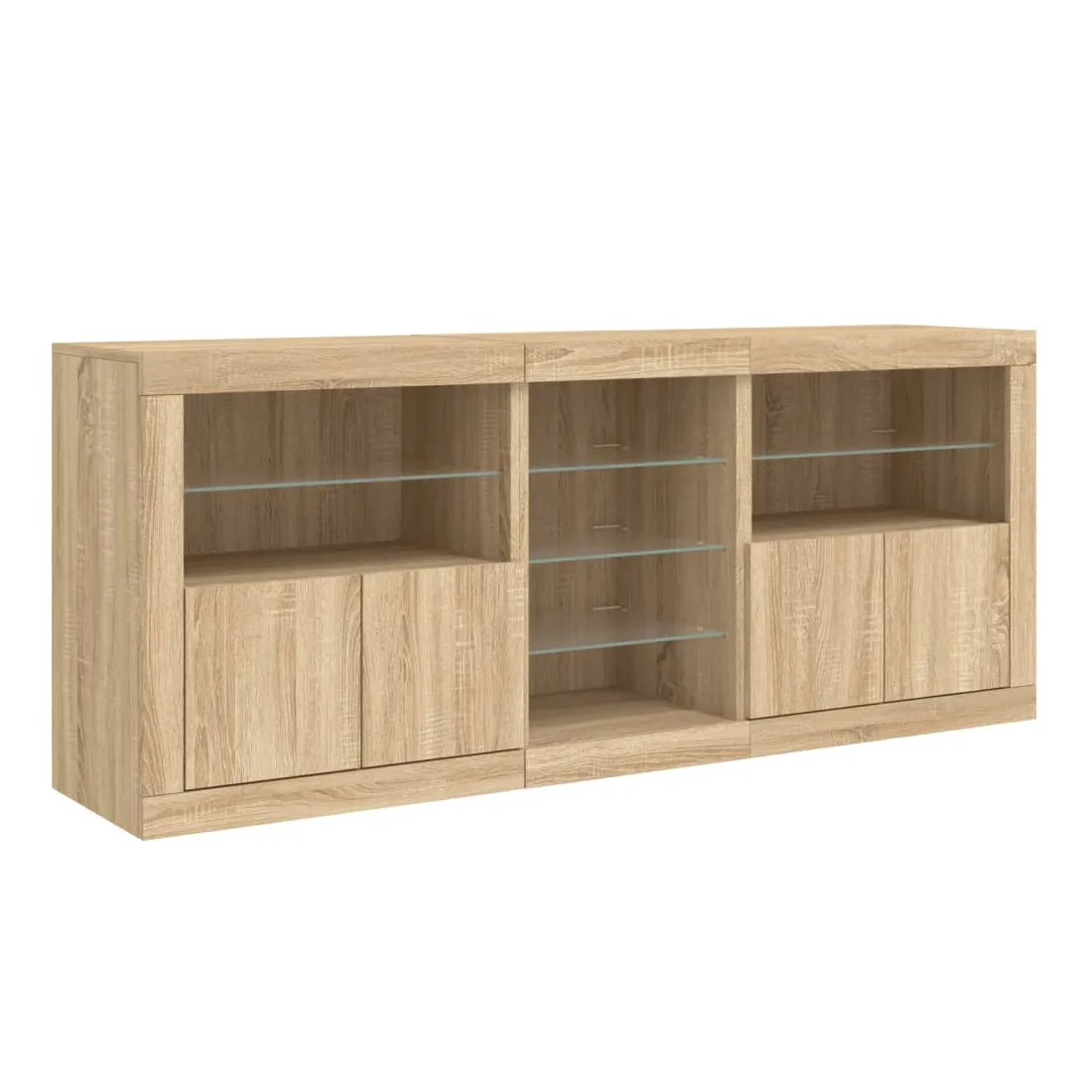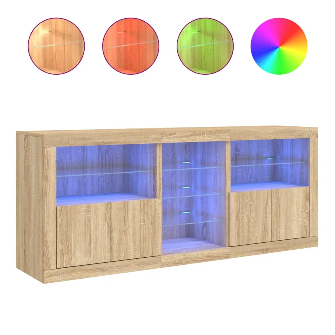 Décorez votre pièce avec ce buffet moderne avec éclairage LED, il s'harmonise facilement avec les meubles de tout style de votre maison. Matériau durable : le bois d'ingénierie est d'une qualité exceptionnelle avec une surface lisse et présente également résistance, stabilité et résistance à l'humidité.Lumières LED RVB : le buffet est équipé de lumières LED RVB vibrantes. Avec divers menus personnalisables, vous pouvez changer sans effort la couleur des lumières et même les régler automatiquement. Ces lumières LED renforcent non seulement l'aspect contemporain du buffet, mais aussi son attrait pour la mode.Grand espace de rangement : l'armoire de rangement offre beaucoup d'espace pour garder vos objets du quotidien bien rangés et facilement accessibles.Fonction d'exposition : la partie supérieure robuste de l'armoire d'entrée est idéale pour exposer des objets décoratifs, des cadres photo ou des plantes en pot.Porte pratiques : gardez vos essentiels à l'abri de la poussière en les cachant derrière les portes de l'armoire latérale. Bon à savoir :Ce produit est doté d'un connecteur USB qui nécessite une source d'alimentation USB de 5V certifiée (non incluse). Attention :Pour éviter qu'il ne soit renversé, ce produit doit être utilisé avec le dispositif de fixation au mur fourni.