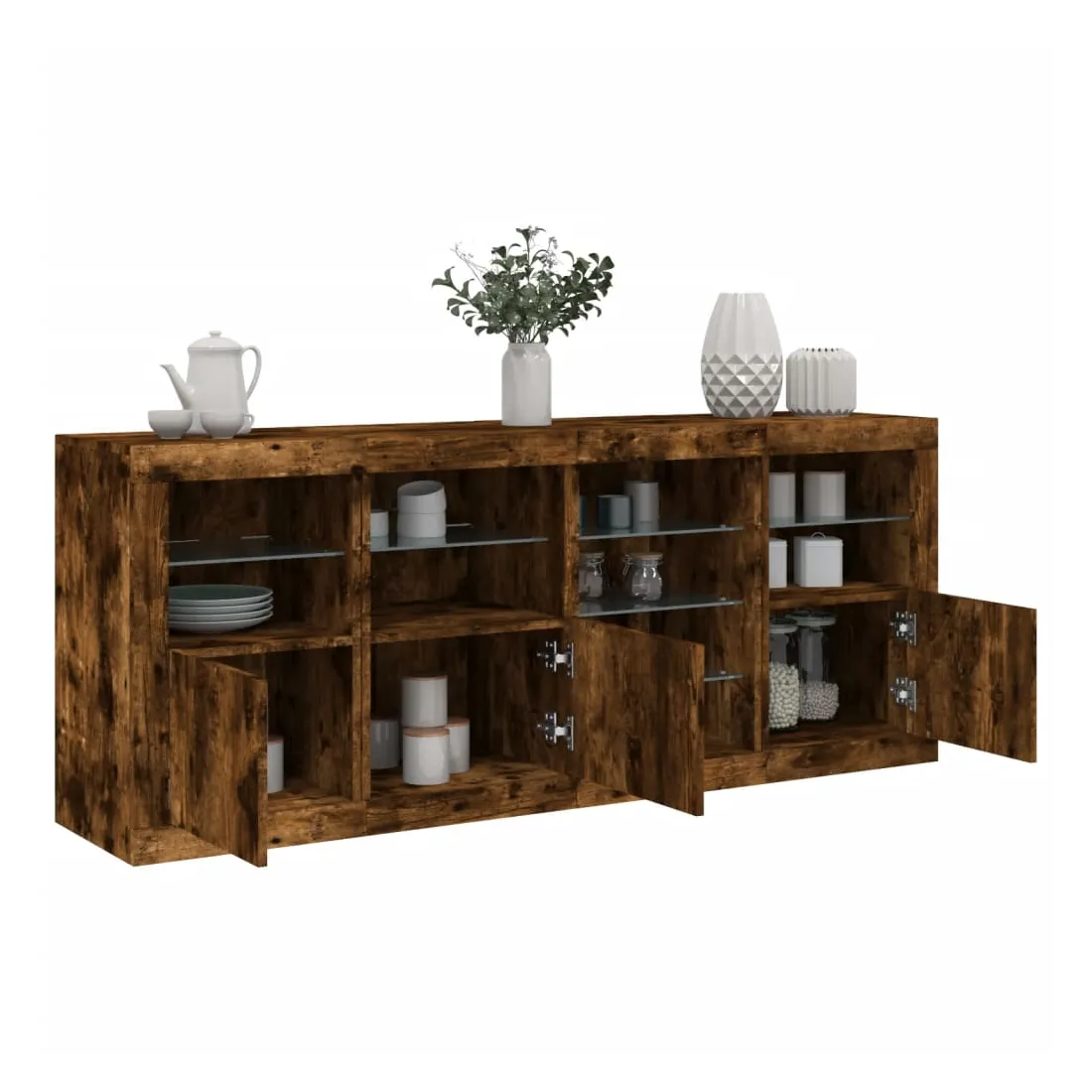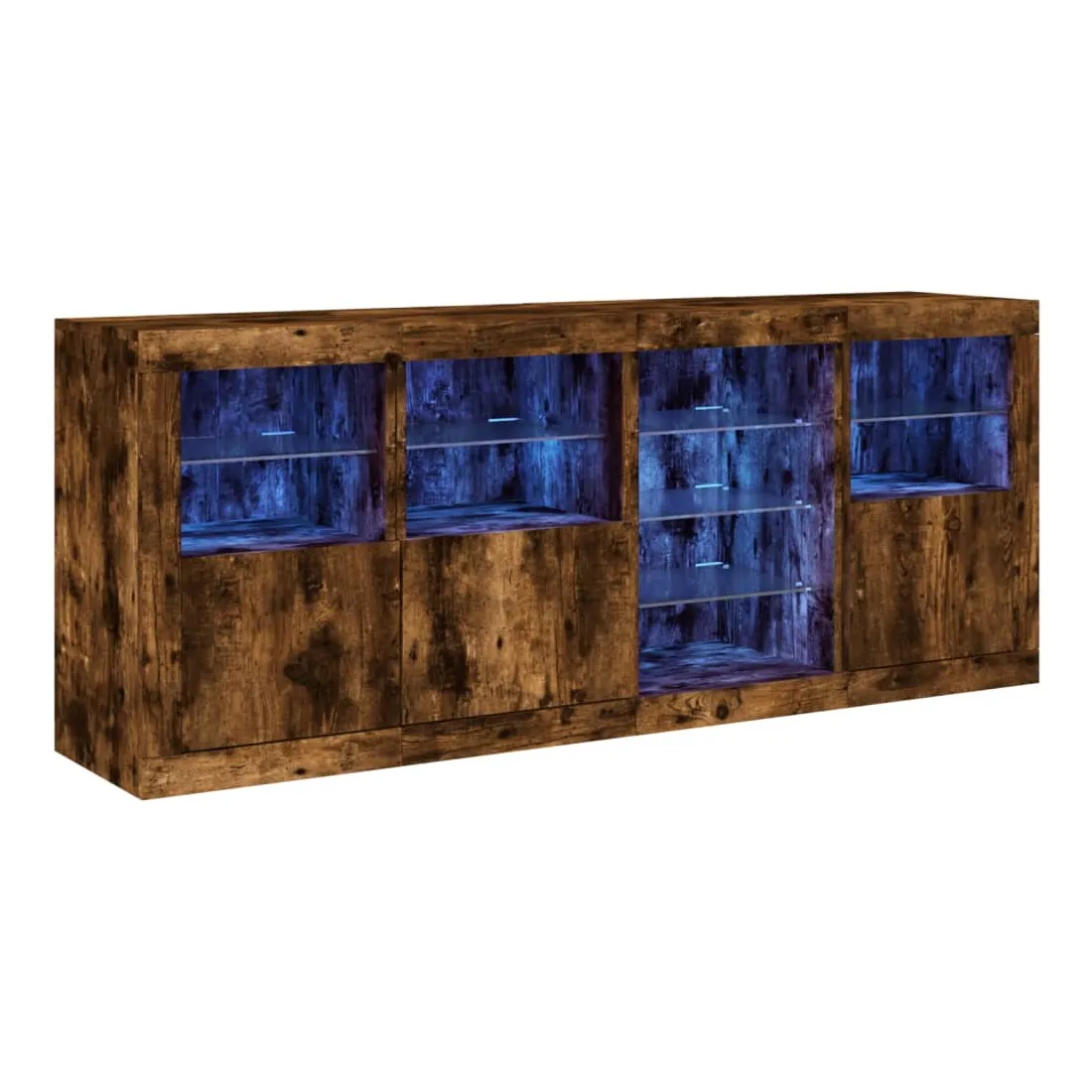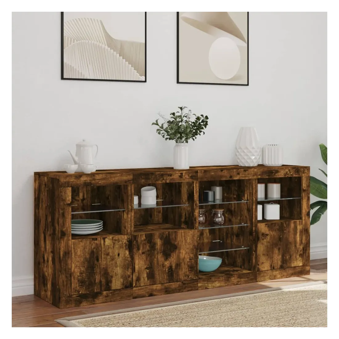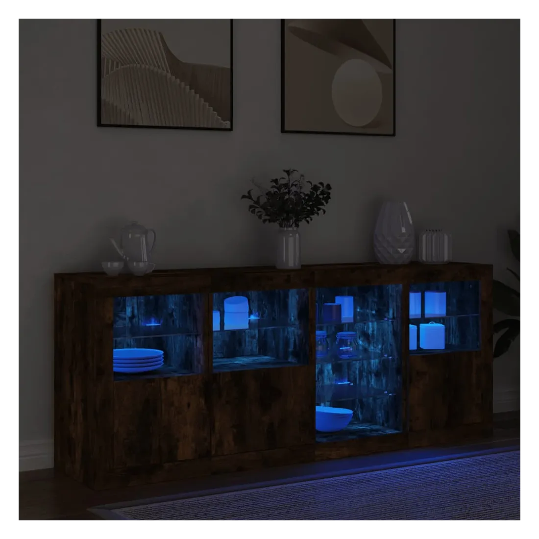 Décorez votre pièce avec ce buffet moderne avec éclairage LED, il s'harmonise facilement avec les meubles de tout style de votre maison. Matériau durable : le bois d'ingénierie est d'une qualité exceptionnelle avec une surface lisse et présente également résistance, stabilité et résistance à l'humidité.Lumières LED RVB : le buffet est équipé de lumières LED RVB vibrantes. Avec divers menus personnalisables, vous pouvez changer sans effort la couleur des lumières et même les régler automatiquement. Ces lumières LED renforcent non seulement l'aspect contemporain du buffet, mais aussi son attrait pour la mode.Grand espace de rangement : l'armoire de rangement offre beaucoup d'espace pour garder vos objets du quotidien bien rangés et facilement accessibles.Fonction d'exposition : la partie supérieure robuste de l'armoire d'entrée est idéale pour exposer des objets décoratifs, des cadres photo ou des plantes en pot.Porte pratiques : gardez vos essentiels à l'abri de la poussière en les cachant derrière les portes de l'armoire latérale. Bon à savoir :Ce produit est doté d'un connecteur USB qui nécessite une source d'alimentation USB de 5V certifiée (non incluse). Attention :Pour éviter qu'il ne soit renversé, ce produit doit être utilisé avec le dispositif de fixation au mur fourni.