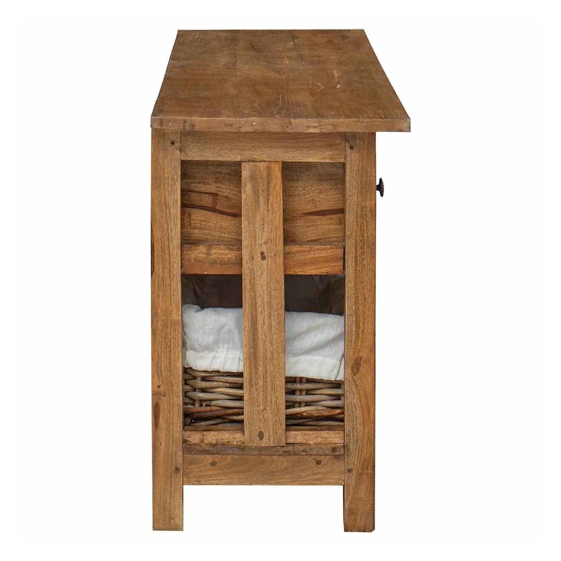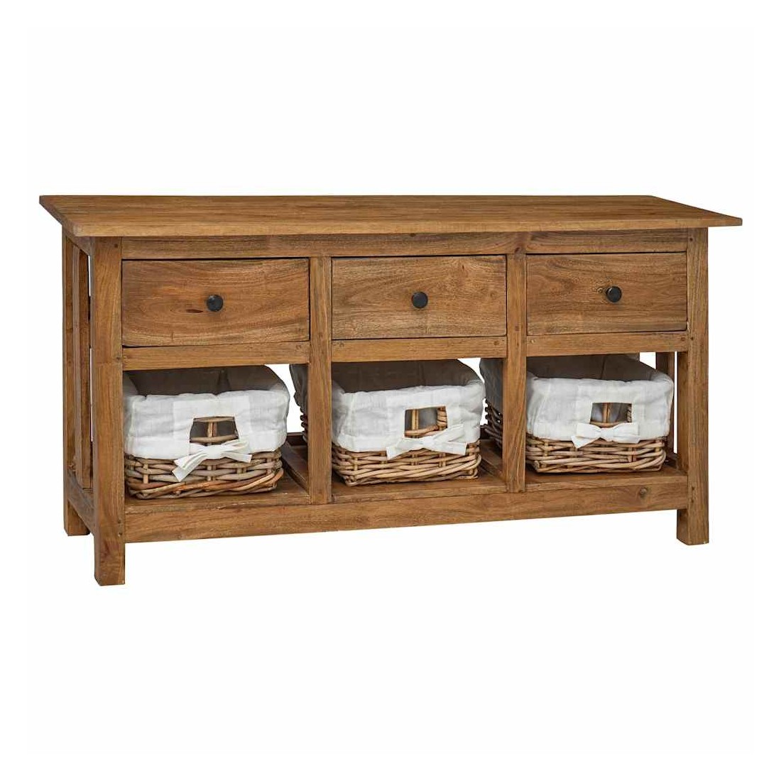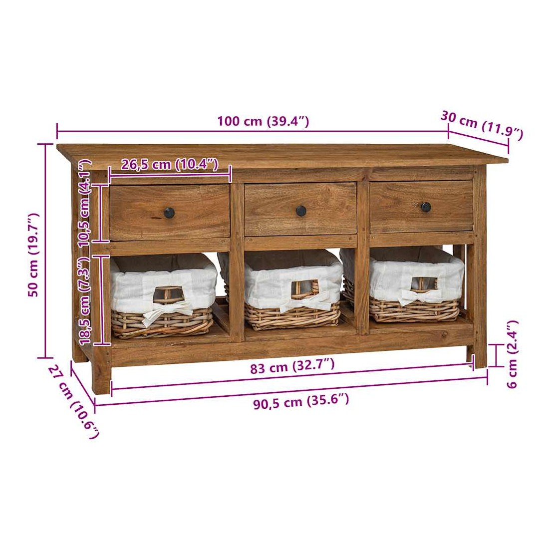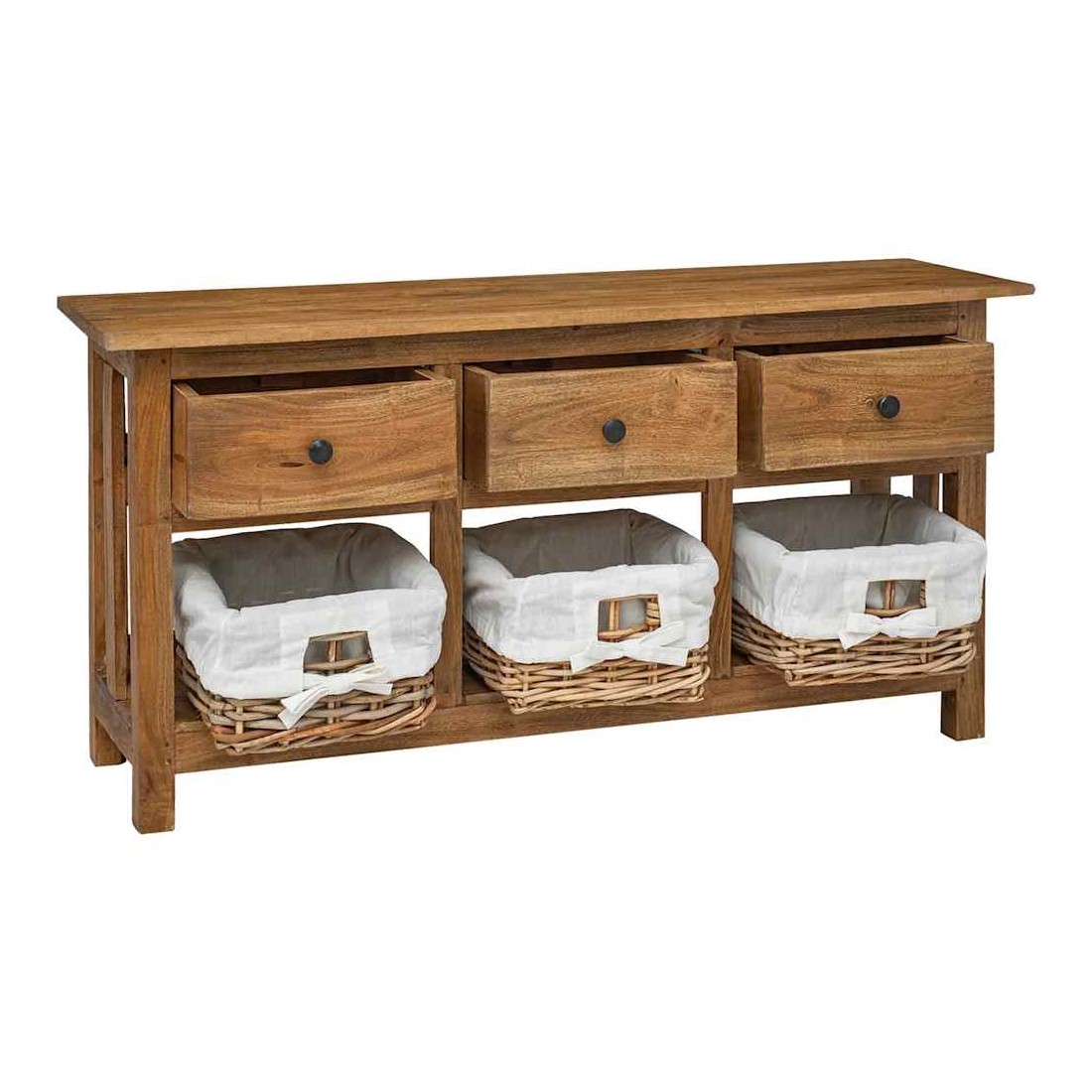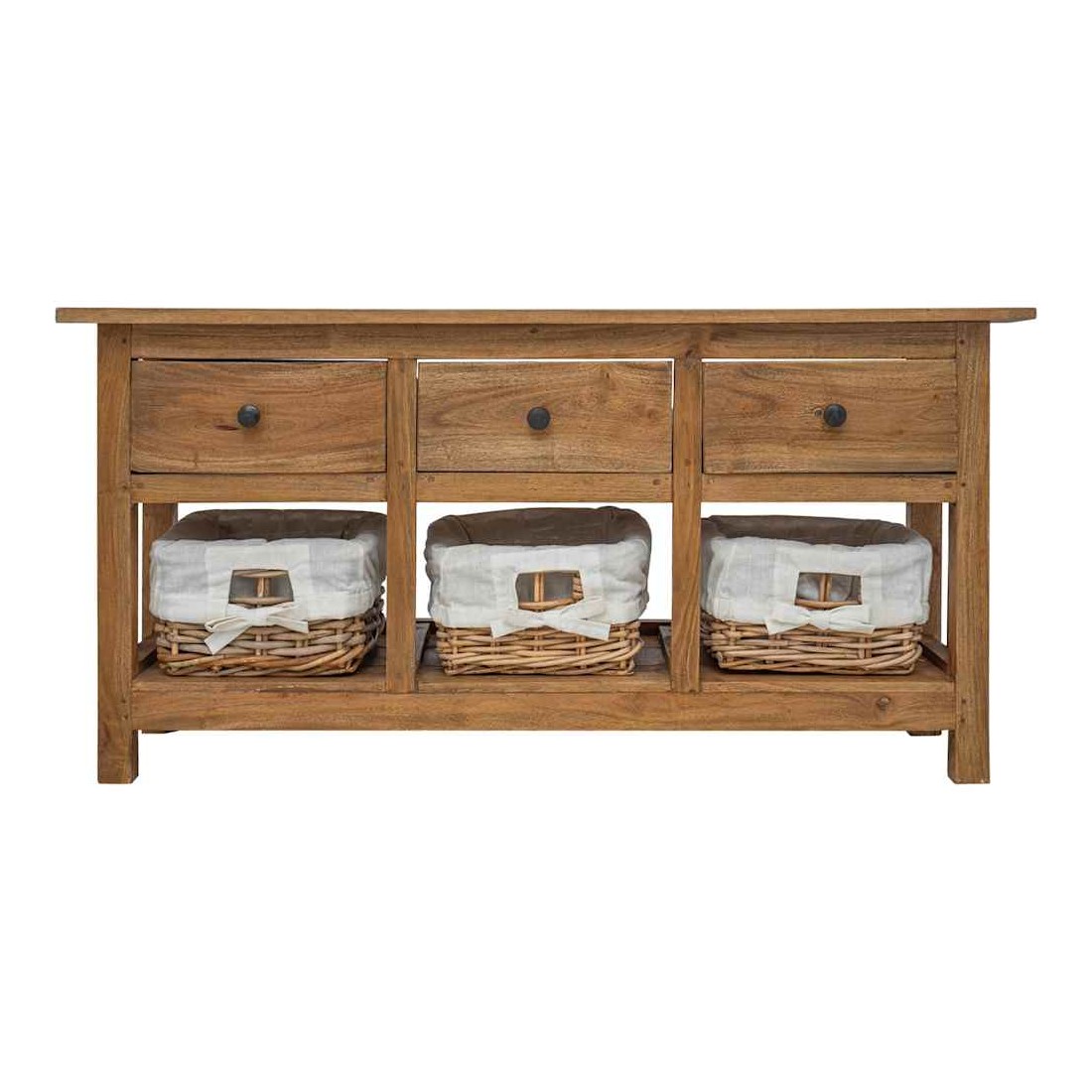Ce buffet ajoutera une touche de charme rustique à votre décor. Il est fait de bois de récupération massif, et les signes d'usure donnent à chaque pièce un look unique et s'ajoutent à son style vintage spectaculaire. Il dispose de 3 tiroirs et de 3 paniers amovibles en rotin. Robuste et stable : fabriquée en bois d'acajou massif, ce buffet en bois massif est extrêmement durable et robuste. L'acajou est un bois dur tropical qui se distingue par sa beauté, sa durabilité et sa couleur. Un savoir-faire spécial a été utilisé pour donner à cet article un aspect vintage, chaleureux et authentique.Grand espace de rangement : la commode dispose de 3 tiroirs et de 3 paniers en rotin amovibles avec un grand espace de rangement. Les paniers amovibles sont non seulement pratiques mais ajoutent également une touche décorative.Fonction d'affichage : le dessus robuste est idéal pour exposer des cadres photo, des vases, des paniers de fruits ou d'autres objets décoratifs.Nombreuses applications : ce buffet peut également être utilisé comme meuble HiFi, meuble TV, table basse, etc.Style vintage : chaque pièce du meuble est unique et légèrement différente de l'autre. Signes d'usure donnent à chaque pièce un look unique et s'ajoutent à son style vintage spectaculaire. Remarque :Les couleurs peuvent varier d'une pièce à l'autre, rendant chaque pièce unique et légèrement différente l'une de l'autre. La livraison est aléatoire, ce qui garantit l'exclusivité et l'individualité de votre produit.