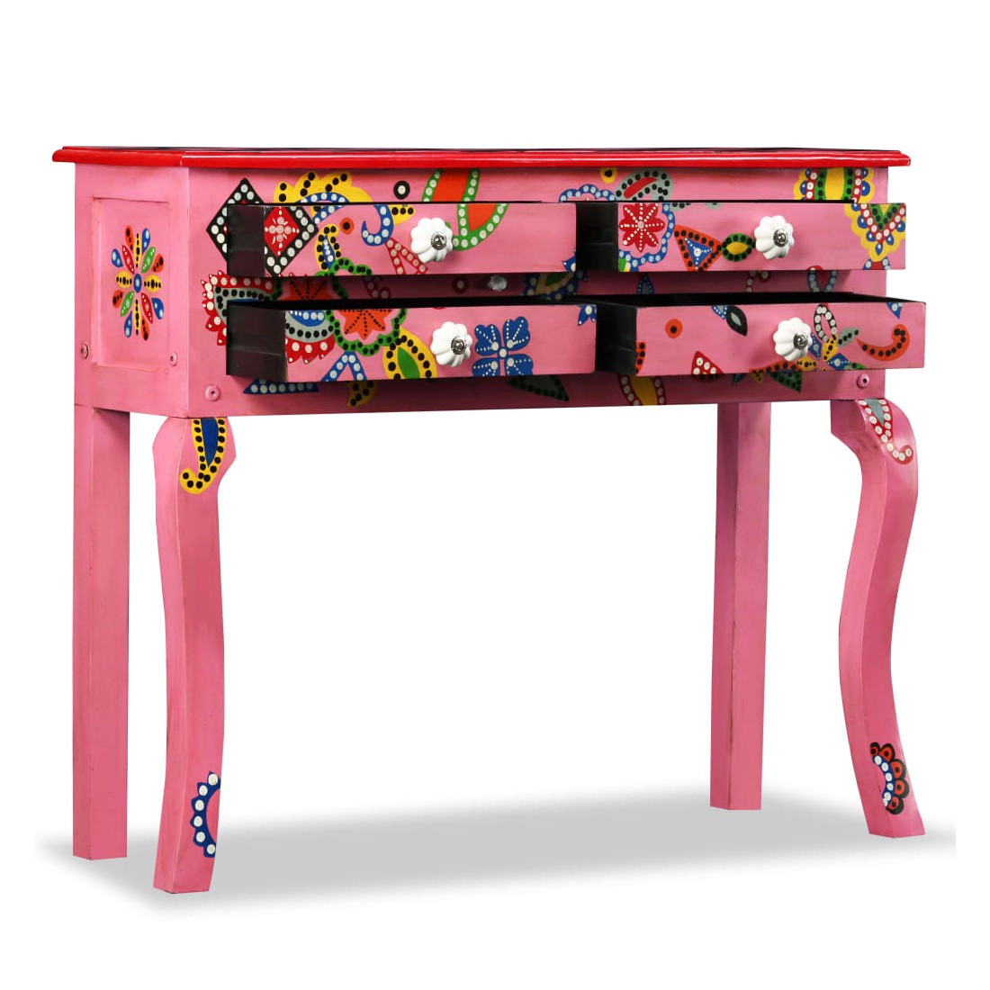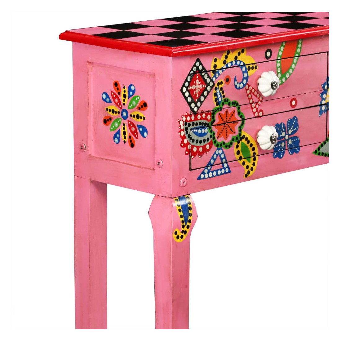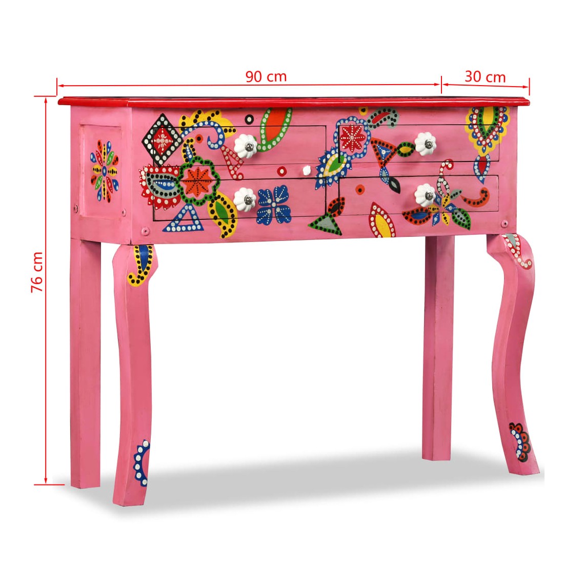 Cette table console unique et magnifique ajoutera une touche de couleur et sera un accessoire attrayant dans votre salon ou chambre à coucher. Avec son design saisissant, cette table console peinte à la main sera un véritable sujet de conversation lorsque vous inviterez des amis. La table est faite à la main en bois de manguier qui est à la fois durable et beau et l'artisanat s'ajoute à son spectaculaire style rétro. La table présente de riches détails décoratifs peints à la main qui exhalent une touche d'élégance et soulignent l'aspect raffiné. Les boutons distinctifs facilitent l'ouverture des tiroirs et rehaussent le style de la table. La table console a 4 tiroirs et offre suffisamment d'espace pour ranger vos objets essentiels. Le dessus coloré est idéal pour exposer des objets décoratifs, comme des vases, des albums photos, des paniers de fruits, etc. L'assemblage est facile.