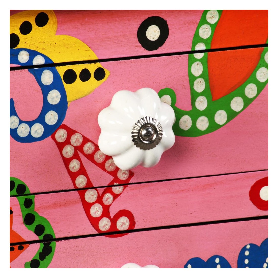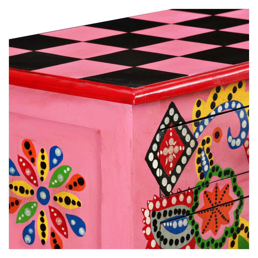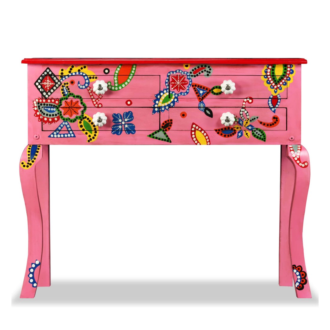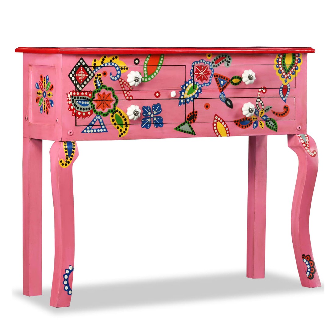 Cette table console unique et magnifique ajoutera une touche de couleur et sera un accessoire attrayant dans votre salon ou chambre à coucher. Avec son design saisissant, cette table console peinte à la main sera un véritable sujet de conversation lorsque vous inviterez des amis. La table est faite à la main en bois de manguier qui est à la fois durable et beau et l'artisanat s'ajoute à son spectaculaire style rétro. La table présente de riches détails décoratifs peints à la main qui exhalent une touche d'élégance et soulignent l'aspect raffiné. Les boutons distinctifs facilitent l'ouverture des tiroirs et rehaussent le style de la table. La table console a 4 tiroirs et offre suffisamment d'espace pour ranger vos objets essentiels. Le dessus coloré est idéal pour exposer des objets décoratifs, comme des vases, des albums photos, des paniers de fruits, etc. L'assemblage est facile.