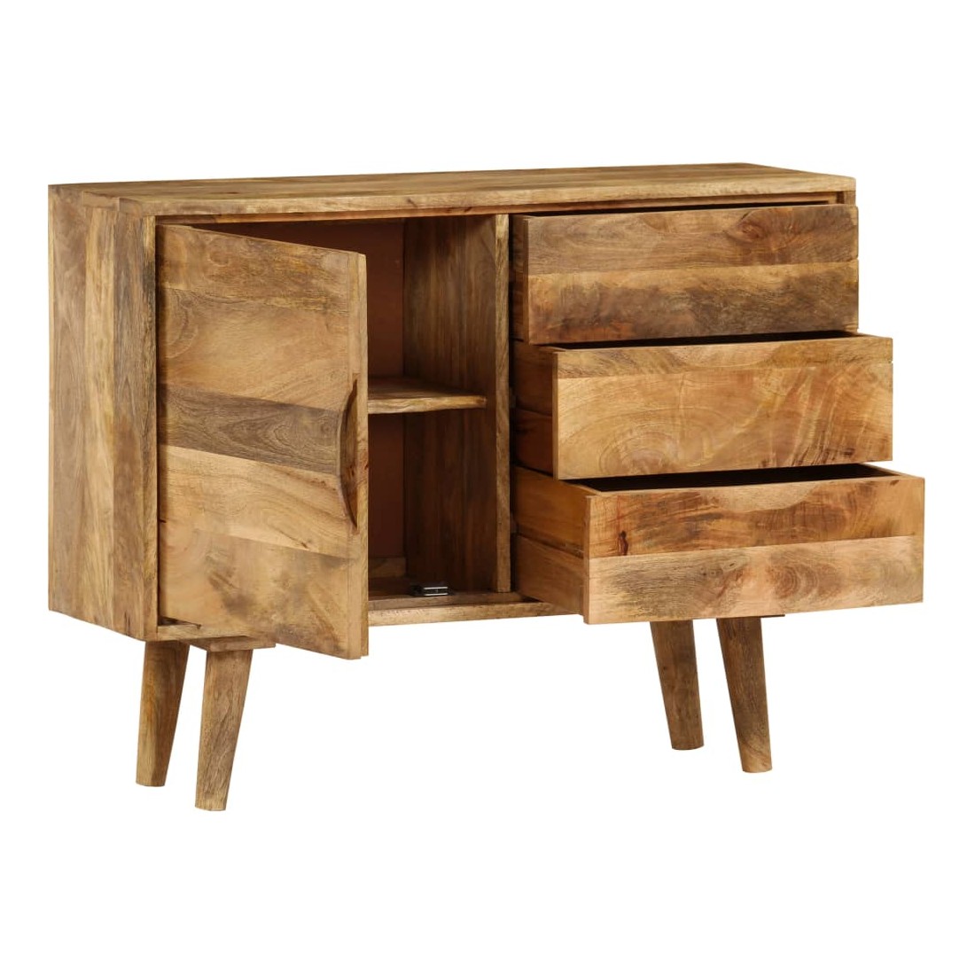 Notre buffet fonctionnel en bois dégage un charme rétro et sera un supplément distinctif à votre maison. Le meuble est fait à la main en bois de manguier qui est solide, stable, durable et magnifique et la qualité de l'artisanat s'ajoute à son style rétro spectaculaire. Chaque étape du processus est réalisée avec le plus grand soin, que ce soit le polissage, la peinture ou le laquage. La qualité de l'artisanat et les beaux grains de bois rendent chaque meuble unique et légèrement différent l'un de l'autre. Conçu avec un grand espace de rangement, le buffet garde vos magazines, livres, DVD et appareils multimédias bien organisés et à portée de main. Remarque importante : les couleurs varient d'une pièce à l'autre, ce qui rend chacun de nos buffets unique. La livraison est aléatoire, ce qui garantit l'exclusivité et l'individualité de votre produit.