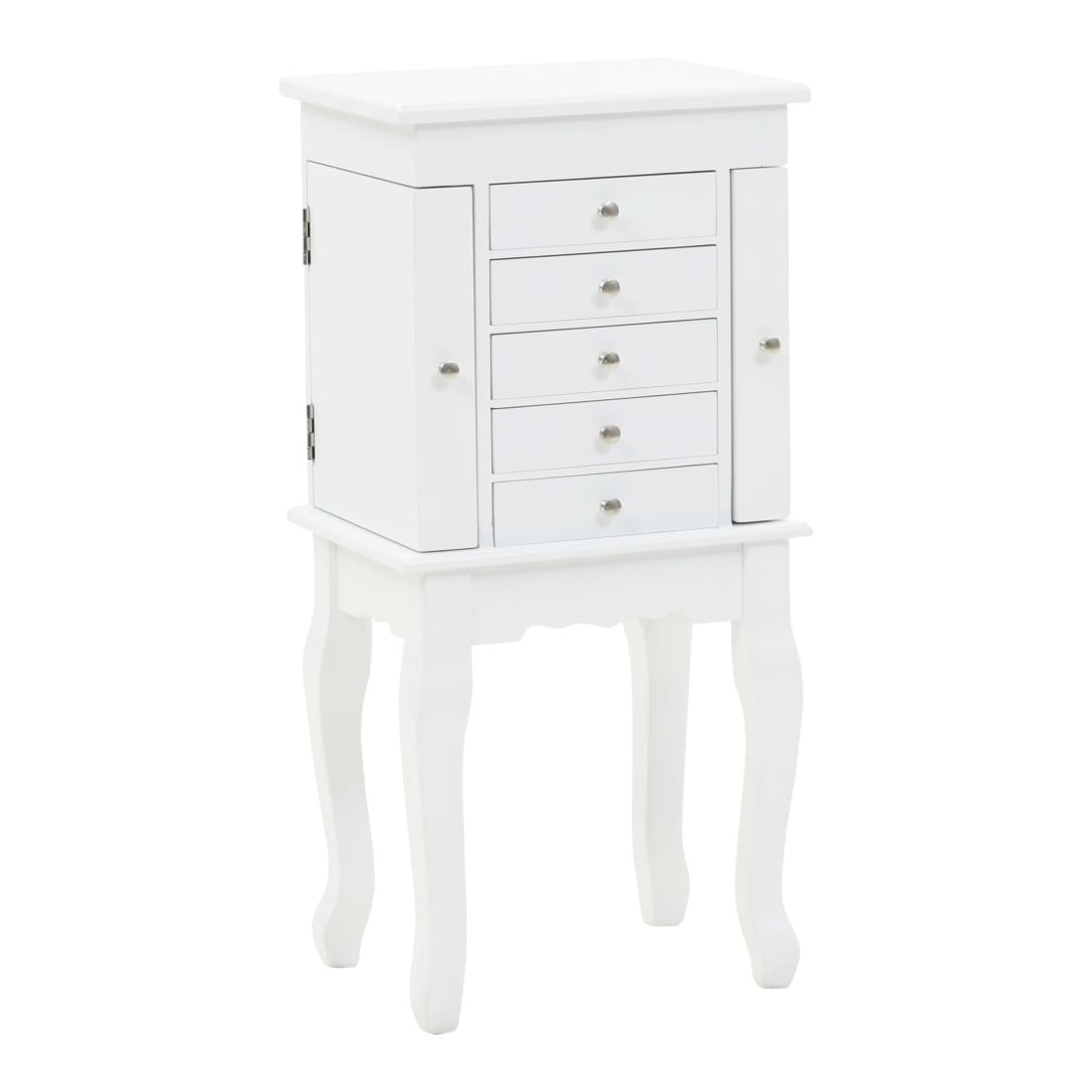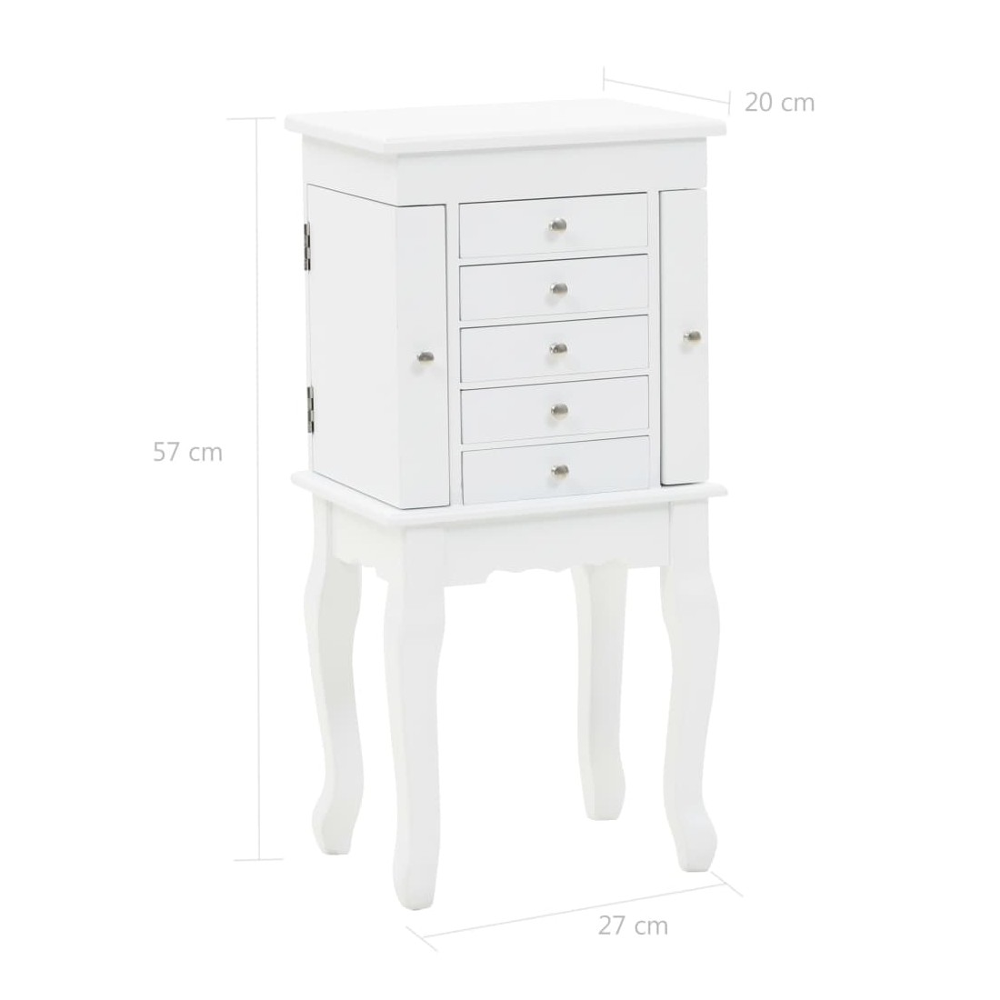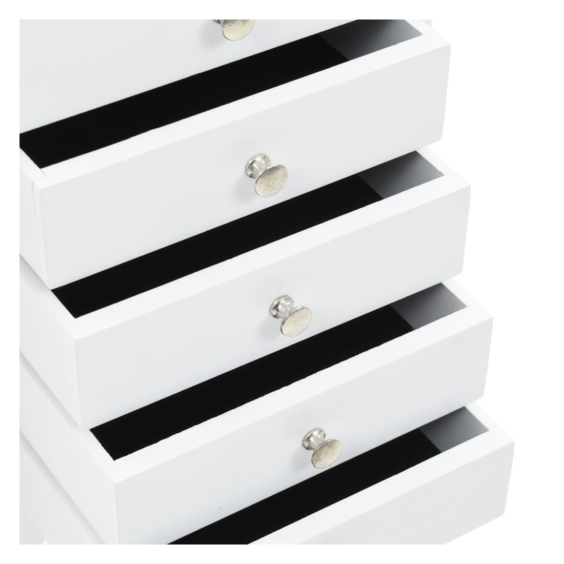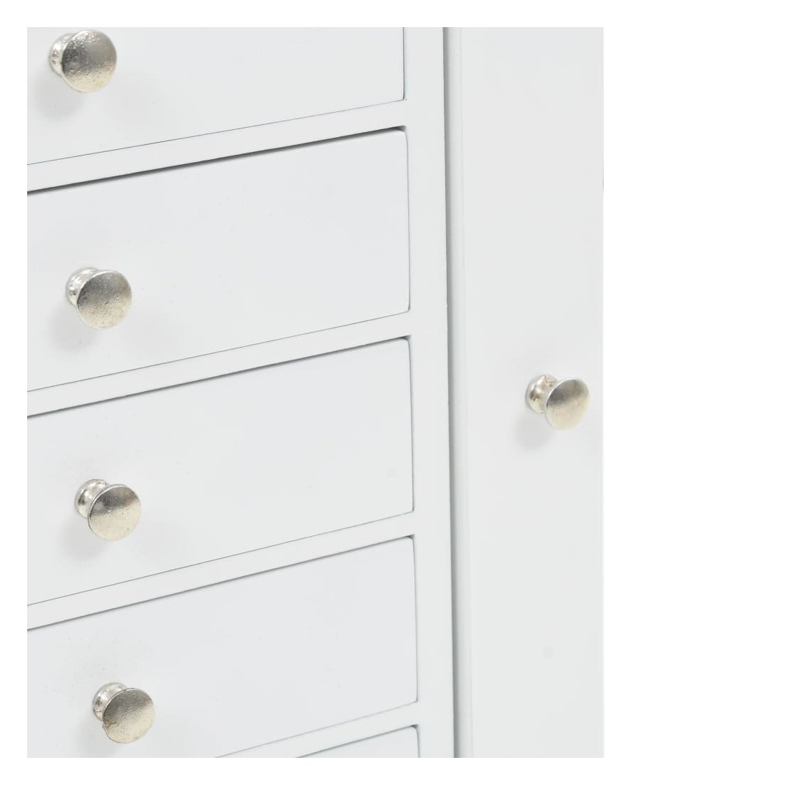 Cette armoire à bijoux sur pieds est idéale pour bien ranger vos boucles d'oreilles, vos colliers, vos bracelets et autres bijoux. Cette superbe armoire à bijoux est fabriquée en panneaux de fibres de densité moyenne (MDF) et ses quatre pieds sont en bois de pin, ce qui la rend robuste et durable. L'armoire est facile à nettoyer et à entretenir. Notre armoire à bijoux est facile à assembler.