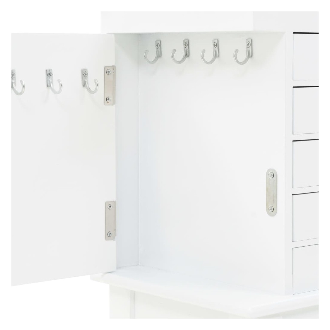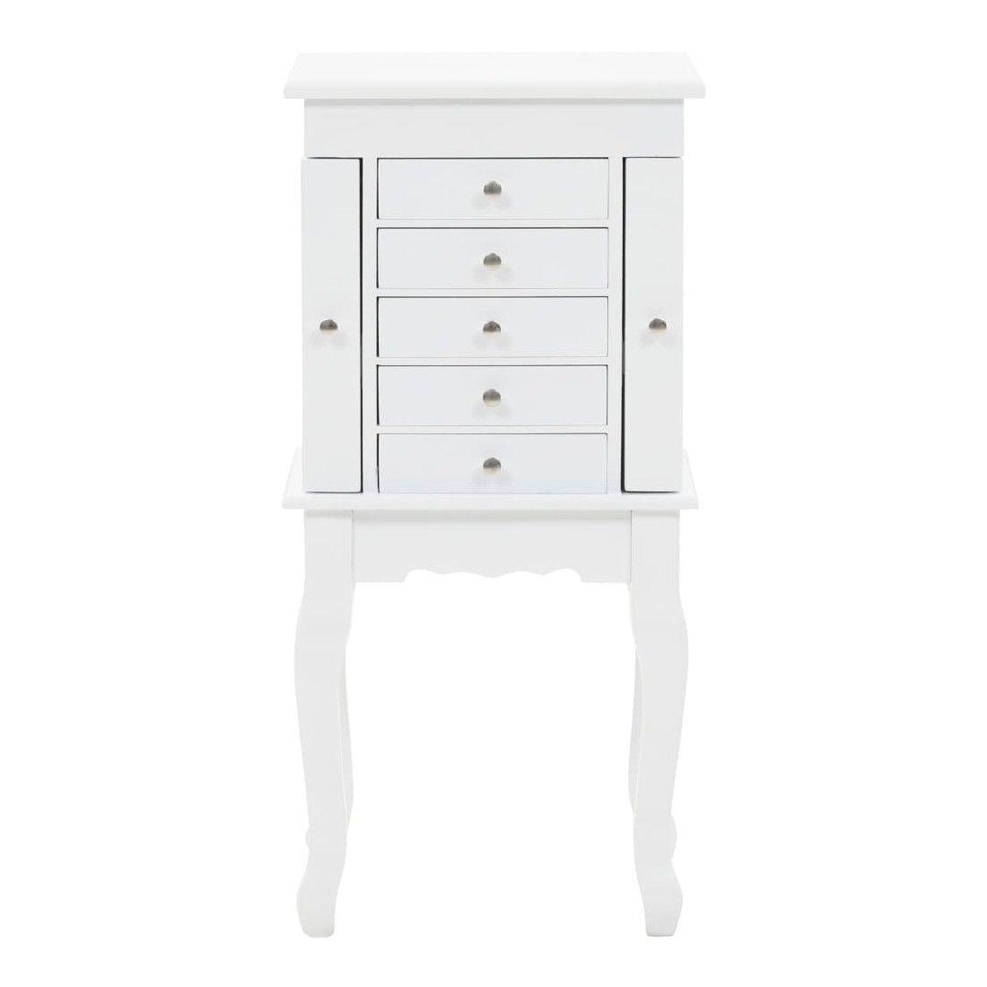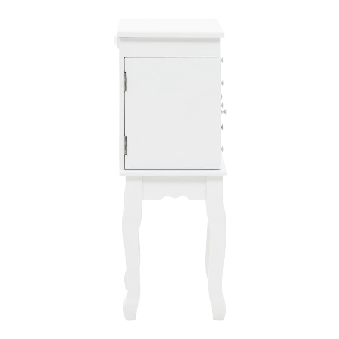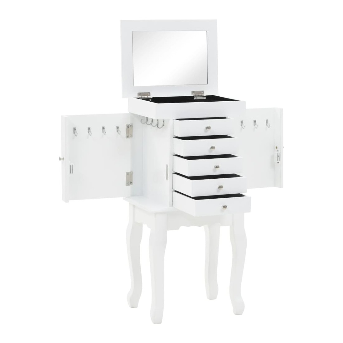 Cette armoire à bijoux sur pieds est idéale pour bien ranger vos boucles d'oreilles, vos colliers, vos bracelets et autres bijoux. Cette superbe armoire à bijoux est fabriquée en panneaux de fibres de densité moyenne (MDF) et ses quatre pieds sont en bois de pin, ce qui la rend robuste et durable. L'armoire est facile à nettoyer et à entretenir. Notre armoire à bijoux est facile à assembler.