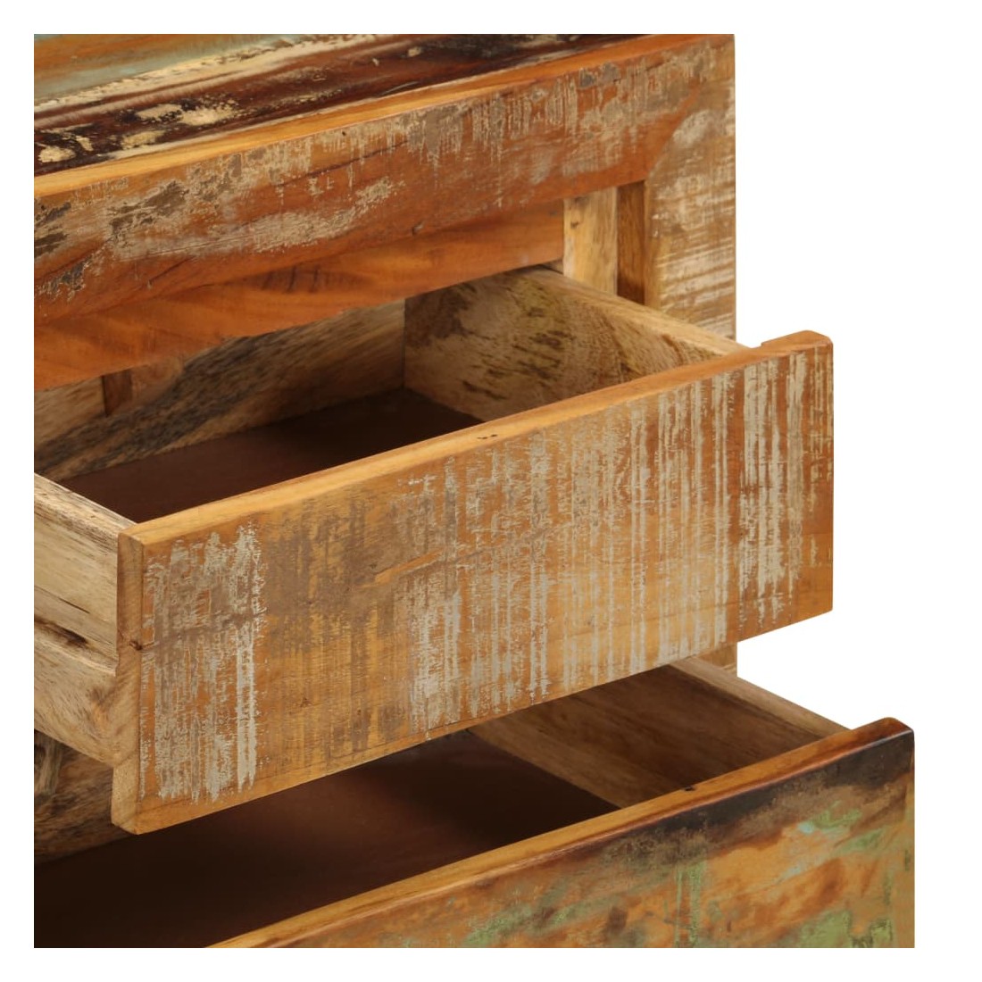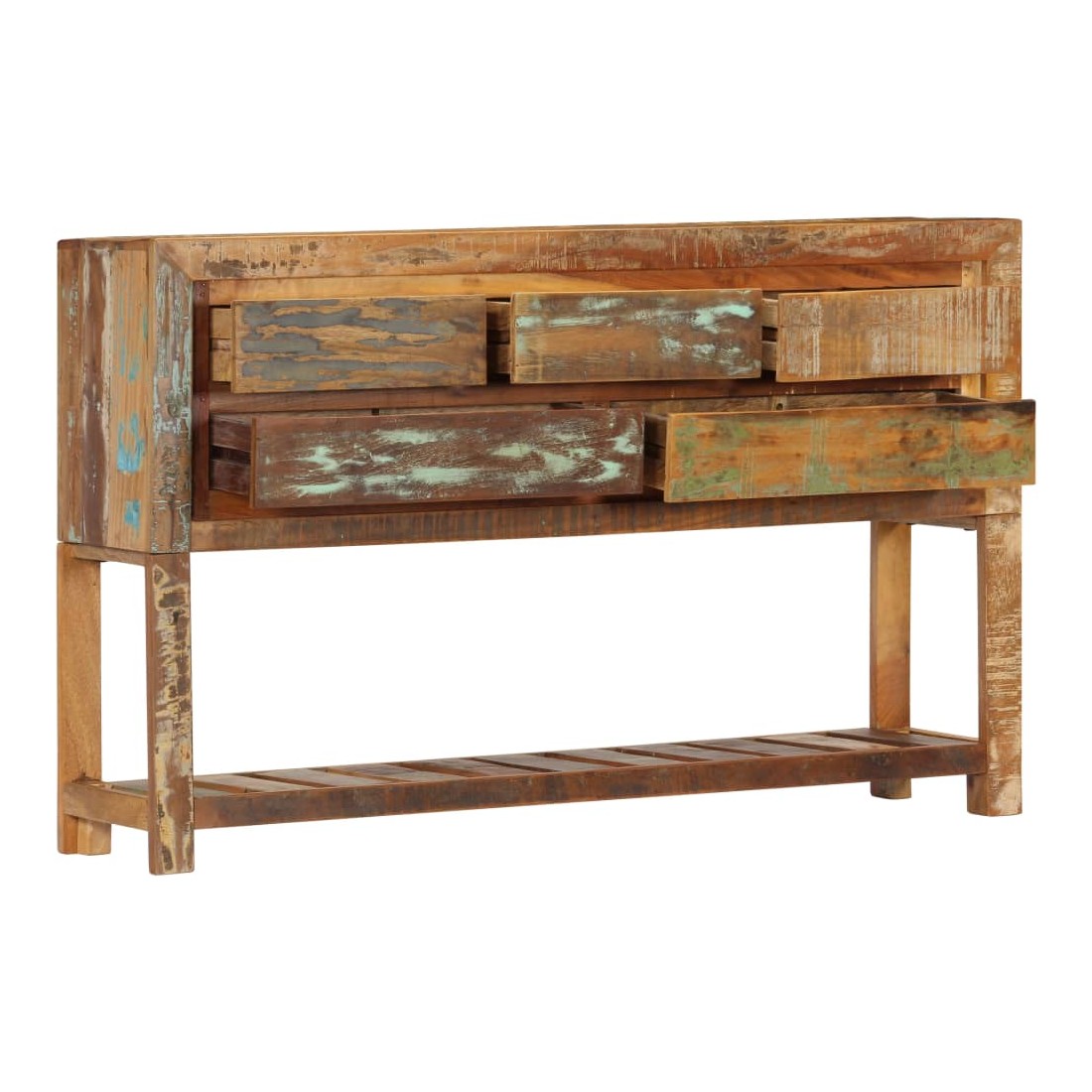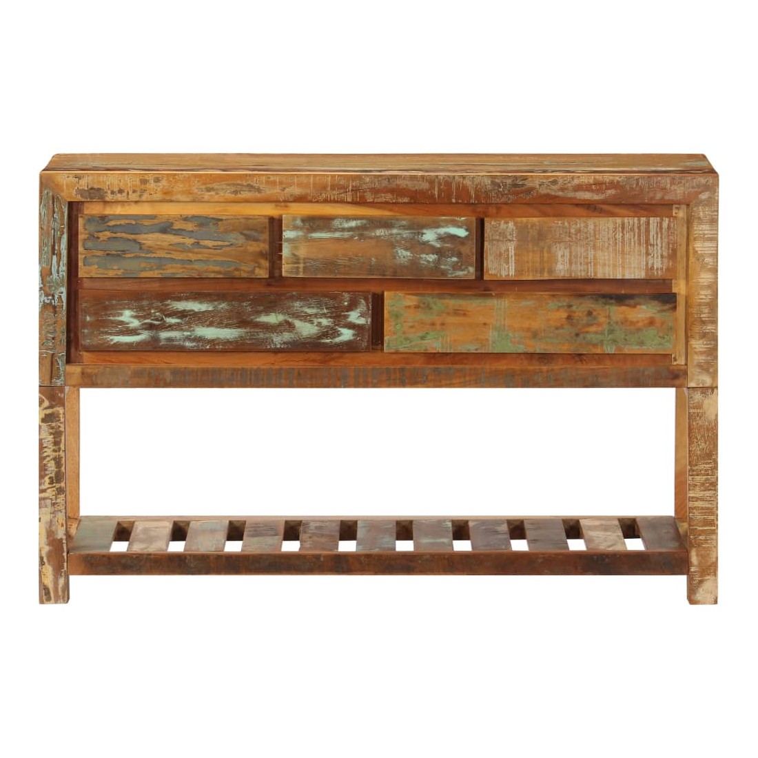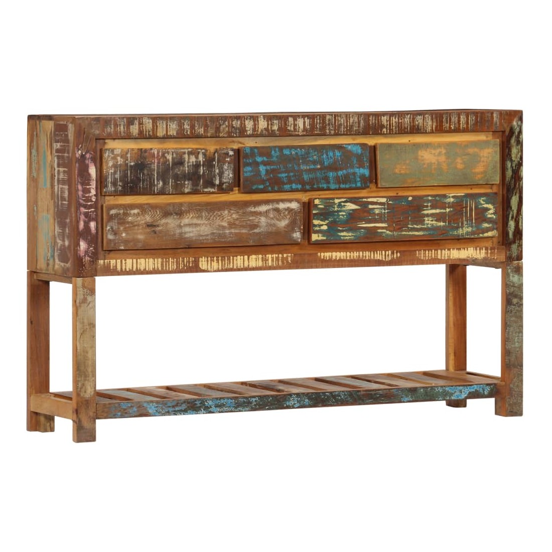 Ce buffet en bois dégage un charme intemporel qui sera un supplément accrocheur à votre décoration intérieure. Cette table console est faite de bois solide de récupération provenant des solives, des planchers et des poutres de soutien des vieux bâtiments démolis. Elle peut comprendre différents types de bois comme le pin, le teck, le hêtre, le chêne, le cèdre, le bois de manguier, l'acacia, etc. Cela signifie que le bois de récupération conserve les caractéristiques de ces différents types de bois. Le bois de récupération est déjà vieilli, érodé et séché, donc il ne rétrécit et ne se plie pas. Le savoir-faire de qualité supérieure et l'élégant grain de bois font de chaque pièce de table d'entrée une pièce distinctive et légèrement différente l'une de l'autre. Cette table d'appoint comprend 5 tiroirs et 1 étagère, offrant un espace de rangement pratique pour vos vêtements, vos livres, ainsi que divers autres articles. Remarque importante : Les couleurs et le grain du bois peuvent varier d'une pièce à l'autre, ce qui rend chaque commode unique. La livraison est aléatoire, ce qui garantit l'exclusivité et l'individualité de votre produit.
