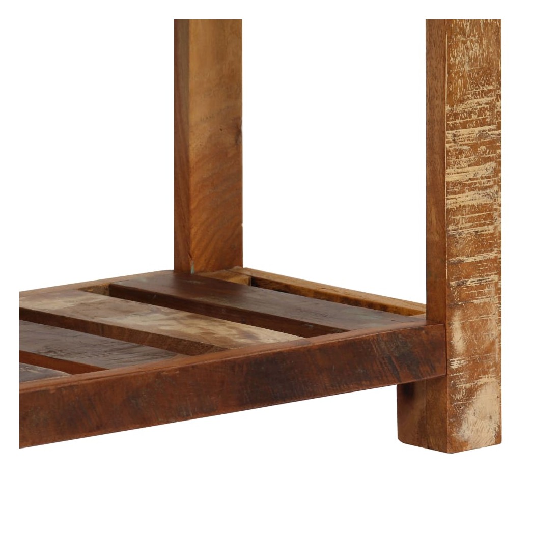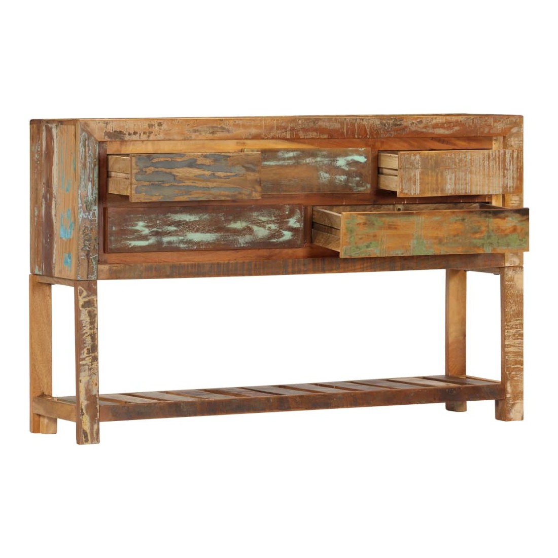 Ce buffet en bois dégage un charme intemporel qui sera un supplément accrocheur à votre décoration intérieure. Cette table console est faite de bois solide de récupération provenant des solives, des planchers et des poutres de soutien des vieux bâtiments démolis. Elle peut comprendre différents types de bois comme le pin, le teck, le hêtre, le chêne, le cèdre, le bois de manguier, l'acacia, etc. Cela signifie que le bois de récupération conserve les caractéristiques de ces différents types de bois. Le bois de récupération est déjà vieilli, érodé et séché, donc il ne rétrécit et ne se plie pas. Le savoir-faire de qualité supérieure et l'élégant grain de bois font de chaque pièce de table d'entrée une pièce distinctive et légèrement différente l'une de l'autre. Cette table d'appoint comp